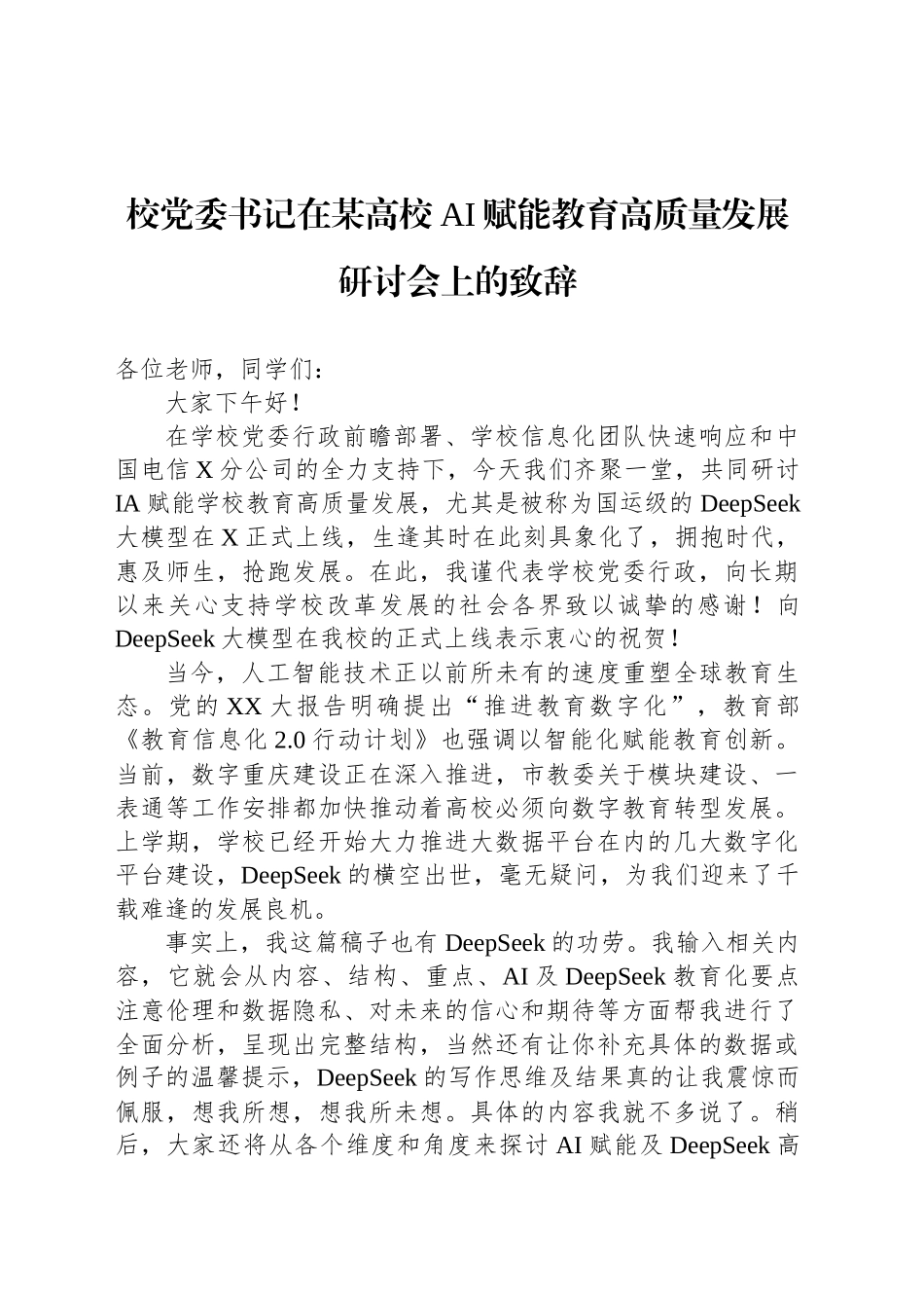 校党委书记在某高校AI赋能教育高质量发展研讨会上的致辞各位老师,同学们:大家下午好!在学校党委行政前瞻部署、学校信息化团队快速响应和中国电信X分公司的全力支持下,今天我们齐聚一堂,共同研讨IA赋能学校教育高质量发展,尤其是被称为国运级的DeepSeek大模型在X正式上线,生逢其时在此刻具象化了,拥抱时代,惠及师生,抢跑发展。在此,我谨代表学校党委行政,向长期以来关心支持学校改革发展的社会各界致以诚挚的感谢!向DeepSeek大模型在我校的正式上线表示衷心的祝贺!当今,人工智能技术正以前所未有的速度重塑全球教育生态。党的XX大报告明确提出“推进教育数字化”,教育部《教育信息化2.0行动计划》也强调以智能化赋能教育创新。当前,数字重庆建设正在深入推进,市教委关于模块建设、一表通等工作安排都加快推动着高校必须向数字教育转型发展。上学期,学校已经开始大力推进大数据平台在内的几大数字化平台建设,DeepSeek的横空出世,毫无疑问,为我们迎来了千载难逢的发展良机。事实上,我这篇稿子也有DeepSeek的功劳。我输入相关内容,它就会从内容、结构、重点、AI及DeepSeek教育化要点注意伦理和数据隐私、对未来的信心和期待等方面帮我进行了全面分析,呈现出完整结构,当然还有让你补充具体的数据或例子的温馨提示,DeepSeek的写作思维及结果真的让我震惊而佩服,想我所想,想我所未想。具体的内容我就不多说了。稍后,大家还将从各个维度和角度来探讨AI赋能及DeepSeek高效运用并赋能学校发展,集思广益,群策群力,我们将充分吸收有益的意见和建议,全面转化为学校的决策战略,切实服务好广大师生。各位同仁,教育是面向未来的事业,AI与教育的融合没有终点,只有连续不断的新起点。将来,打败人的不是ai,而是会用ai的人。我们绝不能完全依赖技术,而是要高效利用技术,成倍提升自己的能力和工作效能。期待今日的研讨碰撞出智慧火花,为学校高质量发展注入强劲动能,汇聚起推进学校改革发展的磅礴力量。最后,预祝本次研讨会圆满成功!让DeepSeek大模型在我校落地生根、结出硕果!谢谢大家!公文范文文库网站①【公文堂】:www.gongwentang.com公文范文文库网站②【公文堂】:www.gongwentang.com请各位用户务必收藏好以上两个网站,收藏好网址,终身可访问或下载全站公文范文客服微信:gongwentangkf微信公众号:【公文堂】