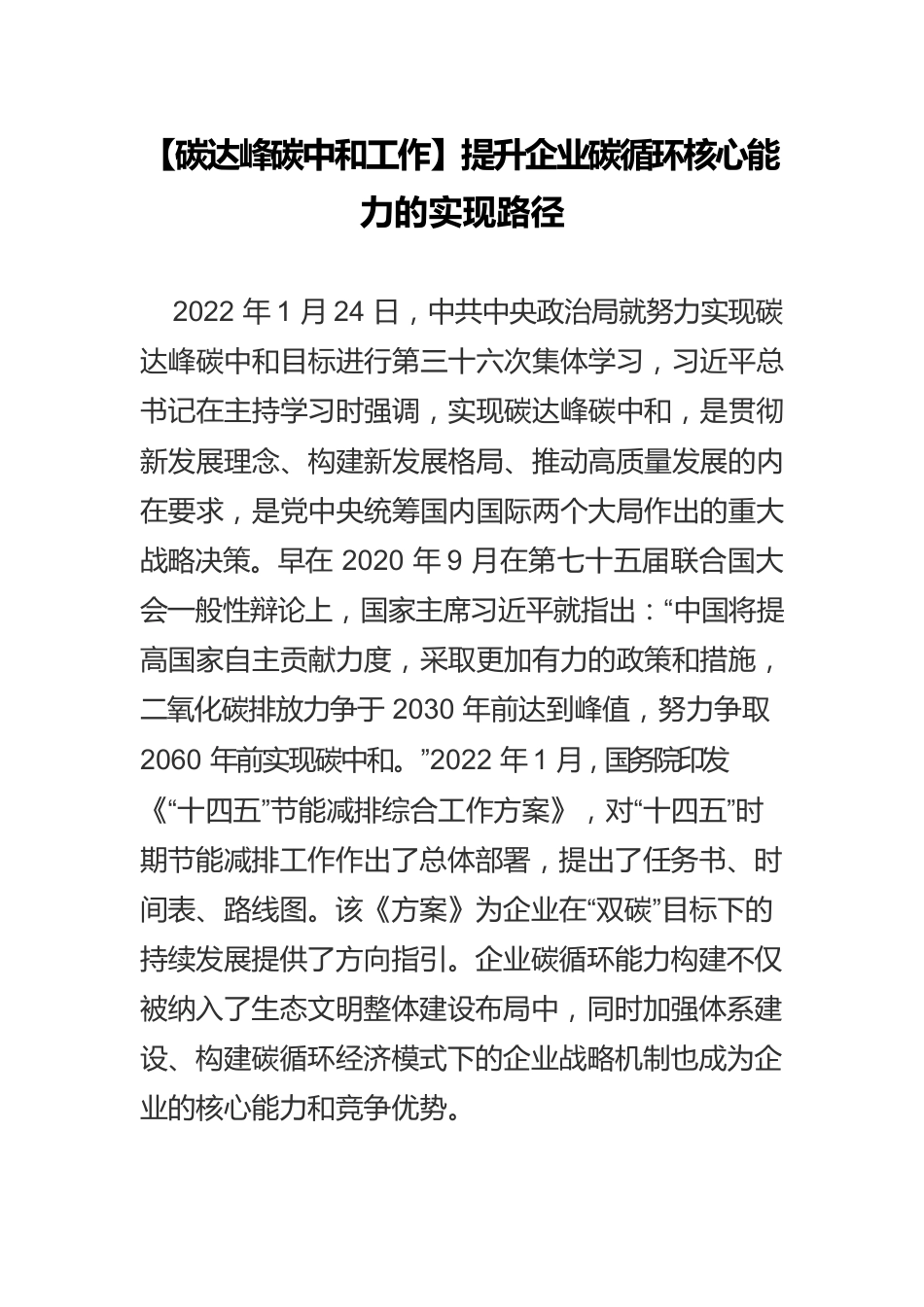 【碳达峰碳中和工作】提升企业碳循环核心能力的实现路径2022年1月24日,中共中央政治局就努力实现碳达峰碳中和目标进行第三十六次集体学习,习近平总书记在主持学习时强调,实现碳达峰碳中和,是贯彻新发展理念、构建新发展格局、推动高质量发展的内在要求,是党中央统筹国内国际两个大局作出的重大战略决策。早在2020年9月在第七十五届联合国大会一般性辩论上,国家主席习近平就指出:“中国将提高国家自主贡献力度,采取更加有力的政策和措施,二氧化碳排放力争于2030年前达到峰值,努力争取2060年前实现碳中和。”2022年1月,国务院印发《“十四五”节能减排综合工作方案》,对“十四五”时期节能减排工作作出了总体部署,提出了任务书、时间表、路线图。该《方案》为企业在“双碳”目标下的持续发展提供了方向指引。企业碳循环能力构建不仅被纳入了生态文明整体建设布局中,同时加强体系建设、构建碳循环经济模式下的企业战略机制也成为企业的核心能力和竞争优势。第一,认知方面存在偏差。“双碳”目标、“3060”时间表对企业形成了一定的宏观约束和明确导向,但由于缺乏目标建设机制以及在企业各个层级不能形成较为明确的量化目标,导致企业在生产、营销、服务以及战略转型方面,对碳循环经济发展模式的认识存在偏差。企业碳减排部门虽然拥有“双碳”的专业人才,但因不具备整体认知环境,碳减排目标的量化在企业层面得不到有效普及,在认知方面也缺乏科学引导。第二,培养手段难以起到科学调节碳排放的作用。碳循环经济是在宏观经济影响下对企业微观环境的多向调节,由于地方政府对企业碳减排没有硬性要求,从而在制度规范上无法达到最优效果,政策落地也仅是满足了政策要求,尚未对企业的管理制度和目标激励机制形成有效影响。由于培养手段难以起到科学的调节作用,因此也导致企业在碳循环核心能力层面,不能实现有效的目标管理。第三,培养机制与企业战略协同效应不明显。在传统培养层面上,企业较为注重盈利水平、营销水平和管理绩效等方面的提升,培养模式和力度也较为显著,对于制约生产的碳减排,企业目前虽不抵触,但对员工培养往往流于表面,导致碳循环核心能力培养在企业运营中还处于相对较低水平。第四,培养目标方面对循环能力提升培养不够重视和主动。由于企业在“双碳”目标培养方面侧重碳减排能力提升,对于“双碳”目标战略下循环能力提升培养不够重视和主动,仅从认知方面、框架构建方面、策略的适当性方面做了一定的培养。至于技术能力和相应的环境影响等要素,企业的实际能力与“双碳”目标还未能形成有效协同。碳循环经济作为引导企业持续发展的核心理念,“双碳”能力培养与企业核心竞争力培养之间还存在一些不协调的问题。因此,应充分认识提升企业基于碳循环经济下的核心能力的重要性和急迫性,并在当前企业的战略层面做好相应调整。一方面,生态经济主张企业要以环境效益为重,加速产业转型和战略转型,从战略、制度、绩效和管理等多个维度提升持续发展能力。第一,注重生态战略的核心能力培养。生态战略不仅要关注企业生态经济运行能力,更应当在战略层面把握生态经济与企业持续发展能力的多元契合。企业既要把生态理念作为碳循环经济的落脚点,也要将其作为提升核心能力的重中之重,将碳循环核心能力的目标和持续发展目标融为一体。同时,在生态经济影响下,企业核心能力朝节能减碳方向培养,并以其生态发展的战略优势,将生态经济、企业战略以及企业的持续发展能力融会贯通,全面拓宽企业碳循环核心能力的实现路径。第二,注重碳循环目标下的制度规范。由于“双碳”目标涉及宏观政策层面,在实施“双碳”循环模式的背景下,企业要以政策为依托,拓展能力建设,将制度管理和战略目标演变为企业的动态化管理内涵。同时,碳循环经济的核心能力还应将“双碳”目标与市场需求、企业制度、企业管理深度结合。第三,注重提升碳循环下的绩效管理能力。绩效管理作为企业的管理机制,应将碳减排的目标纳入企业绩效评价体系和评价指标中。但是从当前情况看,不少企业绩效管理制度的适应性与当前企业的绩效管理策略还存在一定差距。碳减排是企业核心能力培养...