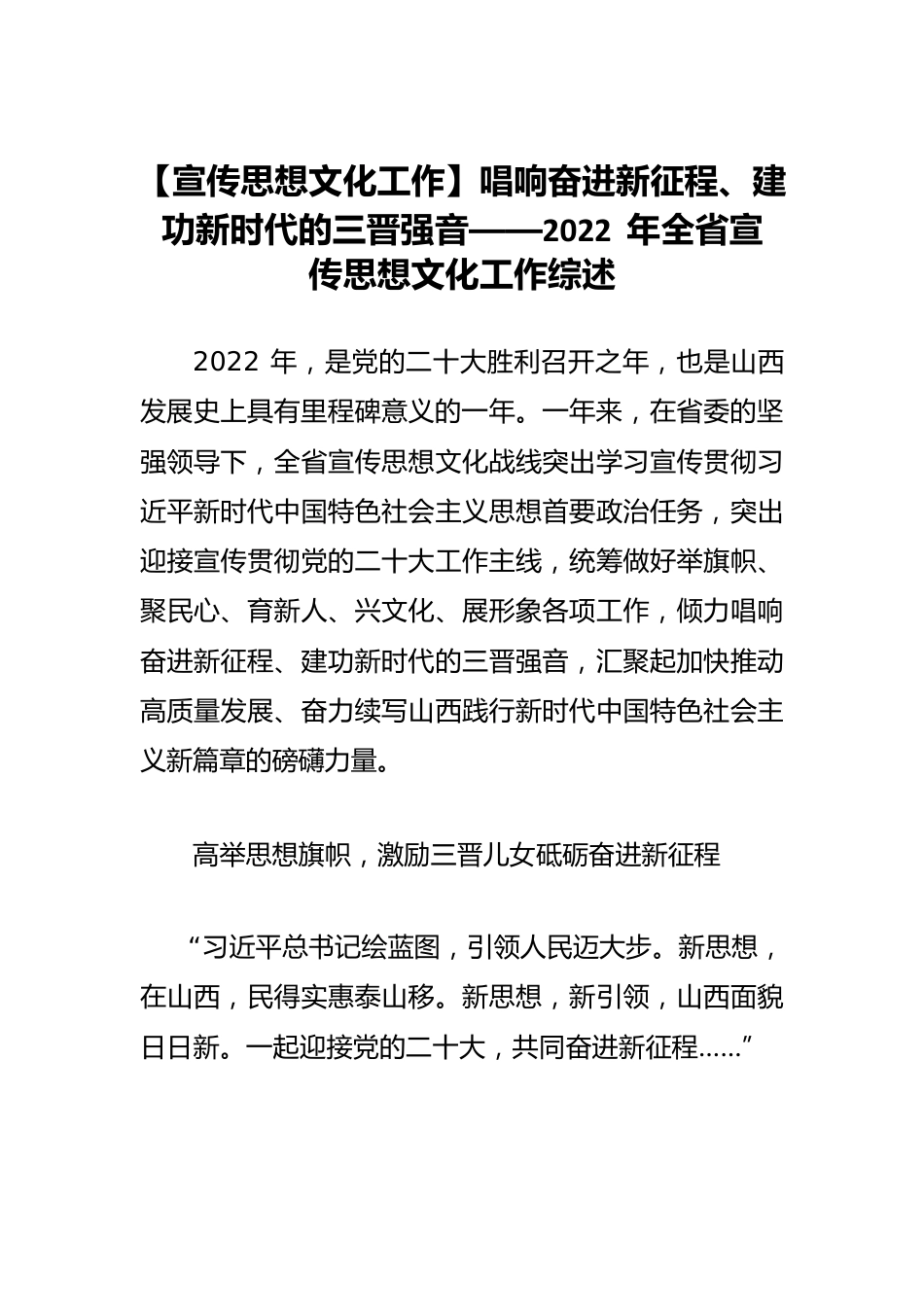 【宣传思想文化工作】唱响奋进新征程、建功新时代的三晋强音——2022年全省宣传思想文化工作综述2022年,是党的二十大胜利召开之年,也是山西发展史上具有里程碑意义的一年。一年来,在省委的坚强领导下,全省宣传思想文化战线突出学习宣传贯彻习近平新时代中国特色社会主义思想首要政治任务,突出迎接宣传贯彻党的二十大工作主线,统筹做好举旗帜、聚民心、育新人、兴文化、展形象各项工作,倾力唱响奋进新征程、建功新时代的三晋强音,汇聚起加快推动高质量发展、奋力续写山西践行新时代中国特色社会主义新篇章的磅礴力量。高举思想旗帜,激励三晋儿女砥砺奋进新征程“习近平总书记绘蓝图,引领人民迈大步。新思想,在山西,民得实惠泰山移。新思想,新引领,山西面貌日日新。一起迎接党的二十大,共同奋进新征程……”在交城县夏家营镇郑村中心广场,“金种子”宣讲团文艺宣讲小分队运用当地民间艺术“杂则”开展的“新思想在山西”宣讲,赢得了村民们的阵阵掌声和喝彩。心有所信,方能行远。2022年1月,春节前夕,习近平总书记五年内第三次莅晋考察调研,带来深切关怀,作出科学指引。全省宣传思想文化战线把深入学习宣传贯彻习近平总书记考察调研山西重要讲话重要指示精神作为理论武装的重中之重,与学习宣传贯彻党的二十大精神紧密结合起来,引导全省上下深学细悟笃行,不断增强坚定拥护“两个确立”、坚决做到“两个维护”的思想共识和行动自觉。党的二十大闭幕后,为迅速兴起学习宣传贯彻热潮,省委相继召开省委常委会扩大会议、省委十二届五次全会、省管主要领导干部专题研讨班,省委常委带头到高校作报告、到基层作宣讲、到一线督促落实,示范引领各级领导干部全面学习、全面把握、全面落实,有力推动党的二十大精神在山西深入人心、落地生根。过去一年,中央宣讲团莅晋宣讲,将近两小时的精彩报告,让与会干部群众如沐春风、直呼“解渴”;党的二十大代表走进基层一线,以亲身经历、切身感受宣讲大会精神;省委宣传部会同有关部门组建省委宣讲团,分赴各地开展集中宣讲,与基层干部群众特别是青年群体进行互动交流;依托“纵向五级、横向十支”的宣讲工作体系,160余名山西省领导干部宣讲团成员、3.3万余名基层宣讲力量,“面对面”“屏对屏”“键对键”深入宣讲……从黄河岸边到雁门关外,从吕梁山麓到巍巍太行,一场场严谨生动的高质量宣讲,让党的“好声音”传入千家万户。过去一年,坚持以“关键少数”示范带动“绝大多数”,新一轮党委(党组)理论学习中心组列席旁听实现全覆盖,《中国共产党宣传工作简史》、《习近平谈治国理政》第四卷在全省热销,800余万名干部群众在“学习强国”山西学习平台“加油充电”;坚持理论舆论融通融合,全媒推送6集电视理论片《再赶考新担当》,组织刊发“晋轩理”署名文章,编写出版通俗理论读物系列丛书,广受各界好评;坚持把理论武装同常态化长效化开展党史学习教育相结合,明确7个方面18条具体措施,推动学党史、悟思想、办实事、开新局走向纵深……新时代党的创新理论武装步步深入,“习近平总书记时刻心系山西,始终指引山西,必将成就山西”成为三晋儿女的共同心声,响彻三晋大地。服从服务大局,汇聚山西高质量发展磅礴力量宝武太钢研发的世界最薄“手撕钢”,穿越历史时光的4个“文化盒子”,“山西是个好地方”沉浸式展演……2022年9月27日至12月31日,“奋进新时代”主题成就展山西单元在北京精彩亮相,通过“转型山西”“能源山西”“文化山西”“幸福山西”“清廉山西”5个部分的全景展示,为新时代山西的非凡十年留下了珍贵注脚,网上网下观众纷纷表示:“为山西点赞!”“到山西打卡!”过去一年,全省宣传思想文化战线坚持尽锐出战、梯次推进,统筹推进理论宣传、新闻宣传、文艺宣传、社会宣传、对外宣介,为迎接宣传贯彻党的二十大营造了浓的思想舆论氛围:♘——中共山西省委“中国这十年·山西”主题新闻发布会成功举办,全网阅读量达5100万人次;接续举办的24场“山西这十年”系列新闻发布会,相关阅读量突破2亿人次;山西代表团新闻发言人参加党的二十大新闻中心首场集体采访,形成#山西省委强调不能让国家...