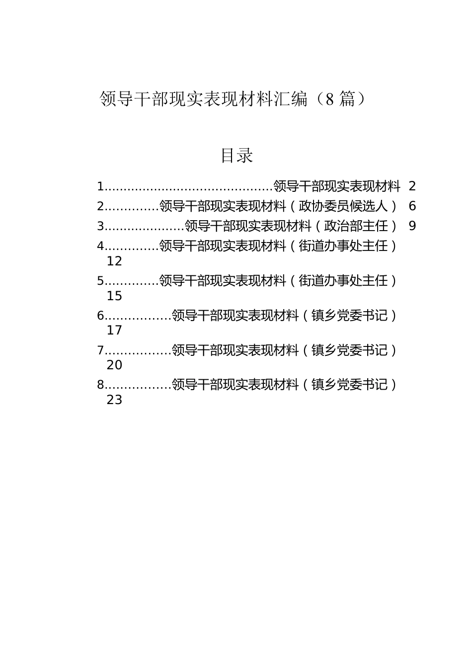 领导干部现实表现材料汇编(8篇)目录1............................................领导干部现实表现材料22..............领导干部现实表现材料(政协委员候选人)63.....................领导干部现实表现材料(政治部主任)94..............领导干部现实表现材料(街道办事处主任)125..............领导干部现实表现材料(街道办事处主任)156.................领导干部现实表现材料(镇乡党委书记)177.................领导干部现实表现材料(镇乡党委书记)208.................领导干部现实表现材料(镇乡党委书记)23领导干部现实表现材料xx,男,汉族,xx省xx市人,xxxx年xx月出生,xxxx年x月参加工作,xxxx年xx月加入中国共产党,大学学历,现任xx职务。自担任现职以来,该同志能够团结带领局党委全面贯彻执行党的路线、方针、政策,认真履行党风廉政建设“第一责任人”职责,全力抓好工作职责,能够圆满完成各项工作任务,并取得实际成效。其具体表现如下:一是政治立场坚定,理想信念过硬。该同志政治立场坚定,旗帜鲜明。自觉加强理论修养,认真学习党的二十大精神和习近平新时代中国特色社会主义思想。具有强烈的政治意识、大局意识和责任意识,能时刻保持清醒的政治头脑,始终坚持正确的政治方向,能够旗帜鲜明、立场坚定地维护党和国家的尊严和利益。不折不扣执行上级党委政府决议,能正确处理个人与组织的关系,在大是大非面前始终保持清醒头脑,具有较强的政治判断力、政治领悟力和政治执行力,能够牢固树立宗旨意识,践行群众路线,对实现党的伟大事业、伟大梦想斗志昂扬、充满信心,能够牢固树立“四个意识”、坚定“四个自信”、坚决做到“两个维护”。二是积极履职尽责,工作成效显著。该同志经验丰富,善于创新。能够从宏观上、全局上思考问题、把握重点、部署工作,始终坚持党建统领税收工作,把党的政治建设摆在首要位置,全力抓好思想建设工作和意识形态工作,研究开创“三亮两评一考核”支部工作法,积极开展“四抓四整治”,创建“一支部一品牌”,严格落实“放管服”改革工作要求,着力提升税收征管质效,提高纳税服务水平,持续优化税收营商环境,以服务地方经济社会发展为目标,以提升便民办税服务水平为抓手,建立了“xxx工作室”“xx工作法”等一批科学有效、切合实际的工作机制制度,持续推动了xx区经济社会持续发展,深受广大群众一致好评。三是勇于担当作为,综合能力突出。该同志审时度势,勇于实践。具有较强的驾驭全局能力和统筹协调能力。参加工作xx多年以来,在不同的工作岗位,勤勤恳恳,踏实工作,勤于思考,善于学习,能结合实际,从大局出发,深入思考工作中薄弱环节并积极进行探索,创新解决措施以推动整体工作,尤其在征收管理、纳税服务等方面做出政策显著成效。在多年的办税岗位上取得了较好的业绩,她多次荣获“青年岗位能手”“优秀共产党员”“先进xx工作者”“纳税服务明星”等称号。四是廉洁自律,工作作风硬朗。该同志清正廉洁,作风优良。始终坚持民主集中制原则,善于维护党内团结,能够坚持在工作中广开言路,听取不同意见。敢抓敢管,敢于负责,带头落实机关单位“三转”,主动深入基层一线和广大群众,重视调查研究和谈心谈话,深入推动了国地税征管体制改革以来干部队伍“事合、人合、心合、力合”。自觉贯彻党风廉政建设责任制,严格抵制“四风”,遵守中央“八项规定”和党的各项工作纪律,能够做到内化于心、外化于形,在群众中有较高威信。无公款消费行为,无收受现金、有价证券、名贵特产品和支付凭证的行为,能够按时上报个人重大事项,无违规出入境行为,从严约束“身边人”,自觉做到了自重、自省、自警、自励,在群众中树立了良好的形象。xx同志担任现职以来,多次在年度考核中被评为优秀公务员,x次被记公务员“三等功”,荣获全省学法用法模范公务员、xx区“五一劳动奖章”、全市“税收征管能手”、优秀财税干部等荣誉称号。局机关在xx同志的带领下,争创命名为国家级文明单位,被区委、区政府命名为支持地方经济社会发展“突出贡献单位”、xx区大力整治作风顽疾创建“六型机关”先进单位、社会发展目...