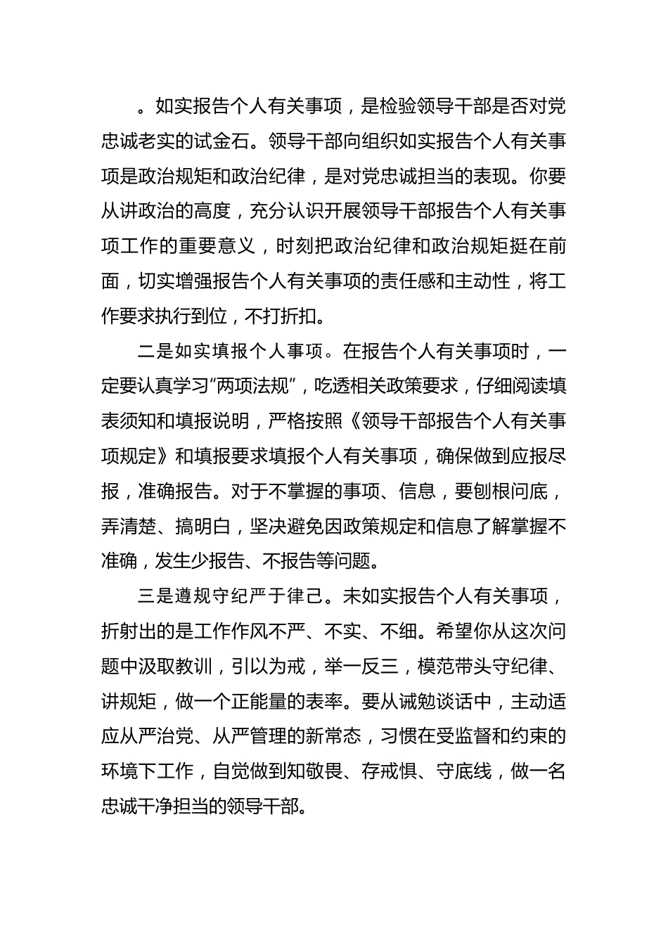 领导干部不如实报告个人有关事项诫勉谈话(约谈)提纲XXX同志:近日,我们收到XX省纪委、监察委员会关于领导干部个人有关事项核查的反馈,你存在不如实报告个人有关事项的情况。经局党组会议研究决定,由我们对你进行诫勉谈话。诫勉谈话是纪律和约束的表现形式,是对党员干部进行早打招呼,及时提醒、纠错诫勉,让红脸出汗、咬耳扯袖成为党内监督的长期工作,是党组织关心爱护干部的具体体现,希望你能正确认识这次诫勉谈话,正确对待党组织的监督。造成你未如实报告个人有关事项,或许存在信息掌握不准确、填报事项不仔细等各种客观原因,但究其主观原因,根子在党性原则不强,关键在思想认识不到位,核心在自我要求不高。按规定报告个人有关事项是我们党对领导干部提出的一项基本要求,是党组织贯彻落实全面从严治党的重要途径,是防止“带病提拔”的重要手段,是严管和保护干部的重要举措。不如实报告个人有关事项,不仅损害了你个人的形象,更损害了全办干部队伍的形象。今天我们就这个问题对你进行约谈,希望你能正视存在问题,深刻检视反思,抓好问题整改。一是切实提高思想认识。如实报告个人有关事项,是检验领导干部是否对党忠诚老实的试金石。领导干部向组织如实报告个人有关事项是政治规矩和政治纪律,是对党忠诚担当的表现。你要从讲政治的高度,充分认识开展领导干部报告个人有关事项工作的重要意义,时刻把政治纪律和政治规矩挺在前面,切实增强报告个人有关事项的责任感和主动性,将工作要求执行到位,不打折扣。二是如实填报个人事项。在报告个人有关事项时,一定要认真学习“两项法规”,吃透相关政策要求,仔细阅读填表须知和填报说明,严格按照《领导干部报告个人有关事项规定》和填报要求填报个人有关事项,确保做到应报尽报,准确报告。对于不掌握的事项、信息,要刨根问底,弄清楚、搞明白,坚决避免因政策规定和信息了解掌握不准确,发生少报告、不报告等问题。三是遵规守纪严于律己。未如实报告个人有关事项,折射出的是工作作风不严、不实、不细。希望你从这次问题中汲取教训,引以为戒,举一反三,模范带头守纪律、讲规矩,做一个正能量的表率。要从诫勉谈话中,主动适应从严治党、从严管理的新常态,习惯在受监督和约束的环境下工作,自觉做到知敬畏、存戒惧、守底线,做一名忠诚干净担当的领导干部。