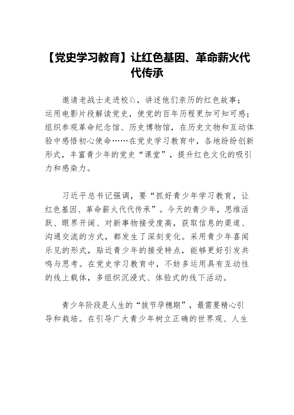 【党史学习教育】让红色基因、革命薪火代代传承邀请老战士走进校,讲述他们亲历的红色故事;♘运用电影片段解读党史,使党的百年历程更加可知可感;组织参观革命纪念馆、历史博物馆,在历史文物和互动体验中感悟初心使命……在党史学习教育中,各地纷纷创新形式,丰富青少年的党史“课堂”,提升红色文化的吸引力和感染力。习近平总书记强调,要“抓好青少年学习教育,让红色基因、革命薪火代代传承”。今天的青少年,思维活跃、眼界开阔、对新事物接受度高,获取信息的渠道、沟通交流的方式,都发生了深刻变化。采用青少年喜闻乐见的形式,贴近青少年的接受特点,能够更好引发共鸣与思考。在党史学习教育中,不妨多运用具有互动性的线上载体,多组织沉浸式、体验式的线下活动。青少年阶段是人生的“拔节孕穗期”,最需要精心引导和栽培。在引导广大青少年树立正确的世界观、人生观、价值观中,创新方式方法,着力讲好党的故事、革命的故事、英雄的故事,能够更好地把“红色种子”播撒进青少年心中,使红色基因融入血液、浸入心扉。