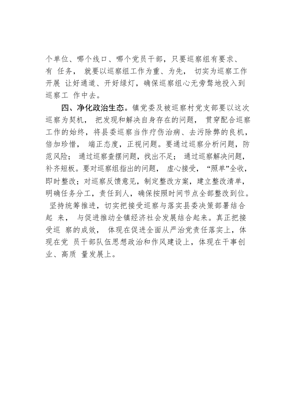 公文堂——海量公文资料,关注立即下载在县委第十巡察组巡察动员会上的表态发言材料2020年09月20日尊敬的巡察组万组长、各位领导:根据县委和县委巡察工作领导小组安排,县委第十巡察组进驻万户镇对下辖的万户、塘美、刘仲、长岭、东升、横塘等6个村党支部开展常规巡察。首先请允许我代表万户镇全体党员干部和三万二千人民群众,对巡察组各位领导的到来,表示热烈的欢迎和衷心的感谢,下面我就如何配合好本次巡察工作表态如下:一、提高政治位。县委开展第十轮巡察是贯彻落实中央和省委、市委关于巡察工作的新部署新要求,扎实推进向村(社区)党组织的延伸巡察,实现巡察全覆盖的创新之举,是加强对基层党组织和党员干部监督、打通全面从严治党“最后一公里”的重大举措。一直以来,县委高度重视巡察工作,近期县委书记肖立新同志对巡察工作作了重要讲话,镇党委班子、各村党支部负责人及时进行了传达学习,认真领会了肖书记的讲话精神。本次开展的常规巡察,是对我镇下辖6个村党支部的全面“会诊把脉”和“政治体检”,有助于我们进一步提高政治站位、加强党的建设和改进各项工作。镇党委领导班子和被巡察村党支部全体党员干部要充分认识巡察工作的重大意义,坚决把思想和行动统一到县委决策部署和巡察工作要求上来,把接受巡察作为向县委决策部署看齐的过程,作为接受组织考验、加强党性锻炼、自我完善提高的过程。要通过巡察,更加严格执行政治纪律和政治规矩,更加坚决服从服务于全县工作大局,更加坚定担当起全面从严治党的政治责任,更加维护好、发挥好党的领导核心作用。二、扛牢政治责任。巡察工作是一项政治性、政策性、纪律性都很强的工作,能否服从巡察工作安排、能否配合巡察组做好巡察工作,是对我们落实政治责任担当的一次重要检验。镇党委和被巡察村党支部要从讲政治、讲大局、讲责任、讲服从的高度,本着对党负责、对人民负责、对事业负责的态度,把支持配合巡察作为重大政治任务,作为当前工作的重中之重,坚决服从巡察工作安排,确保巡察工作顺利开展。要严格按照县委要求接受巡察监督,客观公正地向巡察组提供情况、反映问题,做到讲成绩不粉饰不夸大、讲问题不护短不遮掩、提意见利发展利长远,让巡察组全面掌握、真实了解被巡察村“两委”班子和村集体经济发展的实际情况,帮助和指导我们把各项工作落实落细。三、强化服务保障。镇党委和被巡察村党支部要把搞好服务保障当做一项政治任务来落实,积极配合、主动作为,认真细致地做好各项服务工作,努力为巡察组开展工作创造良好的环境和条件。要服从服务于巡察工作,不管涉及到哪个单位、哪个线口、哪个党员干部,只要巡察组有要求、有任务,就要以巡察组工作为重、为先,切实为巡察工作开展让好通道、开好绿灯,确保巡察组心无旁骛地投入到巡察工作中去。四、净化政治生态。镇党委及被巡察村党支部要以这次巡察为契机,把发现和解决自身存在的问题,贯穿配合巡察工作的始终,将县委巡察当作疗伤治病、去污除弊的良机,倍加珍惜,端正态度,正视问题。要通过巡察分析问题,防范风险;通过巡察查摆问题,找出不足;通过巡察解决问题,补齐短板。要对巡察组指出的问题,虚心接受,“照单”全收,即时整改;对巡察反馈意见,制定整改方案,建立整改清单,明确任务分工,责任到人,确保按照时间节点全部整改到位。坚持统筹推进,切实把接受巡察与落实县委决策部署结合起来,与促进推动全镇经济社会发展结合起来。真正把接受巡察的成效,体现在促进全面从严治党责任落实上,体现在党员干部队伍思想政治和作风建设上,体现在干事创业、高质量发展上。