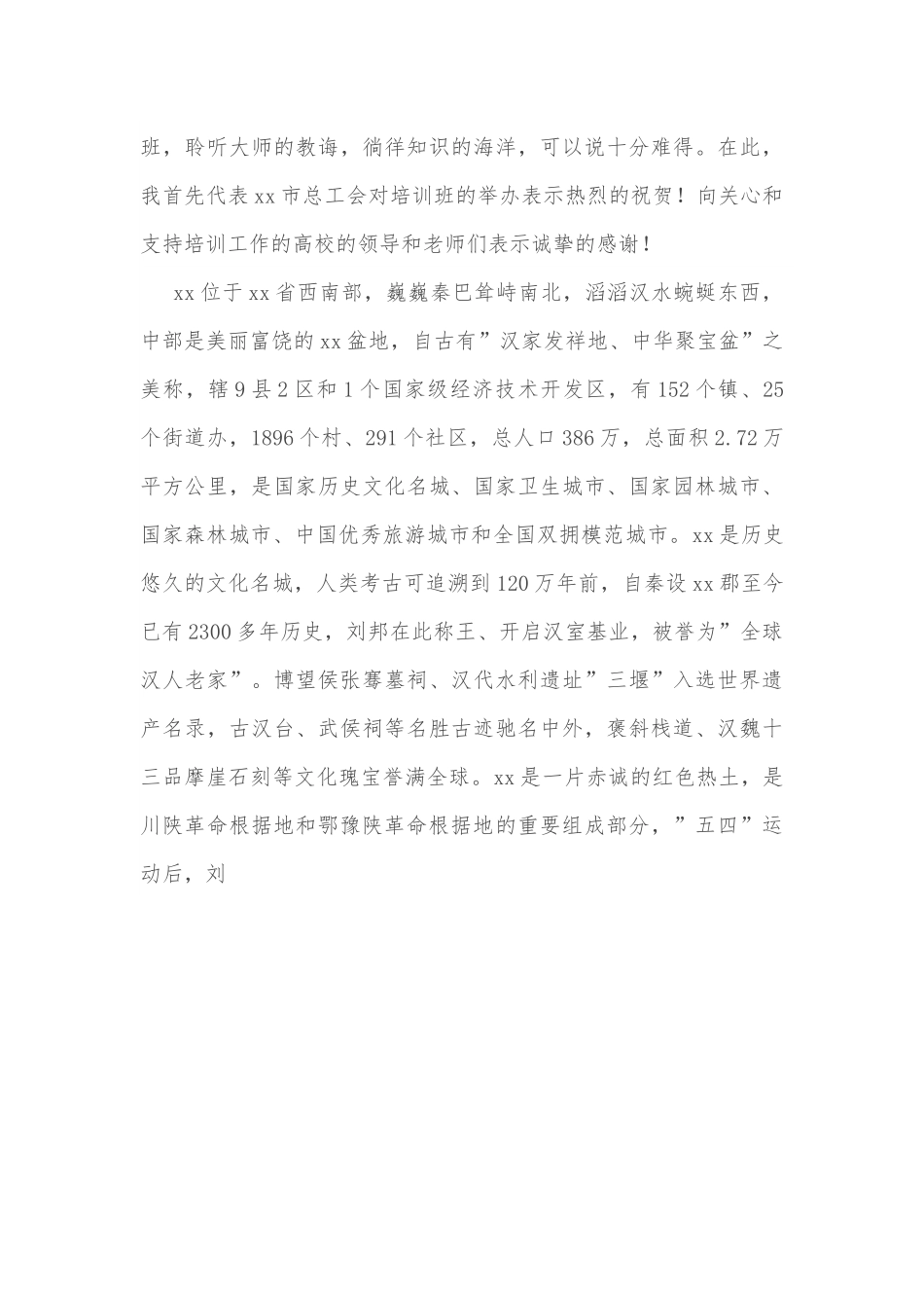 在高校工会干部培训班上的动员讲话尊敬的xx教授、同志们、朋友们:今年是建党101周年。今天,我们来到美丽、宜居、幸福的xx,与xx联合举办工会干部培训班,就是借助xx丰富的教学资源,给大家充电赋能、提素强能,助力广大干部、劳模先进在职工服务、经济发展中担当作为、接续奋进,推动xx工运事业高质量发展,为”三市”建设作出新的贡献。xx是一座风姿绰约的海上花园。城在海上,海在城中,构成了xx独特的城市风格。岛、礁、岩、寺、花、木相互映衬,侨乡风情、闽台习俗、海滨美食、异国建筑融为一体,四季如春的气候更为海的魅力锦上添花。坐落在xx岛西南侧的高校,面朝大海、背靠青山,毗邻千年古刹南普陀寺,新文化运动的斗士、先锋鲁迅先生曾用”背山靠海,风景绝佳”来称赞这所中国环境最优美的大学校园。1921年4月6日,被毛泽东誉为”华侨旗帜民族光辉”的陈嘉庚怀抱教育救国宏愿倾资创办了高校,刚建校的高校广揽英才、群贤毕至,林语堂、鲁迅、顾颉刚等前来任教,xx文科盛况非凡”颇有北大南迁的景象”。xx学子罗扬才在xx的囊萤楼里组建了福建省第一个中共党支部,至此xx成为了闽西南地区党的发祥地和播种机革命运动的策源地,被誉为”八闽大地的革命摇篮”。抗日战争期间,xx内迁福建长汀,成为当时粤汉铁路线以东唯一的国立大学,也成为抗战期间”国内最完备大学之一”,造就了”南方之强”的美誉。新中国成立后,xx对国家急需人才的培养更是热火朝天,陈景润、蔡启瑞、田昭武、唐仲璋等学界泰斗在这里任教、专研,开创了一项又一项中国第一。如今的xx人继续秉承爱国、革命、自强、科学的xx精神,以时不待我、只争朝夕的精神,继续乘风破浪、一往无前,2019年先后联合研制”嘉庚一号”火箭、”海丝一号”卫星以及”嘉庚”号海洋科考船,真正实现了”上九天揽月,下五洋捉鳖”的豪情,为中国发展贡献了xx智慧、提供了xx方案。我们有幸在这样一所充满魅力、历史和实力的校园举办xx市工会干部培训班,聆听大师的教诲,徜徉知识的海洋,可以说十分难得。在此,我首先代表xx市总工会对培训班的举办表示热烈的祝贺!向关心和支持培训工作的高校的领导和老师们表示诚挚的感谢!xx位于xx省西南部,巍巍秦巴耸峙南北,滔滔汉水蜿蜒东西,中部是美丽富饶的xx盆地,自古有”汉家发祥地、中华聚宝盆”之美称,辖9县2区和1个国家级经济技术开发区,有152个镇、25个街道办,1896个村、291个社区,总人口386万,总面积2.72万平方公里,是国家历史文化名城、国家卫生城市、国家园林城市、国家森林城市、中国优秀旅游城市和全国双拥模范城市。xx是历史悠久的文化名城,人类考古可追溯到120万年前,自秦设xx郡至今已有2300多年历史,刘邦在此称王、开启汉室基业,被誉为”全球汉人老家”。博望侯张骞墓祠、汉代水利遗址”三堰”入选世界遗产名录,古汉台、武侯祠等名胜古迹驰名中外,褒斜栈道、汉魏十三品摩崖石刻等文化瑰宝誉满全球。xx是一片赤诚的红色热土,是川陕革命根据地和鄂豫陕革命根据地的重要组成部分,”五四”运动后,刘秉钧、陈锦章、何挺颖等有志青年,为xx点燃了熊熊燃烧的革命之火;在革命岁月里,李先念、徐向前、徐海东、王震等老一辈无产阶级革命家在这里运筹帷幄、指挥战斗,留下了许多可歌可泣的英雄故事。xx是生态秀美的康养福地,森林覆盖率63.8%,境内有汉江、嘉陵江两大水系,是国家南水北调中线工程和xx引汉济渭工程重要水源涵养地,大熊猫、朱鹮、羚牛、金丝猴等珍稀动物在此栖息繁衍,被公认为地球上同一纬度生态条件最好的地区之一。xx是宜居宜游的美丽城市,一江两岸、兴汉胜境、兴汉文化生态旅游区、天汉文化公园多彩多姿,有国家4A级景区15个、3A级景区15个,xx油菜花节跻身全国”十大花节花会”,荣获中国最美十大城镇奖、中国最美乡村旅游目的地,”两汉三国·真美xx”城市品牌享誉全国。xx是开放开发的投资热土,丝绸之路开拓者张骞从这里走出去,唐宋丝茶贸易在这里繁荣,使xx成为丝路之源;进入新时代,西成高铁变天堑为通途,”三高三铁五国道一机场”立体交通网络加速完善,xx海关获批设立,学研、医养、旅居、兴业”四个在xx”魅力彰显,区域中...