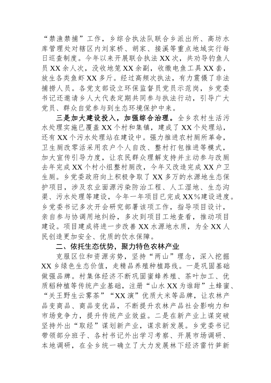 XX乡在全县乡村振兴工作推进会的发言今年以来,XX乡将“XX”行动作为补短板、强基础、增活力、促发展的重要抓手,年初通过深入调研,结合XX实际科学定题攻薄促弱类项目:“党建引领,做好水源地生态保护,为‘山水XX’绿色发展赋能”。提质增效类项目:“弘扬和发展新乡贤文化,助推‘山水XX’高质量发展”。乡党委书记亲自谋划、协调、推进,充分发挥党建引领作用和“XX”示范作用,通过项目化形式推动解决重点难点问题,促进基层党建和中心工作全面融合,发展全面过硬。一、坚持保护为先,筑牢绿色发展基础一是深化思想引领,提升环保意识。乡党委紧扣学习贯彻习近平新时代中国特色社会主义思想、习近平生态文明思想、党的二十届三中全会精神等“主题主线”,书记带头学、党员示范学、干部深入学、群众跟着学,用党的创新理论武装干部群众头脑,统一思想,坚定信念。深学笃用习近平生态文明思想,秉持“山水XX”绿色发展理念始终不动摇。乡党委、各村党支部牵头,常态化做好环保宣传“进机关、进企业、进农村、进家庭、进学校”五进活动,通过播放“山水XX”宣传片,发放“环境保护倡议书”,到各村组张贴宣传标语,到学校开展宣讲等活动,显著增强了干群环保意识,坚定了走绿色生态发展道路。二是提升治理水平,强化源头防控。XX乡是一个典型的边远山区乡镇,山清水秀,森林覆盖率达到XX%,是整个XX县城的饮用水水源保护地。乡党委深刻把握发展与保护的关系,严格落实饮用水水源地的管控要求,不引进污染企业,不批准大型畜牧养殖,做好“禁渔禁捕”、秸秆禁烧、禁止河道采沙、乱砍滥伐等工作,加大综合执法力度,对违规违纪者严格处罚,强化源头防控监管。如针对“禁渔禁捕”工作,乡综合执法队联合乡派出所、高坊水库管理处对辖区内刘家桥、胡家、接溪等重点地域实行每日巡查制度。今年以来开展联合执法XX次,共劝导钓鱼人员XX余人次,没收地笼XX余副,收缴电鱼工具XX套,放生各类鱼虾XX多斤。经过高频次执法,有力震慑了非法捕捞人员。各党支部设立环保监督员党员示范岗,乡党委书记还邀请乡人大代表定期共同参与执法行动,引导广大党员、群众自觉参与到生态环境保护中来。三是加大建设投入,加强综合治理。全乡农村生活污水处理实施已覆盖XX个村和集镇,建成了XX个处理站,还有XX个污水处理站在建设中。强力推进农村厕所革命,卫生厕改零活采用农户个人自改、整村打包推进等模式,加大宣传引导力度,让农民群众理解支持并主动参与改厕去年完成XX个村小组整村厕改,今年又改造完成XX户卫生厕。乡党委政府向上积极争取了XX多万的水源地生态保护项目,涉及农业面源污染防治工程、人工湿地、生态沟渠、污水处理等建设,今年一年项目已完成XX%建设进度。乡党委书记多次开会研究部署该项工作,指导项目设计,亲自参与协调用地纠纷,多次到项目工地查看,推动项目建设。项目建成将进一步改善XX水源地水质,为全XX人民创造更加安全、优质的饮水保障。二、依托生态优势,聚力特色农林产业克服区位和资源劣势,坚持“两山”理念,深入挖掘XX乡绿色生态价值,走精品养殖种植路线。一是巩固基础做强品牌。村集体经济不断巩固蜜蜂养殖、茶叶加工、优质稻种植等传统产业基础,注册“山水XX为谁甜”土蜂蜜、“关王野生云雾茶”“XX演”优质大米等品牌,让农林产品变商品、商品变优品,不断提升农林产品社会影响力和市场竞争力,提升传统产业效益。二是在新产业上谋突破坚持外出“取经”谋划新产业,谋求新发展。乡党委书记带领部分班子、各村书记外出学习考察、开展市场调研、本地调研,在全乡统一确立了大力发展林下经济雷竹笋新产业,全乡XX个村集体经济合作社共种植了雷竹XX余亩。三是补强产业链,促进村民致富。关王村支部申请了产业项目资金XX多万元,将村委会闲置的房屋翻新装修,打造了一所集茶叶深加工及茶文化体验综合性功能的茶叶工坊使简单地卖茶叶变成了茶叶加工销售、茶文化体验一条龙产业,今年XX月份村党支部还发动党员志愿者新种下XX多株茶树。高桥村党总支申请了乡村振兴产业资金,建成了稻谷烘干厂,后续还将引入大米加工厂,使XX种植的优质稻、有机稻能够进行深加工,...