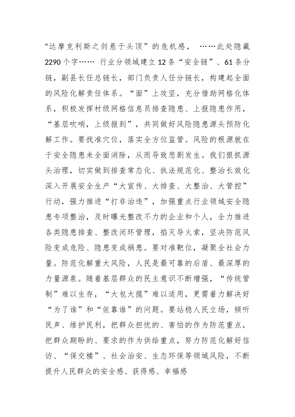 县理论学习中心组防范化解重大风险研讨发言材料同志们:备豫不虞,为国常道。党的二十大报告提出,要提高防范化解重大风险能力,严密防范系统性安全风险。县域是国家治理的基石,县域安,则国家安。防范化解重大风险如何在县域落地落细,我认为就是要带头坚持底线思维、系统思维、闭环思维,清醒识风险、主动防风险、有效化风险,切实打好防范化解风险阻击仗,以**一域之稳维护全国大局之安。要时时放心不下,以底线思维清醒认识风险。县一级是防范化解重大风险的前沿阵地,必须树牢底线思维,强化风险意识,以“四观”清醒认识风险,做到心中有数、了然于胸。要看透“灰黑观”。“灰”即“灰犀牛”,指大概率的、可以预测的事件,见惯了会觉得麻木;“黑”即“黑天鹅”,指小概率的、难以预测的事件,因为不常发生容易让人心存侥幸,却“偶然之中有必然”。“灰犀牛”“黑天鹅”正交替冲击县域稳定的底线底板,我们要以一丝不苟的责任态度应对“灰犀牛”,用扎实细致的工作去对冲、挤占、消灭“黑天鹅”!要看重“忧思观”。人无远虑,必有近忧。当前,县域发展仍处于战略机遇期优势与风险共存,机遇和挑战同在。在县域工作,要多一些“祸患常积于忽微”的忧思观,多一些“达摩克利斯之剑悬于头顶”的危机感,……此处隐藏2290个字……行业分领域建立12条“安全链”、61条分链,副县长任总链长,部门负责人任分链长,构建起全面的风险化解责任体系。“面”上攻坚,充分借助网格化体系,积极发挥村级网格信息员排查隐患、上报隐患作用,“基层吹哨,上级报到”,共同做好风险隐患源头预防化解工作。要找准穴位,落实全方位监管。风险的根源就在于安全隐患未全面消除,从而导致悲剧发生。我们狠抓源头治理,切实做到排查常态化、执法规范化、整治长效化深入开展安全生产“大宣传、大排查、大整治、大管控”行动,强力推进“打非治违”,加强重点行业领域安全隐患专项整治,及时曝光整改不力的企业和个人,全力推进各类隐患排查、整改闭环管理,掐灭导火索,坚决防范风险变成危险、隐患变成祸患。要对准靶位,凝聚全社会力量。防范化解重大风险,人民是最可靠的后盾、最深厚的力量源泉。随着基层群众的民主意识不断增强,“传统管制”难以生存,“大包大揽”难以适用,更需着力解决好“为了谁”和“依靠谁”的问题。要站稳人民立场,倾听民声、维护民利,把群众担忧的、害怕的作为防范重点,把群众期盼的、要求的作为供给重点,努力防范化解好信访、“保交楼”、社会治安、生态环保等领域风险,不断提升人民群众的安全感、获得感、幸福感。要紧紧依靠人民,充分调动社会各界积极性,增强人民群众防风险的意识,支持社会力量深度参与常态减灾、应急救援、安全生产等各项工作,打造防范化解风险的最坚实人民防线。发言完毕,不当之处,请同志们批评指正!谢谢!