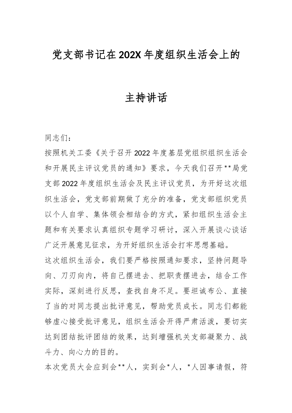 党支部书记在202X年度组织生活会上的主持讲话同志们:按照机关工委《关于召开2022年度基层党组织组织生活会和开展民主评议党员的通知》要求,今天我们召开**局党支部2022年度组织生活会及民主评议党员,为开好这次组织生活会,党支部前期做了充分的准备,党支部组织党员以个人自学、集体领会相结合的方式,紧扣组织生活会主题和有关要求认真组织专题学习研讨,深入开展谈心谈话广泛开展意见征求,为开好组织生活会打牢思想基础。这次组织生活会,我们要严格按照通知要求,坚持问题导向、刀刃向内,将自己摆进去、把职责摆进去,结合工作实际,深刻进行反思,查找自身不足。要坦诚布公、直接了当的对同志提出批评意见,帮助党员成长。同志们都能够虚心接受批评意见,组织生活会开得严肃活泼,要切实达到团结批评团结的效果,达到增强机关支部凝聚力、战斗力、向心力的目的。本次党员大会应到会**人,实到会*人,*人因事请假,符合召开党员大会的要求,现在开会。首先,由我代表支部委员会报告2022年工作;……第二项:由我代表支部班子作对照检查;……第三项:各位党员依次发言,开展批评与自我批评,按照规定,一位同志讲完后,大家提出意见建议。首先由我先进行自评。……请各位同志对我提出意见建议,大家可以敞开心扉,坦诚相见,由什么问题就提什么问题,越中肯越好,越直接越好,不要有什么顾虑,从**同志开始。……下面请**同志进行自评,大家依次提出批评意见。……刚才每个党员都进行了深刻的自我批评,敢于揭短亮丑,不遮掩问题,不回避矛盾,很到位,其他党员也提出了批评意见,请大家虚心接受意见建议,抓好问题整改,确保组织生活会开出实效。下面,进行第四项议程:开展党员民主测评。请**、**同志发放民主测评表。请各位党员结合工作实际,实事求是进行评价,根据机关工委要求,民主测评党员优秀等次不可超过党员总数的三分之一,我们支部党员共有**名,每人选择“优秀”等次的党员人数最多可选*人,“合格”、“基本合格”、“不合格”等次人数不限。……(评价结束)同志们,今天组织生活会的议程已经全部完毕。下面,就扎实做好组织生活会后半篇文章,我再强调几点意见:一是要在强化政治建设上聚焦用力。各党小组及全体党员要把学习贯彻党的二十大精神作为当前和今后一个时期的首要政治任务,持续在“五个牢牢把握”上下功夫,忠诚拥护“两个确立”,坚决做到“两个维护”,不断提升政治判断力、政治领悟力、政治执行力。要按照中央和省市县委统一安排,组织好xxx新时代中国特色社会主义思想主题教育活动,确保学习教育真正入心入脑、见行见效。支部及各党小组要制定学习计划,明确学习重点,精心组织学习;各支委要发挥“头雁”效应,先学一步、学深一层多悟一分,认真把握核心精髓;各党小组要充分利用工作之余的时间,组织党员认真开展学习;党员个人要积极参加集体学习,运用学习强国、怀德夜校等载体,不断提升学习效果。二是要在狠抓问题整改上聚焦用力。会后,支部、各党小组和党员要认真聚焦查摆问题和相互批评意见,建立“问题、整改、责任”清单,推动查摆问题严格按照支部标准化建设要求整改到位,确保问题不反弹、不回潮;要坚持“当下改”与“长久立”相结合,持续推进党建工作标准化规范化开展,全面提升“五星级党支部”建设质量,不断增强党组织的凝聚力、吸引力和战斗力。三是要在强化担当作为上聚焦用力。要积极发挥支部战斗堡垒作用,主动聚焦发展大局和重点工作,找准切入点,把准关键点,真正把上级各项决策部署贯穿于审批服务的全过程、各环节;全体党员要切实增强为民情怀,在急难险重任务面前冲在前、干在前、作表率,以群众满意为第一标准、市场评价为第一评价、企业感受为第一感受,加快打造市场化、法治化、国际化一流营商环境,为助推县域经济高质量发展贡献力量。四是要在强化自身建设上聚焦用力。要模范带头落实省委市委工作要求和县委作风建设工作部署,锲而不舍纠“四风”、树新风。以创建“服务型、创新型、清廉型”支部为载体,加强队伍监督,完善评价体系,大力弘扬“勤快严实精细廉”工作作风,埋头苦干、勇毅前行、破冰突...