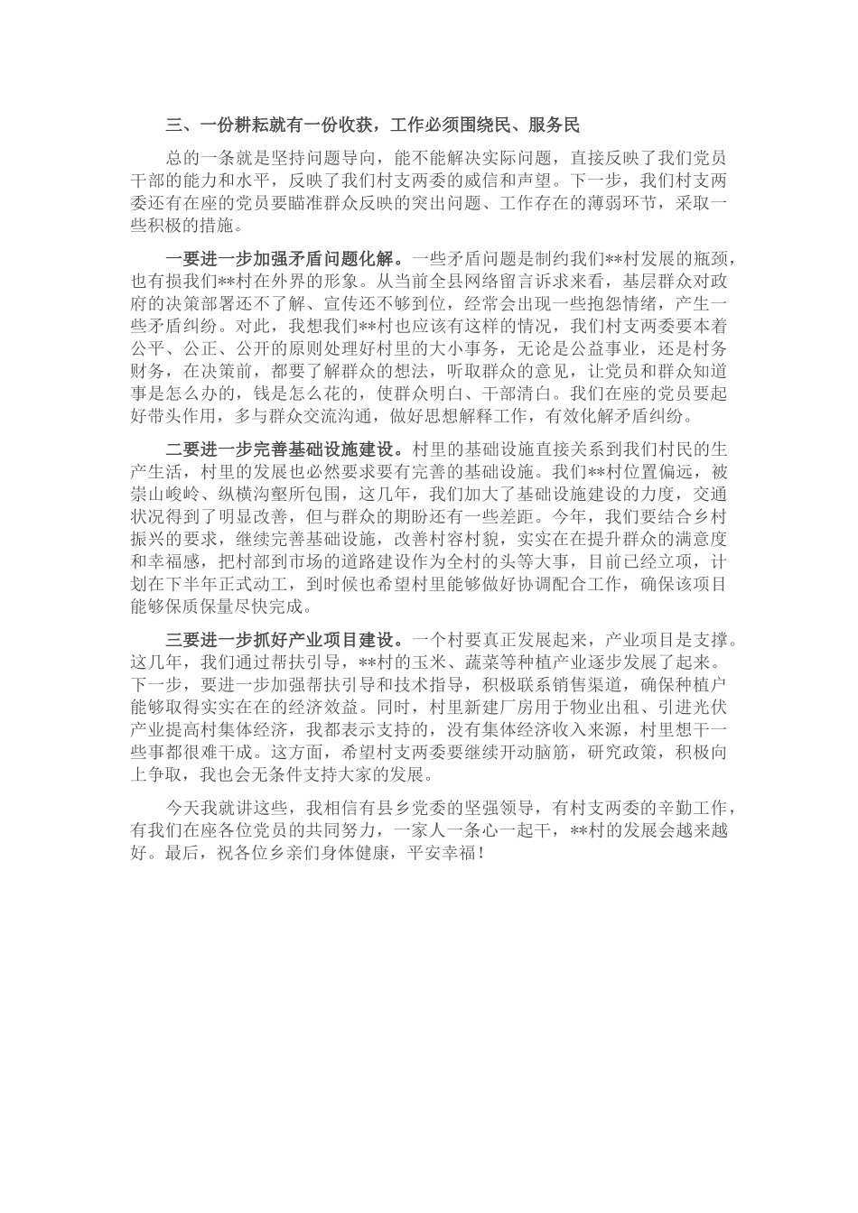 基层党课讲稿:传承红色基因永葆党员本色同志们:**村是一个具有红色底蕴的村庄,村民非常勤奋、朴实、能干,我为自己能够联系**村而感到知足、放心、满意。特别是近几年,**村在县乡党委的坚强领导下,在村支两委的努力工作下,在广大村民的支持配合下,各项工作相比过去有了很大的提升,村支两委班子更加团结了,服务水平有了很大提高,民生事业有了显著发展。正是因为村支两委班子以及在座各位党员的共同努力,发挥了党员应有的作用,我们**村才会有这样的变化。因此,今天的党课,我围绕“传承红色基因,永葆党员本色”这个主题,谈一些认识和体会,与大家共同学习、共同交流、共同探讨,我主要讲三个方面。一、一个党员就是一面旗帜,党员必须干在前、走在前我们共产党的初心和使命是什么?就是为中国人民谋幸福,为中华民族谋复兴。我们每一名共产党员都要以此作为我们的奋斗目标。《党章》规定,共产党员必须全心全意为人民服务,不惜牺牲个人的一切,为实现共产主义奋斗终生。《党章》列出党员应该履行的义务就有这么一条,“贯彻执行党的基本路线和方针、政策,带头参加改革开放和社会主义现代化建设,带动群众为经济发展和社会进步艰苦奋斗,在生产、工作、学习和社会生活中起先锋模范作用。”具体到我们**村的党员,我们的初心和使命是什么?我认为,**村党员干部的初心和使命就是要传承红色基因,带领村民脱贫致富,就是要为**村的发展贡献自己的力量。具体来讲要在三个方面发挥好模范带头作用。一要当好“主人翁”。《党章》指出,共产党员是中国工人阶级的有共产主义觉悟的先锋战士,这也就是说共产党员要比普通群众有更坚定的理想信念、有更高的思想觉悟。革命战争年代,共产党员为了保家卫国不惜流血牺牲;改革开放年代,共产党员虽然不用流血牺牲,但是有时要为了群众的利益牺牲个人的利益。说得更具体一点,就是我们**村的党员要为**村的发展努力奋斗。**村是我们**每一个人的家,特别是村里的党员干部要有“主人翁”意识,要带头支持配合村支两委的工作,带头为**村的发展谋划出力,带头维护**村的村规民约和社会风气。要始终坚信在党的好政策的指引下,在大家的共同努力下,我们村的发展会越来越好。今年,**村共流转土地1000多亩规模化种植玉米800多亩,蔬菜300多亩,水稻500多亩,形成良好的发展势头,村支两委还决定带领大家光伏发电厂来增加村集体经济,这是非常前卫的思想。大家一定要有这个信心和决心,一定要把思想认识凝聚起来。二要树立“好形象”。我们常说,村看村、户看户,群众看党员,党员看干部。我们村里的党员,你的一言一行、一举一动都代表着共产党的形象,老百姓时刻在盯着我们、时刻在看着我们,我们怎么说,我们怎么做,都会对普通老百姓产生一定的影响。村里的党员一定要牢记自己共产党员的身份,以合格的共产党员的标准来要求自己,要意识到自己虽然来自于普通群众,但是要比普通群众有更高的要求。特别是在**村,红色底蕴深厚,我们更需要传承红色基因,听从上级党委工作安排,及时响应党的号召,执行党的任务,把自己的行为规范起来,把良好的作风体现出来,亮身份、树旗帜,引领和转变社会风气。三要善做“贴心人”。群众观点是我们党的基本政治观点。作为**村的党员,特别是我们村支两委班子成员,要善做群众的“贴心人”,想问题、办事情、做决策要坚持把为**村谋福祉作为根本的出发点和落脚点,多到每家每户去转转,多深入群众了解掌握一些实际情况,多走村串户去宣传落实上级的一些政策。我们党在农村的每一项方针政策,都涉及到每家每户,与群众的衣食住行都息息相关。政策落实得好,党支部在村民中就有威望;政策执行不好,群众就不满意,就会批评我们。从这个意义上讲,政策落实的怎么样,事关党的形象。我们村支两委的干部就要认真思考,上级的政策特别是乡村振兴的政策,哪些已经落实了,哪些还没有落实,没有落实的原因是什么,怎样才能落实到村民手中。执行政策不能光靠自己,还要把政策向村民讲清楚、讲明白,让他们理解党的政策,支持党的政策。我们的一般党员,也要深入群众,发挥自身作用,多与群众交流沟通,多做...