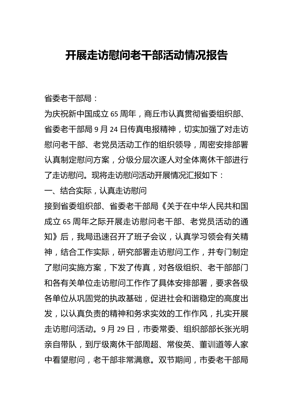 开展走访慰问老干部活动情况报告省委老干部局:为庆祝新中国成立65周年,商丘市认真贯彻省委组织部、省委老干部局9月24日传真电报精神,切实加强了对走访慰问老干部、老党员活动工作的组织领导,周密安排部署认真制定慰问方案,分级分层次逐人对全体离休干部进行了走访慰问。现将走访慰问活动开展情况汇报如下:一、结合实际,认真走访慰问接到省委组织部、省委老干部局《关于在中华人民共和国成立65周年之际开展走访慰问老干部、老党员活动的通知》后,我局迅速召开了班子会议,认真学习领会有关精神,结合工作实际,研究部署走访慰问工作,并专门制定了慰问实施方案,下发了传真,对各级组织、老干部部门和各有关单位走访慰问工作作了具体安排部署,要求各级各单位从巩固党的执政基础,促进社会和谐稳定的高度出发,以认真负责的精神和务求实效的工作作风,扎实开展走访慰问活动。9月29日,市委常委、组织部部长张光明亲自带队,到厅级离休干部周超、常俊英、董训道等人家中看望慰问,老干部非常满意。双节期间,市委老干部局精心挑选了经济适用、物美价廉的慰问品,班子成员全体出动,逐人逐户对市厅级老干部进行了走访慰问。在市领导的示范带动下,全市各级各单位也迅速行动起来,按照分级分层次负责的原则,扎实开展走访慰问活动,帮助困难家庭解决了一批实际问题切实把党和政府的温暖送到了老干部家中。二、统筹安排,活动形式多样为丰富活动内容,增强节日气氛,我局以市老年书画院、市老年摄影协会、市老干部大学为依托,以新建成试运行的市老干部活动中心(老干部大学)为阵地,于9月26日至9月30日精心组织开展了一系列形式多样的庆祝活动。一是举办了“全市庆祝新中国成立65周年老年书画展”。书画作品主题鲜明、内容丰富、形式多样、异彩纷呈,充分映了广大老干部热爱党、热爱祖国、热爱商丘的博大情怀市委书记陶明伦亲临现场,慰问看望了正在参展的老干部老同志,观看了展出的200余幅书画作品,并作了即席讲话,对全市老年朋友送去了节日祝贺和亲切问候,要求各级各部门一定要高度重视老干部工作,大力弘扬尊老敬老养老助老的道德风尚,竭诚为老干部办实事、做好事、解难事,努力让广大老年朋友幸福生活、颐养天年。二是举办了“全市庆祝新中国成立65周老年摄影作品展年”。100多幅瑰丽精美的摄影作品,充分展示了商丘市老年摄影的艺术风采,抒发了广大老年摄影爱好者对伟大祖国和社会主义事业的赞美之情,观众络绎不绝,受到了广大老同志的欢迎和喜爱得到了广泛好评。市委副书记周树群和市委常委、组织部部长张光明出席了开展仪式。三是举办了市老干部大学教学成果汇报演出为庆祝新中国成立65周年,市老干部大学精心挑选了一批老年节目,于9月29日组织举办了一场精彩的演出活动。市领导周树群、张光明和市厅级离退休干部代表庄敬山、史培德、张春学、周金铎等10余位老领导观看了演出。演出以歌颂伟大祖国、唱响尊老敬老社会主旋律、营造浓厚的节日气氛、全面构建美好和谐社会为主题,老干部学员的精彩演出赢得现场观众的阵阵掌声。三、注重实效,搞好工作结合在开展走访慰问活动时,我局坚持结合工作搞慰问,强化措施,务求实效。一是坚持走访慰问与通报工作相结合。要求各级各单位在走访慰问时,及时通报党的群众路线教育实践活动开展情况,征求老干部的意见和建议,切实加强和改进工作。二是坚持走访慰问与落实新出台政策相结合,逐人进行了核实。三是坚持走访慰问与开展离休干部“两费”落实情况自查相结合。在全市开展了老干部工作自查活动,要求各级各单位以走访慰问为契机,建立健全困难帮扶机制,积极为老同志办实事、做好事、解难题,真正将走访慰问活动变成了帮助老干部排忧解难的过程,进一步促进了离休干部各项政治生活待遇的落实。四、广泛宣传,营造浓厚氛围商丘是革命老区,现有2428名离休干部。他们经历了战争的烽火与硝烟,为改革开放奉献出青春与热血。为营造浓厚的尊重老同志、学习老同志、关爱老同志的风尚,我局充分利用广播、电视、报刊等新闻媒体,采取多种形式,积极宣传党的方针政策,宣传改革开放以来取得的辉煌成就,宣传老干部老党员的爱国主...