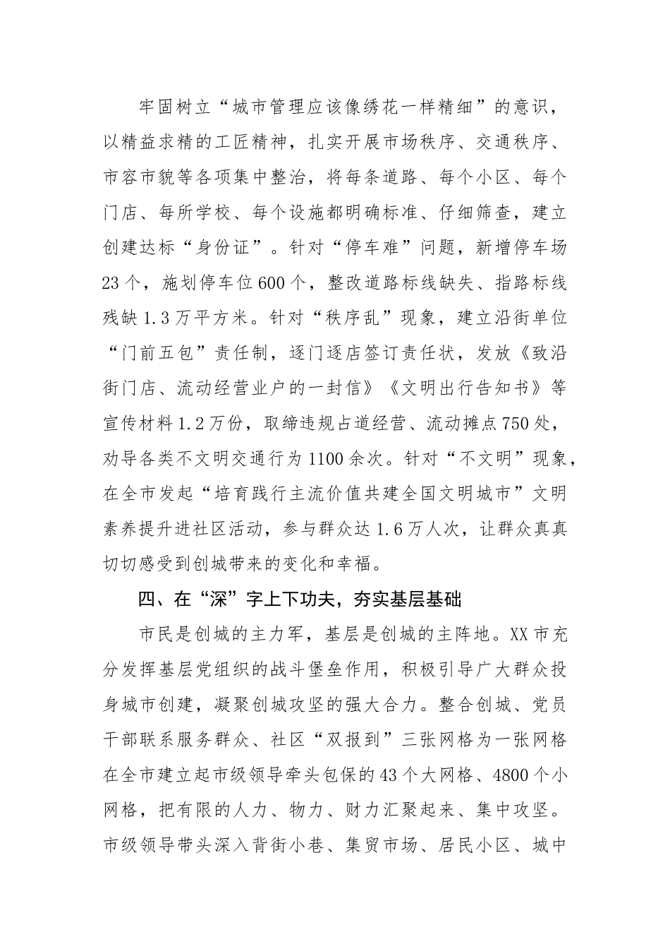 以“五字诀”抓实文明城市创建——在全市推进文明城市创建工作会议上交流发言XX市举全市之力,下非常之功,聚焦重点难点,紧盯短板顽疾,抓实“准、实、细、深、严”五字诀,推动文明城市创建向更高层次、更高水平迈进。一、在“准”字上下功夫,精准对标达标二、在“实”字上下功夫,抓好问题整改坚持问题导向,以“实”为前提,以“改”为关键,以“见效”为目的,坚决杜绝形式主义。围绕基础设施建设、环境综合整治、窗口行业规范化服务、文明社区建设等重点,对存在的问题开展一次全面的大起底、大排查,深入查找不足。针对查摆出来的问题,逐一明确时限要求建立常态管理办法,杜绝问题反反复复、久治不愈。加大日保洁频次,平均每天清理建筑垃圾130余吨;每天对670余个市政垃圾桶、3万米隔离栏巡回清刷、擦拭,更换破损垃圾桶300余个,修补破损路面、人行道砖1800平方米,维修路灯、景观灯310盏,对118个小区进行了卫生清理、线路规整、保温防水、消防检查、安装充电桩设施……一个个实实在在的民心工程,让老百姓住的安心、过的舒心。三、在“细”字上下功夫,提升功能品质牢固树立“城市管理应该像绣花一样精细”的意识,以精益求精的工匠精神,扎实开展市场秩序、交通秩序、市容市貌等各项集中整治,将每条道路、每个小区、每个门店、每所学校、每个设施都明确标准、仔细筛查,建立创建达标“身份证”。针对“停车难”问题,新增停车场23个,施划停车位600个,整改道路标线缺失、指路标线残缺1.3万平方米。针对“秩序乱”现象,建立沿街单位“门前五包”责任制,逐门逐店签订责任状,发放《致沿街门店、流动经营业户的一封信》《文明出行告知书》等宣传材料1.2万份,取缔违规占道经营、流动摊点750处,劝导各类不文明交通行为1100余次。针对“不文明”现象,在全市发起“培育践行主流价值共建全国文明城市”文明素养提升进社区活动,参与群众达1.6万人次,让群众真真切切感受到创城带来的变化和幸福。四、在“深”字上下功夫,夯实基层基础市民是创城的主力军,基层是创城的主阵地。XX市充分发挥基层党组织的战斗堡垒作用,积极引导广大群众投身城市创建,凝聚创城攻坚的强大合力。整合创城、党员干部联系服务群众、社区“双报到”三张网格为一张网格在全市建立起市级领导牵头包保的43个大网格、4800个小网格,把有限的人力、物力、财力汇聚起来、集中攻坚。市级领导带头深入背街小巷、集贸市场、居民小区、城中村等重点部位,现场解决重点难点问题。市直部门、镇街机关干部、社区村居干部以及区域内的党员、群众、志愿者,全部下沉到网格,构建起“网上有点、点上有人、人人有责”的长效责任模式。今年以来,各网格累计推动整改群众关心关注的热点难点事项391个。五、在“严”字上下功夫,提高工作标准标准从严。标准决定质量,只有高标准才有高质量XX市坚持高起点、高标准、严要求,全面学标对标省内外先进县市,自抬标杆、自我加压,把落实任务的标准一次性定高、措施一次性定实、责任一次性卡到位,确保创城工作始终保持高水准、强力度过程从严。发扬“钉钉子”精神,坚持看结果和看过程相结合,盯紧每个环节,步步紧跟落实,借助第三方评价机构,高标准组织开展多轮次模拟验收,拿着“放大镜”,一项一项检查,一项一项验收,问题整改不到位不放过、责任落实不到位不放过、群众不满意不放过。作风从严。严明工作纪律,把创城工作纳入挂图作战平台,逐项明确目标任务、时间节点、推进措施和责任分工,通过开展“大培训、大练兵、大比武、大竞赛”活动,比出动力、比出干劲、比出成效。X