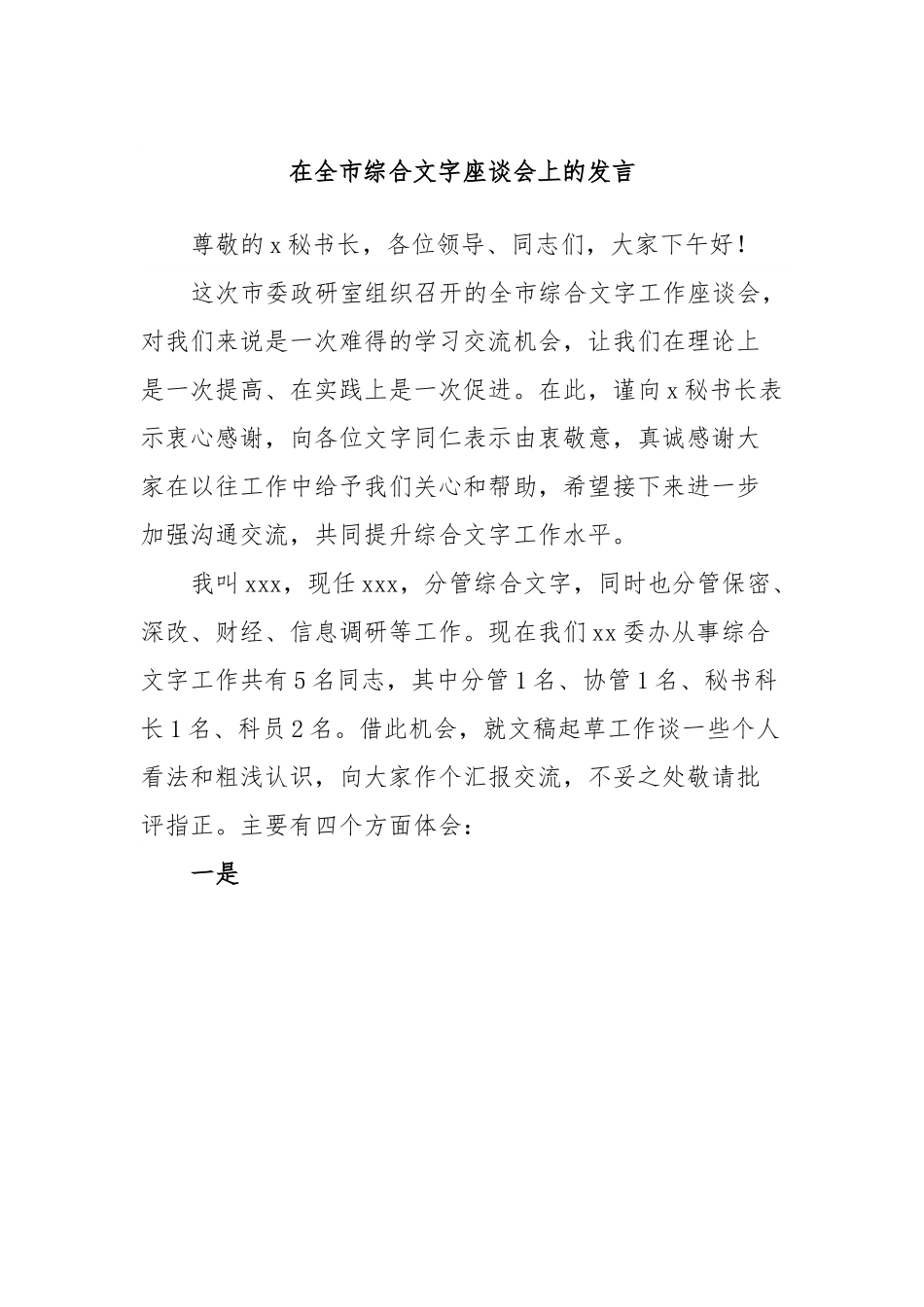 在全市综合文字座谈会上的发言尊敬的x秘书长,各位领导、同志们,大家下午好!这次市委政研室组织召开的全市综合文字工作座谈会,对我们来说是一次难得的学习交流机会,让我们在理论上是一次提高、在实践上是一次促进。在此,谨向x秘书长表示衷心感谢,向各位文字同仁表示由衷敬意,真诚感谢大家在以往工作中给予我们关心和帮助,希望接下来进一步加强沟通交流,共同提升综合文字工作水平。我叫xxx,现任xxx,分管综合文字,同时也分管保密、深改、财经、信息调研等工作。现在我们xx委办从事综合文字工作共有5名同志,其中分管1名、协管1名、秘书科长1名、科员2名。借此机会,就文稿起草工作谈一些个人看法和粗浅认识,向大家作个汇报交流,不妥之处敬请批评指正。主要有四个方面体会:一是坚持多感悟,有思想才会有高度。文稿起草工作,是党委赋予党办的一项重要职责,也是我们党办人的立身之本、成事之道、发展之基。如何写出好文稿,发挥“以文辅政”作用?我想首先必须要充分体现领导的思想和意图。如何出思想?我认为很重要的一条,就是要以领导的施政理念、思维方式、思想观点为轴心,善于捕捉领导的思想火花,主动把握领导的思想脉络。特别对领导会议或调研中的讲话要点,以及日常事务中经常提及的一些观点,要多关注、多感悟,深入挖掘和研究。比如,今年3月以来,我们x委书记多次在不同场合阐述其施政理念,即“三个聚焦”,我们文字团队加强对“三个聚焦”的分析研究,在今年xx届人大二次会议上,首次将“三个聚焦”写入了领导讲话文稿中,阐述“三个聚焦”对xx发展产生的重要意义,明确下一步工作方向和思路举措,取得了较好效果。8月,我们又围绕“三个聚焦”,起草了《关于坚持“三个聚焦”奋力推动经济社会高质量发展的决定》,并在x委全会通过,“三个聚焦”上升为全x广大党员干部的共同意志,得到了x委书记肯定表扬。二是突出画像准,有特色才会显风格。起草领导讲话,最终是要由领导讲出来的,必须“文如其人”,尊重和体现领导的个性风格,符合领导者的身份。同一篇文稿,可能这个领导欣赏,另一位领导不认可。因此,我们在起草领导讲话稿时,都要认真研究和把握领导的讲话特色和风格,并体现在框架的构思、材料的取舍、语言的润色等方面。比如,有的领导讲话立意高远、气势恢弘,喜欢旁征博引、引经据典,我们在起草文稿时,就要做到语言生动、辞藻华丽,不宜写过于具体的内容、过细的材料。又比如,有的领导讲话比较平实、接地气,喜欢用事实说话、用数据说话,我们在起草文稿时,就要加强对具体工作情况的把握,总结成绩要有理有据、客观属实,分析问题要深挖一层、一针见血,布置工作要开门见山、言简意赅。另外,我觉得在实践中,还要注意把握以下两点。一是珍惜每一次与领导接触和沟通的机会,在面对面交流中领悟领导风格、体会总体要求。有时一些想法意图,我们苦思良久,可能还没有表达清晰,报到领导那里,可能一两句话就点到了关键。二是对领导意图进行深化和延展,根据发展形势和工作情况最新变化,及时把握可能影响领导思路变化的各种因素,有预见性、创造性地“拓展”领导讲话意图,力求把最精华的思想、最翔实的材料和最生动的语言体现到领导讲话材料中。三是追求出手快,高效率才会出成果。综合文字工作,不光是白纸黑字的较量、智慧能力的比拼,更是对我们快速反应能力的考验。大多情况下,一些可预知的重要文稿有较为充裕的时间去谋划,但现在工作节奏越来越快,文字工作的压力也越来越大,说不准什么时候一个电话、一个通知,就要准备一个汇报材料,经常是一个材料还没脱手,又一个讲话就要上手,往往从布置到完成仅有一两天的时间,甚至只有几个小时。遇到这样的情况,作为文字人员,我们只能说马上办,不能说怎么办,既要脑子转得快,更要出手快。另外,我觉得,写文稿的手是不能停下的,手一停下就生疏,手一生疏立刻就跟不上。所以,我对自己和文字人员的要求是一刻不停地加强学习,即使没有材料任务,脑子里也要想事。学习强国是一个很好的平台,现在我们办公室的同志每天都在学,并会每月公布积分排名,办公室的学习氛围越来越浓厚。学...