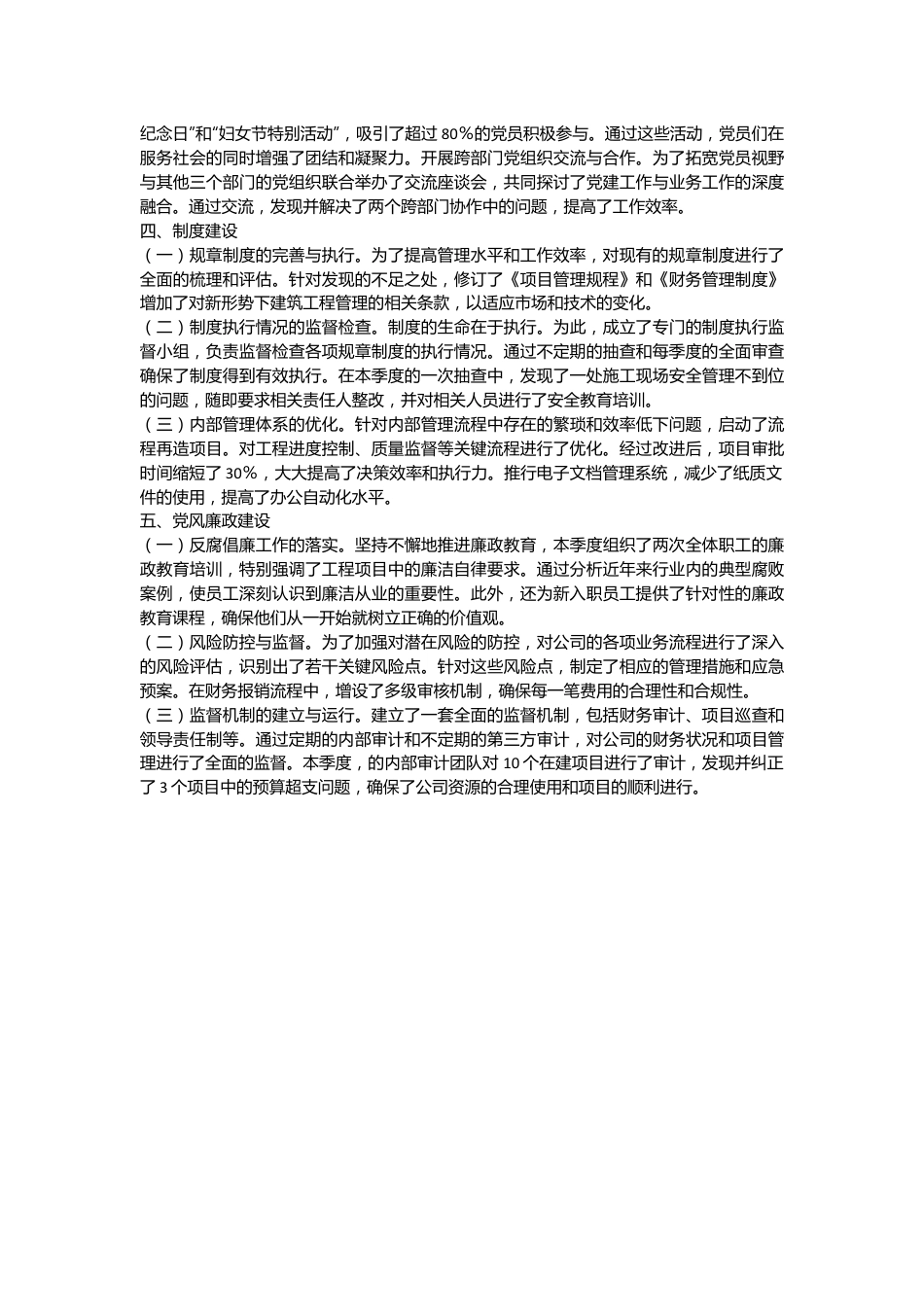 企业一季度党支部工作总结报告根据工作安排,现将XX企业党支部一季度党支部思想建设、政治建设、组织建设、制度建设、反腐倡廉建设方面的工作报告如下。一、思想建设(一)党的理论学习方面。一季度,组织了多次党的理论学习活动,重点学习了习近平新时代中国特色社会主义思想和党的XX大精神。学习形式多样,包括集中讲座、在线学习小组和自主学习等。特别是通过开展“每周一课”活动,确保每位党员每周至少投入2小时进行理论学习。为了检验学习效果,设立了理论学习考核机制,通过书面考试和实践活动相结合的方式对党员的学习成果进行评估。结果显示,98%的党员通过了理论学习考核,其中优秀率达到了30%。(二)思想政治工作方面。定期开展思想政治教育,强化党员的理想信念。通过组织观看红色电影、参观革命纪念馆等活动,使党员在重温革命历史的同时,坚定了信仰和信念。邀请了两位退役军人来讲述他们的亲身经历,使党员们受到了深刻的爱国主义教育。为了更好地了解党员的思想动态,建立了党员思想汇报制度和定期谈心谈话机制。及时帮助困难党员解决实际困难和思想困惑。二、政治建设(一)坚持党的领导。坚定不移地贯彻党的领导核心作用,确保所有重大决策和日常管理工作都符合党的方针政策。在项目招投标过程中,成立了由党支部书记领导的监督小组,确保每个环节都公正透明,严格执行国家的法律法规。为确保政策的有效执行,建立了政策传达和反馈机制。每次中央和地方出台新政策后,都会在第一时间内组织学习和解读,确保每位党员都能准确理解和执行。在执行过程中,还设立了意见收集箱和在线反馈平台鼓励党员提出执行中的问题和建议,以便及时调整和优化工作方案。(二)严守政治纪律与政治规矩。严格执行党的政治纪律,要求每位党员都要自觉遵守。通过开展“守纪律、讲规矩”主题教育活动,强化了党员的纪律意识。在此期间,对违反政治纪律的行为零容忍,一经发现立即处理,确保了党组织的纯洁性。加强政治监督的方法与成效。加强了对党员的政治监督,特别是对领导干部的监督。通过建立健全的日常监督和巡视监督体系,对党员干部的权力运行进行了有效监控。例如,对一个项目的负责人进行了专项巡视,发现了其在材料采购中的违规行为,并及时进行了纠正和处理,有效地防止了不良行为的蔓延。三、组织建设(一)党员发展与管理。在一季度,重视新党员的发展工作,通过制定详细的发展计划和培养机制,吸收了1名优秀员工加入党组织。为新党员配备了经验丰富的老党员作为入党导师,进行了至少20小时的党课教育和实践锻炼,确保他们在思想上和行动上都能够快速融入党组织。针对党员的不同需求,设计了多层次的教育培训计划。本季度共开展了3场专题培训,涵盖了党的历史、党章党规、职业道德等内容,平均每场培训参与人数达到50人以上。(二)组织生活会的开展情况。本季度共召开组织生活会4次,每次会议都有超过90%的党员参与。会议内容包括学习党的最新理论成果、讨论工作中的实际问题以及相互批评与自我批评。特别是在第三次组织生活会中,邀请了外部专家就建筑行业的发展趋势进行了深入交流,提升了党员的行业敏感度和前瞻性。(三)党内活动与交流。成功举办了3次主题党日活动,包括“迎春节志愿服务”、“学雷锋纪念日”和“妇女节特别活动”,吸引了超过80%的党员积极参与。通过这些活动,党员们在服务社会的同时增强了团结和凝聚力。开展跨部门党组织交流与合作。为了拓宽党员视野与其他三个部门的党组织联合举办了交流座谈会,共同探讨了党建工作与业务工作的深度融合。通过交流,发现并解决了两个跨部门协作中的问题,提高了工作效率。四、制度建设(一)规章制度的完善与执行。为了提高管理水平和工作效率,对现有的规章制度进行了全面的梳理和评估。针对发现的不足之处,修订了《项目管理规程》和《财务管理制度》增加了对新形势下建筑工程管理的相关条款,以适应市场和技术的变化。(二)制度执行情况的监督检查。制度的生命在于执行。为此,成立了专门的制度执行监督小组,负责监督检查各项规章制度的执行情况。通过不定期的抽查和每季度的全面审查确保了制度得...