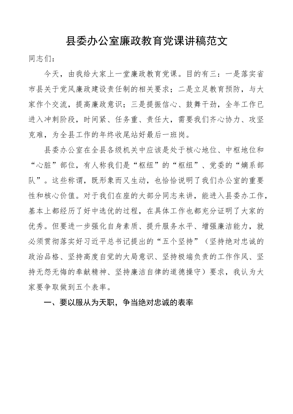 县委办公室廉政教育党课讲稿范文同志们:今天,由我给大家上一堂廉政教育党课。目的有三:一是落实省市县关于党风廉政建设责任制的相关要求;二是立足教育预防,与大家作个交流,提高廉政意识;三是提振信心、鼓舞干劲,全年工作已进入冲刺阶段,时间紧、任务重、责任大,需要我们齐心协力、攻坚克难,为全县工作的年终收尾站好最后一班岗。县委办公室在全县各级机关中应该是处于核心地位、中枢地位和“心脏”部位,有人称我们是“枢纽”的“枢纽”、党委的“嫡系部队”。这些称谓,既形象而又生动,也恰恰说明了我们办公室的重要性和核心价值。对于我们在座的大部分同志来讲,能进入县委办工作,基本上都经历了好中选优的过程,在具体工作也都充分证明了大家的优秀。但要进一步强化自身素质、提升服务水平、增强廉洁能力,就必须贯彻落实好习近平总书记提出的“五个坚持”(坚持绝对忠诚的政治品格、坚持高度自觉的大局意识、坚持极端负责的工作作风、坚持无怨无悔的奉献精神、坚持廉洁自律的道德操守)要求,我认为大家要争取做到五个表率。一、要以服从为天职,争当绝对忠诚的表率忠诚是对所效忠的国家、人民、事业、上级等真心诚意、尽心尽力,代表着诚信、守信和服从。在当今社会,我们虽然很少面临生与死的考验,但并不是忠诚就没了考量的标准。在平时工作生活中,大家自我检查一下,能否在感情上毫不保留地热爱党?能否思想上毫不含糊地拥护党?能否在行动上毫不犹豫地追随党?对于我们办公室的党员干部,扪心自问,面对组织安排的工作部署,有没有迎难而退、牢骚怨言的情况?面对领导交办的工作任务,有没有推诿扯皮、争功诿过的情况?作为服务县委的核心部门,更加要求我们要有绝对忠诚于党的政治品质,以思想自觉引领行动自觉。要有绝对忠诚于事业的价值取向。忠诚不是说在嘴上,而应当是放在心中,落实到行动上。也许有些单位干多干少一个样,但在两办、组织部这样的单位干多干少肯定不一样,上班谁来的早,下班谁离开的晚,晚上谁在加班,假日谁在值班,平时谁在一线,哪些同志工作随叫随到、不推诿,高效率高质量完成,都能甄别、都有数,因为同事、领导、组织都看得见,能感觉到。二、要以大局为根本,争当勤学善思的表率“不谋万世者,不足谋一时;不谋全局者,不足谋一域。”办公室作为县委的参谋决策机关,如果工作仅仅停留在表面,不围绕大局、聚焦大局、服务大局,就不可能因势而谋、应势而动、顺势而为,必将导致工作处处被动。作为办公室的一员,就要勤学善思,善于从全局和整体的高度把握形势、分析问题、抓好工作。一要养成学习思考的习惯。大脑就像一部机器,学习就像给机器充电,思考就像推动机器运行,不充电,机器就难以高效运行,不运行,机器就会生锈。现在知识的更新周期越来越短,我们只有把学习思考当做一种政治责任、作为一种精神追求,养成一种日常习惯,才不至于被日新月异、瞬息万变的社会所淘汰。就我自己而言,每天忙于事务、协调统筹,但也要抽出点时间来,从书上、新闻和身边人的谈话汲取新鲜知识。我还注意到,每周学习例会的时候,还是有部分同志会悄悄玩手机,办公室组织大家学习,互相交流思想,也是从大家不多的时间里挤出来的时间,下次希望玩手机的同志来给我们讲讲手机给他带来什么知识,独乐乐不如众乐乐嘛,大家也都来学习。再说,学习时玩手机本来就是工作不认真、对讲课人不尊重的表现。二要提升学习思考的能力。学习思考能力是党员干部能力素质的基础,直接决定工作的质量和效益。办公室服务大局,就要求我们站位要高、敏锐性要强,准确把握中央和省、市、县委的决策部署,通过广泛的学习借鉴、思考创新,用新思路、新办法破解新的难题。我们由于岗位、阅历,不能站在领导的角度,但我们要想办法缩小这个差距。所以说,我们办公室的同志平时关心大局的意识、思考全局工作的自觉还是不够,要在平常工作生活中,进一步有意识地加强锻炼,充分发挥好“参谋部”的作用。三要找准学习思考的方向。一个人的成功,既要看你使了多少劲,更要看你在哪儿使劲。方向不对,就会南辕北辙,越努力越尴尬。在这个知识爆炸、科技更新、理念换...