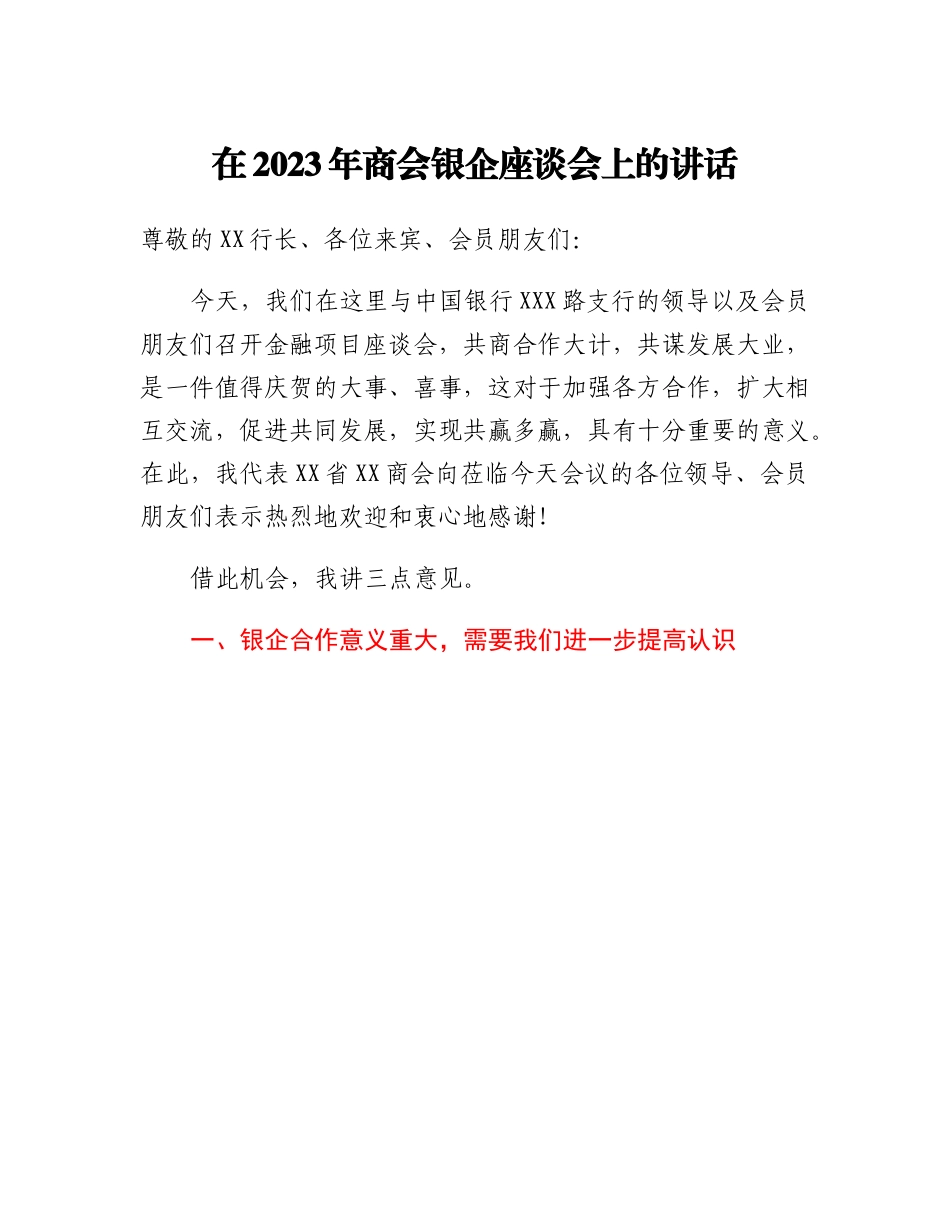 在2023年商会银企座谈会上的讲话尊敬的XX行长、各位来宾、会员朋友们:今天,我们在这里与中国银行XXX路支行的领导以及会员朋友们召开金融项目座谈会,共商合作大计,共谋发展大业,是一件值得庆贺的大事、喜事,这对于加强各方合作,扩大相互交流,促进共同发展,实现共赢多赢,具有十分重要的意义。在此,我代表XX省XX商会向莅临今天会议的各位领导、会员朋友们表示热烈地欢迎和衷心地感谢!借此机会,我讲三点意见。一、银企合作意义重大,需要我们进一步提高认识省委省政府审时度势,制定一系列“惠企纾困”等政策,就是为了推动非公有制经济加快发展,进一步激发非公有制经济的创新能力和竞争能力。这些政策和措施,为我们进一步加快金融业和非公企业发展,加强银企合作,提供了难得的历史机遇。在这样一个新的形势下,如何建立一种新型的银企合作关系,促进银企更好更快发展,已成为各级政府、金融机构和商会企业必须引起高度重视并认真研究的重大课题。要解决好这一课题,必须以全新的理念和视角,进一步深化加强银企合作重要性的认识。加强银企合作,是加快经济发展的战略选择;是培育市场主体的根本出路。发展经济学理论的最新研究成果表明,金融发展是经济发展的重要动因,在一定条件下,金融决定经济,金融是现代经济的核心。二、切实认清发展形势,抢抓加快发展的大好机遇2023年,是贯彻落实党的XX大精神开局之年,是实施“十四五”规划承上启下的关键之年,同时也是全省锚定“两个确保”,实施“十大战略”的关键之年。目前,我会会员单位共有XXX多家,其中规模以上企业XX多家,产业涵盖绿色食品、生物制药、旅游产品、来料加工等。党的XX大胜利召开以来,随着经济政策的利好,市场走势振奋人心,我们对未来的发展充满信心。在新的历史时期,谁抓住机遇,谁就赢得主动;谁善于用好机遇,谁就领先一步。今天我们召开金融项目座谈会,就是希望我们双方抢抓机遇做大做强,要加快金融项目融合步伐,争取早日达成合作。三、尽职尽责搞好服务,努力营造一流的发展环境我们将进一步加强服务型商会建设,为银行、企业营造良好的发展环境。进一步加强银企联系,畅通渠道,及时排忧解难。切实加强“等不起”的紧迫感、“慢不得”的危机感和“坐不住”的责任感,充分发扬“5+2”、“白+黑”的工作作风,全力以赴为银行、企业服好务,提高成交效率。朋友们、同志们,我省经济社会处在又好又快发展的关键时期,银企合作的空间还十分广阔,希望银企双方以这次座谈会为新的起点,进一步加强沟通联系,密切合作,携手共进,共谋发展,互利共赢。我们坚信,有中国银行的大力支持,有XX商会企业的自身发展壮大,银企合作一定会创造更加辉煌的业绩。谢谢大家!