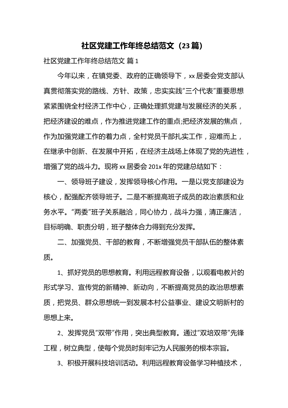 社区党建工作年终总结范文(23篇)社区党建工作年终总结范文篇1今年以来,在镇党委、政府的正确领导下,xx居委会党支部认真贯彻落实党的路线、方针、政策,忠实实践“三个代表”重要思想紧紧围绕全村经济工作中心,正确处理抓党建与发展经济的关系,把经济建设的难点,作为推进党建工作的重点;把经济发展的焦点,作为加强党建工作的着力点,全村党员干部扎实工作,迎难而上,在继承中创新、在发展中开拓,在经济主战场上体现了党的先进性,增强了党的战斗力。现将xx居委会201x年的党建总结如下:一、领导班子建设,发挥领导核心作用。一是以党支部建设为核心,配强配齐领导班子。二是不断提高班子成员的政治素质和业务水平。“两委”班子关系融洽,同心协力,战斗力强,清正廉洁,目标明确、职责分明,班子整体合力得到充分发挥。二、加强党员、干部的教育,不断增强党员干部队伍的整体素质。1、抓好党员的思想教育。利用远程教育设备,以观看电教片的形式学习、宣传党的新精神、新动向,不断提高党员的政治思想素质,把党员、群众思想统一到发展本村公益事业、建设文明新村的思想上来。2、发挥党员“双带”作用,突出典型教育。通过“双培双带”先锋工程,树立典型,使每个党员时刻牢记为人民服务的根本宗旨。3、积极开展科技培训活动。利用远程教育设备学习种植技术,开展对党员、群众的培训,同时建立党员联系制度,帮助贫困户加快致富,不断强化党员带领群众致富的能力。4、加强后备干部的培养。今年共发展预备党员2名,党员转正2名,并从党员队伍中选有文化、有知识的党员作为后备干部。三、加强制度建设,严格按章办事。建立健全各项管理制度、议事规则和决策程序,坚持定期召开支部会制度,坚持党务、村务、财务公开制度和村民代表会议制度,按照合法、实效的原则,完善村民自治制度,建立健全村规民约,进一步密切党群关系,为群众解决实际问题。以创先争优活动为契机,加强村组织建设。四、推进科技进步,加大调整产业结构,增加农民收入。进一步巩固和发展科技对农业的贡献率,加大科技投入力度,发展经济有明确的好路子。充分利用土地资源优势,在稳定农业种植的前提下,鼓励农户搞副业,进一步实现了农业增产、农民增收的目的。通过一年的党建工作开展,我党支部意识到:1、创新意识是关键。没有创新,就没有进步。从开展“创先争优”活动以来,xx居委会党组织队伍的业务素质显著提高,一条重要的经验就是坚持创新。在不断创新过程中,为党的各项工作增添了无限的生机和活力,广大党员干部的积极性在党建创新活动中得到迸发。创新活力使党员队伍不断壮大,干部素质得到普遍提高,在创先争优活动中扩大了党的群众基础,对于提升全村党建工作水平,起到了极为重要的作用。面临新时期、新要求,本村还必须把创新作为一项战略性措施,放到更加突出的位置,以主动的态度、改革的精神,探索新方法、开辟新途径,以更积极的态度去推进创先争优活动继续开展。2、责任意识是根本。多年来,本村在抓党建工作中感觉到,如果职责不清,责任意识不强,党建工作就落实不力,抓党建促经济的效果就不明显。如:有的书记不了解党员队伍情况和干部思想动态,就工作而抓工作;有的满足于工作布置,不注意抓具体的督促指导,工作浮在面上,问题没有得到解决。结果往往是党建工作经不起检查,活动内容流于形式。针对这种情况,xx居委会在抓党建中夯实了“四个职责”,强化领导责任。第一,要求书记必须树立不抓党建是失职、抓不好党建是不称职的观念,并带动和督促党委一班人认真履行党要管党的职责。第二,要求全体党员加强业务学习,提高业务工作水平,用足够的时间和精力去抓组织建设,一件一件地办好党委和组织部交给我们的党建工作业务。3、落实意识是核心。“千重要,万重要,抓落实最重要”。基层党建工作头绪多,任务重,责任大。要出色完成各项工作任务,关键就在于全神贯注抓落实,在落实中出成效。在这块工作中,受主客观条件的制约,本村的工作存在不足。在201x年,xx居委会将重点抓好落实工作,使党建工作真正落到实处。4、团结意识是保证。团结是取得事业胜利、工作顺心的保证...