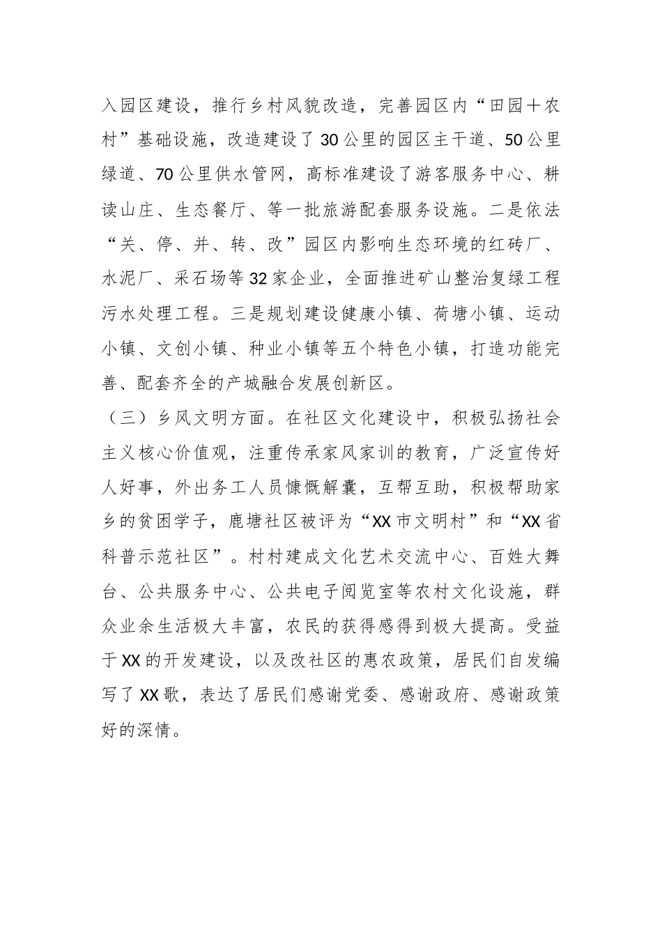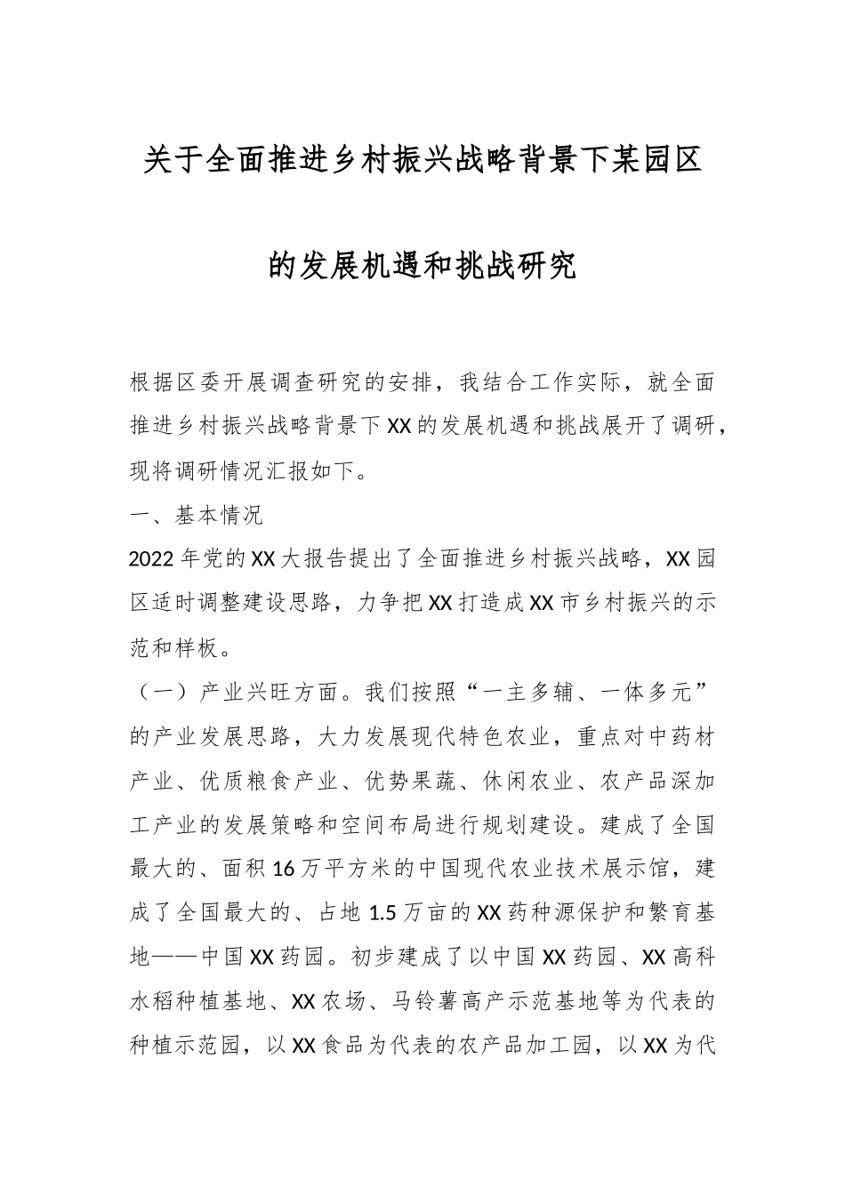 关于全面推进乡村振兴战略背景下某园区的发展机遇和挑战研究根据区委开展调查研究的安排,我结合工作实际,就全面推进乡村振兴战略背景下XX的发展机遇和挑战展开了调研,现将调研情况汇报如下。一、基本情况2022年党的XX大报告提出了全面推进乡村振兴战略,XX园区适时调整建设思路,力争把XX打造成XX市乡村振兴的示范和样板。(一)产业兴旺方面。我们按照“一主多辅、一体多元”的产业发展思路,大力发展现代特色农业,重点对中药材产业、优质粮食产业、优势果蔬、休闲农业、农产品深加工产业的发展策略和空间布局进行规划建设。建成了全国最大的、面积16万平方米的中国现代农业技术展示馆,建成了全国最大的、占地1.5万亩的XX药种源保护和繁育基地——中国XX药园。初步建成了以中国XX药园、XX高科水稻种植基地、XX农场、马铃薯高产示范基地等为代表的种植示范园,以XX食品为代表的农产品加工园,以XX为代表的农产品物流园,以XX现代农业技术展示馆、XX石斛园等为代表的农业观光园,以XX花园为代表的辐射带动园。(二)生态宜居方面。一是整合全市共XX亿元财政资金投入园区建设,推行乡村风貌改造,完善园区内“田园+农村”基础设施,改造建设了30公里的园区主干道、50公里绿道、70公里供水管网,高标准建设了游客服务中心、耕读山庄、生态餐厅、等一批旅游配套服务设施。二是依法“关、停、并、转、改”园区内影响生态环境的红砖厂、水泥厂、采石场等32家企业,全面推进矿山整治复绿工程污水处理工程。三是规划建设健康小镇、荷塘小镇、运动小镇、文创小镇、种业小镇等五个特色小镇,打造功能完善、配套齐全的产城融合发展创新区。(三)乡风文明方面。在社区文化建设中,积极弘扬社会主义核心价值观,注重传承家风家训的教育,广泛宣传好人好事,外出务工人员慷慨解囊,互帮互助,积极帮助家乡的贫困学子,鹿塘社区被评为“XX市文明村”和“XX省科普示范社区”。村村建成文化艺术交流中心、百姓大舞台、公共服务中心、公共电子阅览室等农村文化设施,群众业余生活极大丰富,农民的获得感得到极大提高。受益于XX的开发建设,以及改社区的惠农政策,居民们自发编写了XX歌,表达了居民们感谢党委、感谢政府、感谢政策好的深情。(四)治理有效方面。建立网格化管理制度,按照“一人一格、综合履职”等原则,定人、定格、定责,网格员专员,定期不定期主动上门问询、搜集村民急需的各类服务项目,为村民解决生产生活的各类难题。建立健全村委议事制度,做到“公正、公平、公开”,深入广泛的开展党的群众路线教育工作,加强党、政府与群众之间的联系。(五)生活富裕方面。一是坚持园区建设、企业发展、农民得利的原则,强化农民利益联结机制,保障农民从园区建设和发展获得丰厚收益。使农民实现土地流转金、薪金股金、房屋租金、养老保险金“五金”收入。二是引导返乡下乡人员创业创新。采取“创业+技能”的培训方式,开设农民工返乡和贫困人口创业、农业技术、农产品经营等培训项目,对XX市、园区及周边返乡下乡人员创业培训,不断提高农民的创业技能,拓宽农民的致富渠道。二、存在问题(一)主导产业还不够明显。园区现已经集合了一批中草药、优质粮食、特色果蔬、休闲农业、农产品深加工等企业,但企业规模还比较小,主推的XX药产业,种植规模还不够大,产值还不够高。(二)基础设施还不够完善。园区规划范围大、面积广,鹿塘社区作为最早建成的核心区,基础设施较为完备,风貌改造程度较高,与之相比的其他社区基础设施水平、风貌改造程度还不够高,与休闲旅游乡村的要求还有差距。(三)自建自治能力还不够强。少数群众参事议事程度还不够高,“等、靠、要”思想严重,对当前实行的一些政策还不够理解,对政府工作还不够支持,如征地拆迁、三清三拆、环境综合执法等,使得政策全面推进、项目推进存在一定阻力。(四)农民增收渠道还不够多。园区居民早早就实现了“五金”收入,2022年,XX核心区农民人均可支配收入21536元,远远高于XX省区内标准,但对标对高,距离发达地区还有明显差距。四、下一步工作措施(一)要继续做强XX药特色产业,促进三产有机融合。一是联合园区...