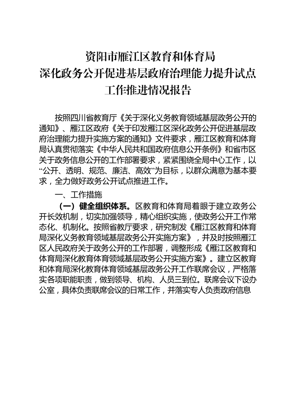 按照四川省教育厅《关于深化义务教育领域基层政务公开的通知》、雁江区政府《关于印发雁江区深化政务公开促进基层政府治理能力提升实施方案的通知》文件要求,雁江区教育和体育局认真贯彻落实《中华人民共和国政府信息公开条例》和省市区关于政务信息公开的工作部署要求,紧紧围绕全局中心工作,以“公开、透明、规范、廉洁、高效”为目标,以群众满意为基本要求,全力做好政务公开试点推进工作。一、工作措施(一)健全组织体系。区教育和体育局着眼于建立政务公开长效机制,切实加强领导,精心组织实施,使政务公开工作常态化、机制化。按照省教厅要求,研究制发《雁江区教育和体育局深化义务教育领域基层政务公开实施方案》,并及时按照雁江区人民政府关于政务公开的工作部署,调整形成《雁江区教育和体育局深化教育体育领域基层政务公开实施方案》。建立区教育和体育局深化教育体育领域基层政务公开工作联席会议,严格落实各项职能职责,做到领导、机构、人员三到位。联席会议下设办公室,具体负责联席会议的日常工作,并落实专人负责政府信息公开工作。(二)明确工作任务。按照要求,结合雁江教育实际,形成《资阳市雁江区教育和体育局政府公开信息目录》、《雁江区义务教育领域基层政务公开标准目录》、《雁江区教体局深化政务公开促进基层政府治理能力提升计划分解表》,进一步明确政务公开工作目标,将工作任务细化到对应业务股室,并下达目标任务,推进深度挖掘应公开信息,切实做到应公开、尽公开。组织机关职工学习《政府信息公开条例》,增强政务公开基本知识储备,提升公开意识。(三)完善制度保障。区教育和体育局结合工作实际,明确政府信息公开的指导思想、公开原则、组织机构、工作职责、工作目标和工作要求等,制定政务公开“一岗双责”、重大行政决策预公开、政务开放日等8项制度,同时严格执行信息依申请公开办法、信息公开保密审核办法、违反信息公开规定行为责任追究办法等政府信息公开工作制度。(四)拓宽发布渠道。通过区政府门户网公开相关政策文件、教育体育发展情况、教师队伍建设、学校建设、民办学校管理、财务信息、疫情防控、校园安全等信息;利用宣传专栏、集中发放宣传资料、学校配合宣传等方式对教育招生、学生资助、校外培训机构管理等进行宣传、解读。与新闻媒体建立长期友好合作关系,在招生、开校、落实上级教育政策等方面进行正面宣传和引导,积极回应群众关心的热点、难点问题,借助新媒体树立好对外形象,扩大雁江教育体育在区内区外的影响。二、经验做法(一)形成推进合力。对照雁江区深化政务公开促进基层政府治理能力提升实施方案,结合单位实际逐条认领工作任务,并将任务分解到机关对应股室,形成齐抓共管的工作合力。试点工作开展以来,各股室安排1名具体的工作人员来配合完成政务公开工作的相关任务,机关办公室牵头,各股室人员配合,调动大家积极性,主动收集发布法定公开内容,工作成效较为明显。(二)抓住公开重点。围绕教育热点、难点加强宣传,广泛公开群众想要知晓、了解的相关信息,通过政务公开渠道提升教育知晓度、满意度。做好招生信息公开及宣传,做到办学条件、招生政策、招生计划、招生范围、招生程序、招生方式、收费标准、招生结果“八公开”,教育主管部门统一制定并发布招生指南,宣传、解释招生政策;主动公开雁江区教体局权责清单,规范公开运行行政权力,共有行政权力事项78项,全程网办率100%,配置“一件事”7项、镇(街道)法定权力事项8项,下放镇(街道)事项3项,2022年受理依申请事项418件,切实推进权力在阳光下的公开运行。(三)提升工作实效。将政府门户网站政府信息公开作为主渠道,紧抓政策、机构信息等11个主栏目,行政规范性文件、财政预决算等14个子栏目,逐一核查每个栏目的更新情况,进行查漏补缺,做到实时更新。截止目前,共计发布信息341条,其中政策栏目118条、机构信息栏目23条、财政预决算7条、行政事业性收费14条、采购招标14条、项目投资15条、招考录用18条、重大民生信息42条、其他法定信息90条。三、存在的问题及下一步工作打算雁江区教育和体育局自接到工作任务以来,高...