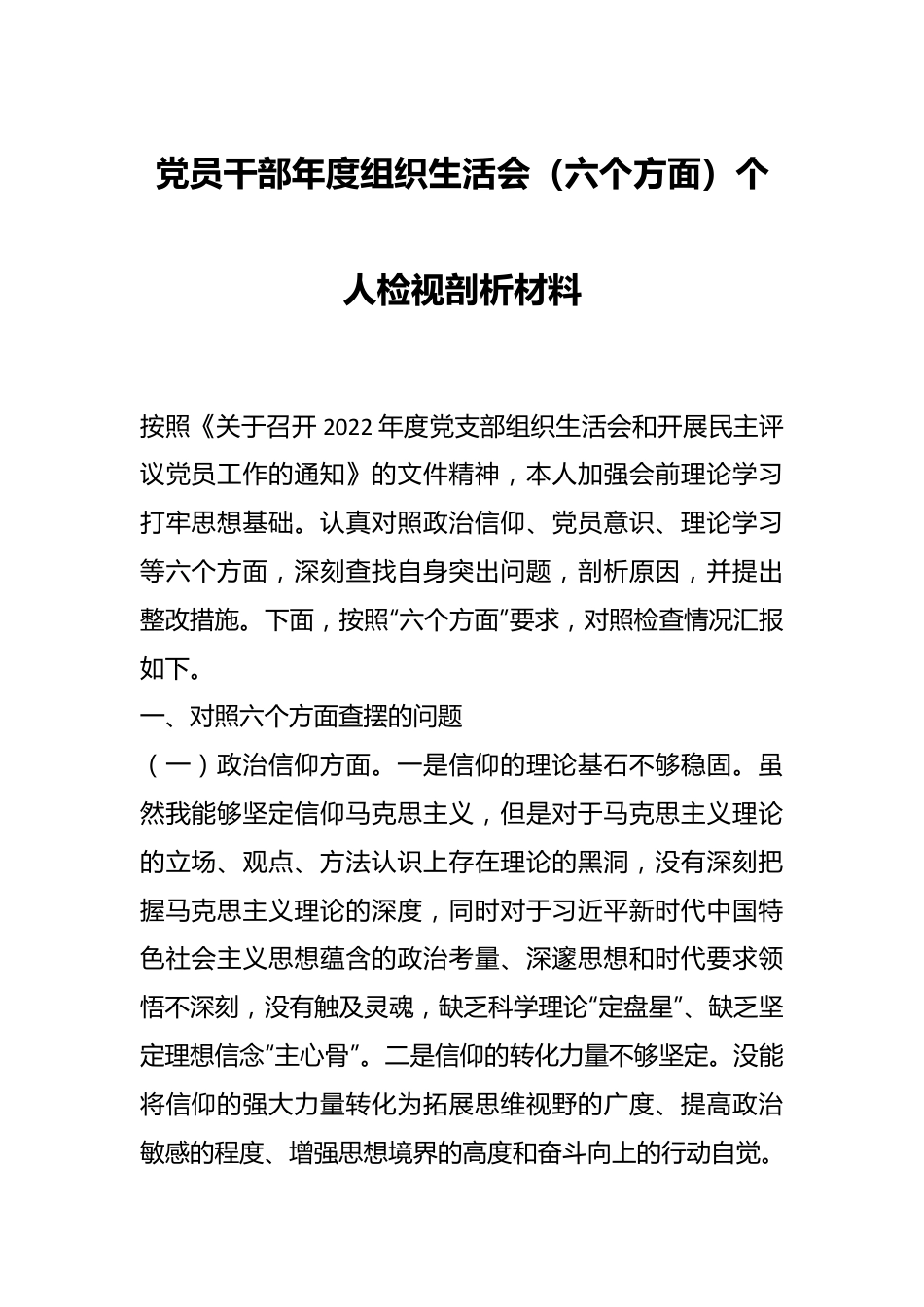 党员干部年度组织生活会(六个方面)个人检视剖析材料按照《关于召开2022年度党支部组织生活会和开展民主评议党员工作的通知》的文件精神,本人加强会前理论学习打牢思想基础。认真对照政治信仰、党员意识、理论学习等六个方面,深刻查找自身突出问题,剖析原因,并提出整改措施。下面,按照“六个方面”要求,对照检查情况汇报如下。一、对照六个方面查摆的问题(一)政治信仰方面。一是信仰的理论基石不够稳固。虽然我能够坚定信仰马克思主义,但是对于马克思主义理论的立场、观点、方法认识上存在理论的黑洞,没有深刻把握马克思主义理论的深度,同时对于习近平新时代中国特色社会主义思想蕴含的政治考量、深邃思想和时代要求领悟不深刻,没有触及灵魂,缺乏科学理论“定盘星”、缺乏坚定理想信念“主心骨”。二是信仰的转化力量不够坚定。没能将信仰的强大力量转化为拓展思维视野的广度、提高政治敏感的程度、增强思想境界的高度和奋斗向上的行动自觉。(二)党员意识方面,我能够时刻牢记党员身份、自觉履行党员义务,按时足额缴纳党费,查摆中发现。一是砥砺初心有“温差”。由于没有经过严格的党内政治生活历练,缺少大风大浪的考验,个人主义、实用主义、功利主义比较严重;不愿为党、国家和人民做出无私的奉献与牺牲,更注重生活享受,追求个人和家庭的安逸;政治意识不强、政治担当不够,在关键时刻顶不上、靠不住。二是奋楫笃行有“偏差”。只想当官不想干事,只想揽权不想担责,奉行“等、靠、推、拖、躲、绕”六字诀,层层请示、层层画圈,存在守摊思想,缺乏党员应有的攻坚克难精神和勇于奋进的意识,小成即满,看不到问题,自我感觉良好,裹足不前。(三)理论学习方面,2022年,我通过集体学习和个人自学,系统学习了《习近平谈治国理政》第四卷以及党的XX大报告全文、《党章》,密切关注党的创新理论,认真学习习近平总书记在新疆、辽宁、陕西等地考察时以及在五四青年节、省部级领导干部培训班等重要时间节点发表的重要讲话等内容,牢记习总书记对当代青年的殷勤嘱托。但仍然存在:一是学习成效不明显。个人自学时间难以保证,集体自学多是领导宣读学习文件、观看视频、贯彻讲话内容等,缺乏必要的交流与沟通,难以检视学习效果,也导致学习的而积极性不高。二是学用结合不紧密。把创新思想融入决策过程、改进工作指导、检验末端成效,结合还不够紧密。在实际学习中,往往是学习管学习、实践管实践,理论联系实际不够,运用理论指导实践的能力欠缺,学用脱节的现象比较突出。(四)能力本领方面。一是服务大局的意识不够强。没有把自身岗位工作放到社会发展的大局中去思考、去谋划、去落实,自身的工作节奏与区域发展还不协调,在创新举措及时响应方面、站位不高。性格偏于内向,工作泼辣劲不够,遇事有点畏首畏尾,勇于提出创新性意见不多,在谋长远、谋发展上缺乏好的意见建议,变中求新、新中求效的意识不强,造成了工作起色不大,进步不明显。二是防范化解风险挑战的能力不够,对一些推进难度大的工作,主动向上级领导报告汇报,争取支持的力度还不够大,面对经济发展新常态,社会治理新趋势,和党风廉政建设新要求,攻坚克难的锐气和任事担当的魄力不够,以身作则示范带动的作用发挥不明显,对一些难度大,解决起来疑难复杂的事情考虑困难多、客观因素影响多,主动解决少用改革和创新解决问题的能力不足。(五)作用发挥方面。一是自我要求有所放松。在工作思路、工作能力、工作方式等方面,有时凭经验,按部就班用一般的工作纪律、工作要求代替了先进性要求,没有时刻以最高标准严格要求自己,工作水平与上级的要求还存在差距,自身能力建设还需进一步加强。实干内生动力不足。私心较重,过于计较个人得失,面对很多工作表现得畏畏缩缩,缺乏果断的胆量,嘴上说得多,实际行动少,只把工作当作应付式的形象工程。二是自身工作还存在漏洞。长时间以来自己在工作上下了很大功夫,经历了不同的岗位,自认为对单位的一切都比较熟悉,所以工作按部就班,只是循序渐进地处理日常事务,因此在理念思路、方法措施等方面,与新形势下抓好管理工作要求还存在差距,创...