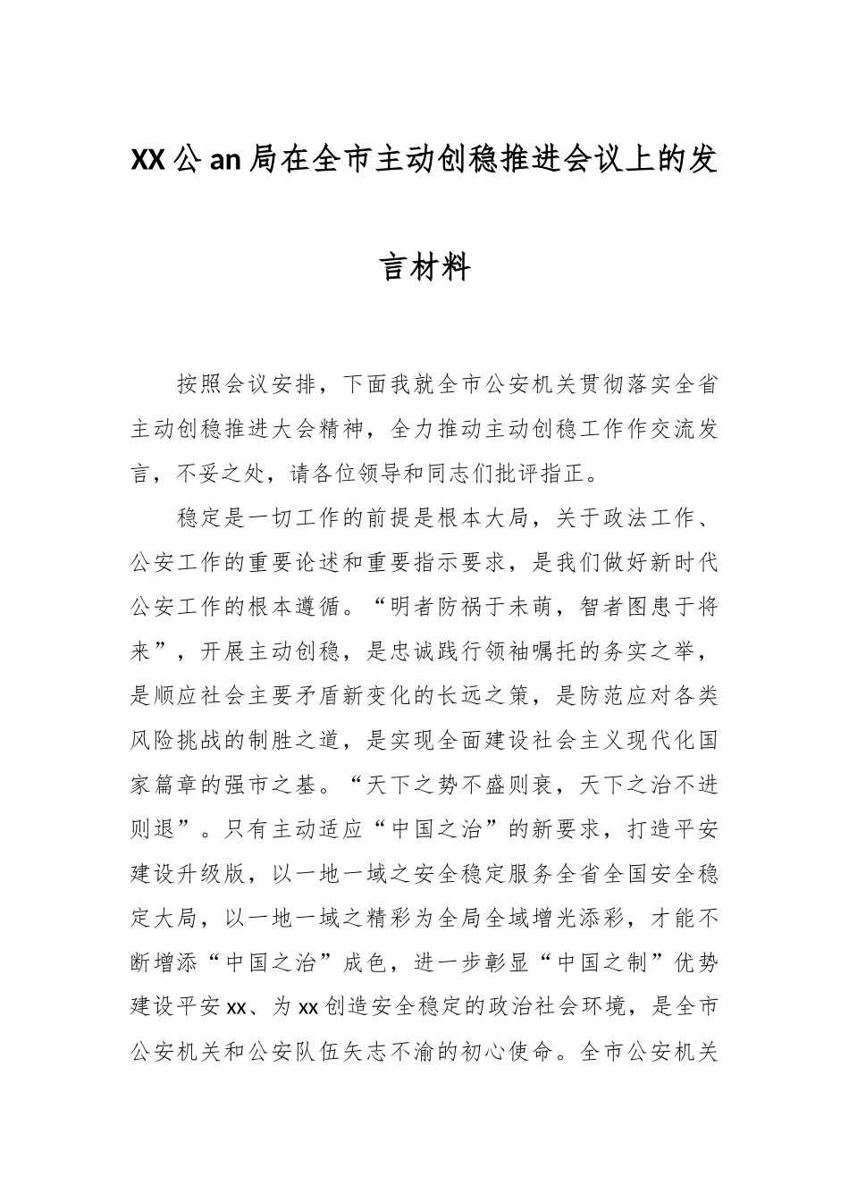 XX公an局在全市主动创稳推进会议上的发言材料按照会议安排,下面我就全市公安机关贯彻落实全省主动创稳推进大会精神,全力推动主动创稳工作作交流发言,不妥之处,请各位领导和同志们批评指正。稳定是一切工作的前提是根本大局,关于政法工作、公安工作的重要论述和重要指示要求,是我们做好新时代公安工作的根本遵循。“明者防祸于未萌,智者图患于将来”,开展主动创稳,是忠诚践行领袖嘱托的务实之举,是顺应社会主要矛盾新变化的长远之策,是防范应对各类风险挑战的制胜之道,是实现全面建设社会主义现代化国家篇章的强市之基。“天下之势不盛则衰,天下之治不进则退”。只有主动适应“中国之治”的新要求,打造平安建设升级版,以一地一域之安全稳定服务全省全国安全稳定大局,以一地一域之精彩为全局全域增光添彩,才能不断增添“中国之治”成色,进一步彰显“中国之制”优势建设平安xx、为xx创造安全稳定的政治社会环境,是全市公安机关和公安队伍矢志不渝的初心使命。全市公安机关将坚定坚决贯彻落实省委、市委总体部署,全面贯彻总体国家安全观,坚持以人民为中心的发展思想,始终将主动创稳作为“头等大事”,坚决扛起公安使命,彰显公安特色,展现公安作为,打好创稳主动仗,打造创稳新引擎,为全面建设社会主义现代化国家嘉峪关篇章开好局起好步创造安全稳定的政治社会环境。1.坚持凝心铸魂,努力在坚决做到“两个维护”上奋发有为。全市公安机关将牢牢把握公安机关的政治属性,坚持不懈用新时代中国特色社会主义思想凝心铸魂,深刻认识“两个确立”的决定性意义,增强“四个意识”、坚定“四个自信”、做到“两个维护”。将紧紧锚定“四个铁一般”标准,紧盯“”奋斗目标,以“主动创稳”为主抓手,以“时时放心不下”的责任感,在深入推进“主动创稳”上勇挑重担、克难攻坚,努力在“严”上用力,在“新”上发力,在“快”上加力,在“合”上聚力,切实履行好党和人民赋予的新时代公安机关职责使命。2.坚持底线思维,努力为“”提供更高品质的安全保障。坚持底线思维、增强忧患意识,下好预警预防、源头治理先手棋,全面落实防范化解重大涉稳风险各项举措,立足态势感知、预警预防、常态长效,巩固运用已有工作机制不断提高预测预警、风险化解、应急处置等能力,努力实现对风险的发生诱因与事前防范、风险的事中演进与有效控制、风险的化解与事后治理等进行全方位管理、全过程监控,实现“应急维稳”向“常态创稳”转变。打好因势而动、精准施策主动仗,动态掌握情报信息、动态研判稳定形势、动态调整应对策略,实现“静态维稳”向“动态创稳”转变,坚决守牢守好大事不出小事也不出的政治安全底线。3.坚持人民至上,努力让人民群众的安全感更触手可及。平安是民生之首,安全感是群众获得感、幸福感的前提和基础。全市公安机关将始终把人民满意作为第一标准,把群众利益放在最高位置,用好标本兼治、疏堵结合组合拳实现“单一刚性维稳”向“刚柔并济创稳”转变。不断创新群众工作方法,健全完善公共安全治理体系,推进扫黑除恶常态化,创新完善打击治理电信网络诈骗、跨境赌博等新型犯罪机制手段,依法严厉打击各类突出违法犯罪,努力从根源上解决问题,维护社会稳定。进一步把好法治引领、机制保障方向盘,实现“突击式维稳”向“法治化创稳”转变,着眼推进社会治理法治化,运用法治思想和法治方式化解矛盾、防控风险,持续推动法治公安建设提档升级,努力让人们群众在每一起案件办理、每一件事情处理中都能感受到公平正义。4.坚持专群结合,努力让新时代“枫桥经验”花开xx。人民群众是主动创稳最深厚的力量源泉。全市公安机关将奏响多元共治、协同作战大合唱,坚持和发展新时代“枫桥经验”,在市委、市政府统一领导下,强化条块结合、强化基层组织、强化群防群治,加强与职能部门之间信息互通、资源共享,推动实现资源整合、力量融合、功能集合、手段综合、效力聚合,滚动排查可能影响社会稳定的矛盾、隐患,推动落实属地管理责任、源头稳控措施和多元化解机制。深化“枫桥式公安派出所”创建活动,深入实施破小案、办小事、解小忧、帮小忙、惠小利五小工程,突...