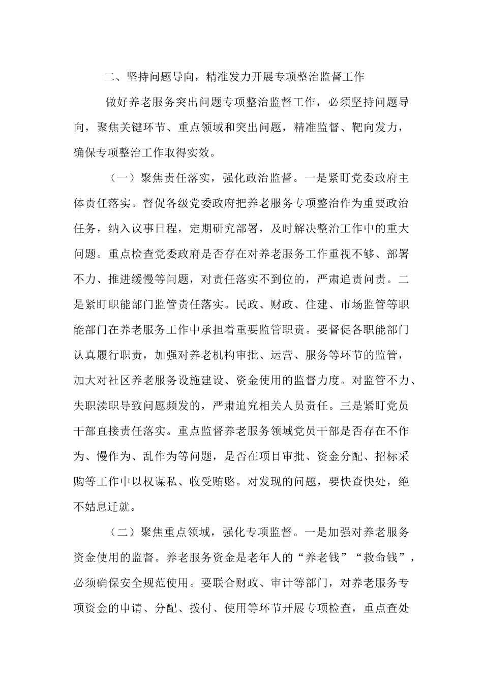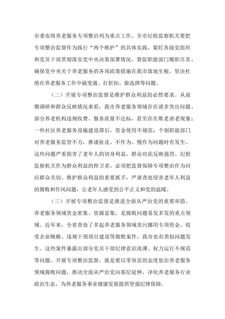 在全市养老服务突出问题专项整治工作推进会上的讲话同志们:养老服务领域的突出问题,关乎民生福祉,更关乎党和政府的形象与公信力。开展养老服务突出问题专项整治,是贯彻落实党中央、国务院关于积极应对人口老龄化战略部署的重要举措,也是推动全面从严治党向基层延伸、维护群众切身利益的必然要求。作为党内监督和国家监察专责机关,全市纪检监察系统必须提高政治站位,主动担当作为,以强有力的监督执纪问责,为专项整治工作提供坚强纪律保障。下面,我围绕监督保障专项整治工作讲三点意见。一、提高政治站位,深刻认识专项整治监督工作的极端重要性养老服务是重大民生工程,是检验各级党组织践行“两个维护”、落实以人民为中心发展思想的重要标尺。当前,我市人口老龄化程度持续加深,老年人口已达万人,占总人口的%,养老服务供需矛盾日益突出,各类问题交织叠加。纪检监察机关必须从政治高度出发,深刻认识专项整治监督工作的重要意义。(一)开展专项整治监督是践行“两个维护”的具体行动。党中央、国务院高度重视养老服务工作,习近平总书记多次就加强养老服务体系建设、维护老年人合法权益作出重要指示批示。省委、市委也将养老服务专项整治列为重点工作。全市纪检监察机关要把专项整治监督作为践行“两个维护”的具体实践,紧盯各级党组织和党员干部贯彻落实党中央决策部署情况,督促职能部门履职尽责,确保党中央关于养老服务的各项政策措施在我市落地生根,坚决杜绝在养老服务工作中搞变通、打折扣、做选择等问题。(二)开展专项整治监督是维护群众利益的必然要求。从前期调研和群众反映情况来看,我市养老服务领域存在诸多突出问题。部分养老机构违规收费、服务质量不达标,甚至存在欺老虐老现象;一些社区养老服务设施建设滞后,资金使用不规范;个别职能部门对养老服务监管不力,推诿扯皮、不作为、慢作为问题时有发生。这些问题严重损害了老年人的切身利益,群众对此反映强烈。纪检监察机关作为群众利益的捍卫者,必须把监督保障专项整治作为回应群众关切、维护群众利益的重要抓手,严肃查处侵害老年人利益的腐败和作风问题,让老年人感受到公平正义和党的温暖。(三)开展专项整治监督是推进全面从严治党的重要举措。养老服务领域资金密集、资源富集,是腐败问题易发多发的重点领域。近年来,全省查处了多起养老服务领域贪污挪用专项资金、收受企业贿赂、违规干预项目建设等腐败案件,我市也有类似问题发生。这些案件暴露出部分党员干部纪律意识淡薄、权力运行不规范等问题。开展专项整治监督,就是要以零容忍的态度惩治养老服务领域腐败问题,推动全面从严治党向基层延伸,净化养老服务行业政治生态,为养老服务事业健康发展提供坚强纪律保障。二、坚持问题导向,精准发力开展专项整治监督工作做好养老服务突出问题专项整治监督工作,必须坚持问题导向,聚焦关键环节、重点领域和突出问题,精准监督、靶向发力,确保专项整治工作取得实效。(一)聚焦责任落实,强化政治监督。一是紧盯党委政府主体责任落实。督促各级党委政府把养老服务专项整治作为重要政治任务,纳入议事日程,定期研究部署,及时解决整治工作中的重大问题。重点检查党委政府是否存在对养老服务工作重视不够、部署不力、推进缓慢等问题,对责任落实不到位的,严肃追责问责。二是紧盯职能部门监管责任落实。民政、财政、住建、市场监管等职能部门在养老服务工作中承担着重要监管职责。要督促各职能部门认真履行职责,加强对养老机构审批、运营、服务等环节的监管,加大对社区养老服务设施建设、资金使用的监督力度。对监管不力、失职渎职导致问题频发的,严肃追究相关人员责任。三是紧盯党员干部直接责任落实。重点监督养老服务领域党员干部是否存在不作为、慢作为、乱作为等问题,是否在项目审批、资金分配、招标采购等工作中以权谋私、收受贿赂。对发现的问题,要快查快处,绝不姑息迁就。(二)聚焦重点领域,强化专项监督。一是加强对养老服务资金使用的监督。养老服务资金是老年人的“养老钱”“救命钱”,必须确保安全规范使用。要联合财政、审计等部门,对养老服务专项资金的申请、...
