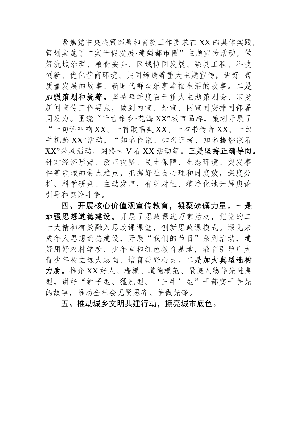 在全市宣传思想重点工作推进会上的汇报发言尊敬的XX部长,各位领导,同志们:党的二十大报告指出,“全面建设社会主义现代化国家,必须坚持中国特色社会主义文化发展道路,增强文化自信,围绕举旗帜、聚民心、育新人、兴文化、展形象建设社会主义文化强国,发展面向现代化、面向世界、面向未来的,民族的科学的大众的社会主义文化,激发全民族文化创新创造活力,增强实现中华民族伟大复兴的精神力量”。XX市以党的二十大精神为指引,聚焦“两个巩固”的根本任务,对照“举旗帜、聚民心、育新人、兴文化、展形象”的要求,在推进新时代宣传工作方面开展了一些有益的实践探索。现将有关工作进展情况汇报如下:一、用理论武装引领行动,高举思想旗帜。一是深化理论学习。以党委(党组)中心组为重点,聚焦“关键少数”,坚持读原著、学原文、悟原理,坚持学而信、学而用、学而行,把学习贯彻党的二十大精神与习近平新时代中国特色社会主义思想主题教育结合起来、与学习习近平总书记系列重要讲话结合起来,增强对习近平新时代中国特色社会主义思想的政治认同、思想认同、理论认同、情感认同。二是强化宣传教育。坚持在增强理论宣传的说服力感染力上下功夫,深入推进“两团多队”“五路大军进基层”等面向基层、面向群众的宣传宣讲,创新开展“政策理论月月讲”“讲述”等面向网民、面向观众的宣传宣讲,用群众喜闻乐见的语言和形式向群众宣讲理论,使党的理论创新成果更好地发挥释疑解惑、引领发展的作用。三是注重学用结合。坚持理论联系实际,突出问题导向、目标导向、效果导向,深入开展党委(党组)中心组“奋进实干年”的大调研活动引导广大党员干部把学习习近平新时代中国特色社会主义思想的成效转化为做好本职工作、推动XX高质量发展的实际行动。二、实施意识形态强基工程,筑牢安全屏障。一是压紧压实意识形态工作责任制。坚持统筹发展和安全并重,认真贯彻落实《党委(党组)意识形态工作责任制实施办法》,积极主动地站在意识形态工作第一线,把握方向、守住阵地、管好队伍,敢于发声、善于发声、主动发声,切实把责任扛在肩上、落到实处。二是守好守牢网络安全阵地。加快网络应急指挥中心建设,完善网络综合治理体系,持续推进网上专项行动,强化网上舆论引导和舆情监测处置,确保网络环境持续清朗干净、健康文明;强化网评队伍建设,开展“网络好作品”评选活动,做好网上正面宣传,弘扬主旋律。三是净化美化社会文化环境。强化农村文化市场监管,深入推进“扫黄打非”专项行动,依法依规严厉打击各类涉黄涉非出版传播活动,着力扫除有害信息和文化垃圾,打造良好的线上线下舆论环境。三、实施新闻外宣提质工程,提升高质量发展气场。一是突出宣传主题。聚焦党中央决策部署和省委工作要求在XX的具体实践,策划实施了“实干促发展·建强都市圈”主题宣传活动,做好流域治理、粮食安全、区域协同发展、强县工程、科技创新、优化营商环境、共同缔造等重大主题宣传,讲好高质量发展的故事、新时代群众乐享幸福生活的故事。二是加强策划和统筹。坚持每季度召开重大主题策划会、印发新闻宣传工作要点,做到内宣、外宣、网宣同安排同部署同发力。围绕“千古帝乡·花海XX”城市品牌,策划开展了“一句话叫响XX、一首歌唱美XX、一本书传奇XX、一部手机游XX”活动,“知名作家、知名记者、知名摄影家看XX”采风活动,网络大V看XX活动等。三是坚持正确导向。针对经济形势、改革攻坚、民生保障、生态环境、突发事件等领域的焦点难点,把握好社会心理和时度效,深度分析、科学研判、主动发声,有针对性、精准化地开展舆论引导和舆论斗争。四、开展核心价值观宣传教育,凝聚磅礴力量。一是加强思想道德建设。开展了思政课进万家活动,把党的二十大精神有效融入思政课课堂,创新思政课模式。深化未成年人思想道德建设,开展“我们的节日”系列活动,建好用好农村学校、少年宫和红色教育基地,教育引导广大青少年树立远大志向、培育美好心灵。二是加大典型选树力度。推介XX好人、楷模、道德模范、最美人物等先进典型,讲好“狮子型、猛虎型、‘三牛’型”干部实干争先的故事,推动全社会见...