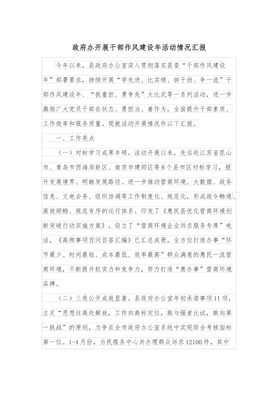政府办开展干部作风建设年活动情况汇报今年以来,县政府办公室深入贯彻落实县委“干部作风建设年”部署要求,持续开展“学先进、比实绩、拼干劲、争一流”干部作风建设年、“挑重担、勇争先”大比武等一系列活动,进一步激励广大党员干部在状态、勇担当、善作为,全面提升干部素质、工作效率和服务质量。现就活动开展情况作以下汇报。一、工作亮点(一)对标学习成果丰硕。活动开展以来,先后赴江苏省昆山市、青岛市西海岸新区、南京市建邺区等8个县市区对标学习,提升发展境界、明晰发展路径。进一步推动营商环境、大数据、政务信息、文电会务、组织协调等工作制度化、规范化,形成政令畅通、高效顺畅、规范有序的运行体系。印发了《惠民县优化营商环境创新突破行动实施方案》,设立了“营商环境企业诉求服务专席”电话,《高频事项百问百答汇编》已汇总成册,全方位打造办事“环节最少、时间最短、成本最低、效率最高”群众满意的惠民一流营商环境,不断提升软实力和竞争力,努力打造“惠办事”营商环境品牌。(二)三亮公开成效显著。县政府办公室年初承诺事项11项,立足“思想往高处解放,工作向高标定位,敢与强者比试,敢向第一挑战”的原则,力争在全市政府办公室系统中实现综合考核指标第一位。1-4月份,为民服务中心共办理群众诉求12100件,其中省级热线转办件1210件、市热线转办件10862件、县长信箱28件,按时办结率均100%,群众满意率达97.19%,列全市县区第一位。(三)“三遍访三必问”扎实开展。严格按照县委方案要求,坚持民生至上、服务发展的理念,认真深入开展“三遍访三必问”活动。制定了县府办企业走访明细表和《惠民县人民政府办公室关于开展“遍访企业”活动的方案》,采取现场调研、活动视察等多种走访形式,能现场解决的现场予以协调解决,不能现场解决的协调其他部门限期予以答复。截至目前,累计走访企业36家,发现问题6个,已全部解决。坚持用心遍访群众,对遍访中群众提出的问题建立工作台账,实行销号管理,加强与淄角镇协同配合,加快推进问题解决。截至目前,共走访淄角镇刘张村、左豹村、石张村3个村居197户,发现问题5个,已解决问题3个(石张村一个房屋漏雨和一个灌溉问题,左豹村左修泉的大门损坏问题),其余2个问题正在协调推进解决中(石张村自建自来水供水问题和胡同排水沟问题)。(四)风险排查深入推进。自干部作风建设年活动开展以来,县政府办公室先后两次开展“工作大起底,风险大排查”活动,截至目前,共查摆问题5大类,198条,已全部完成整改,以高质量、高效率展现了县政府办公室直面问题、强化整改、狠抓落实的魄力和担当。信息调研室针对问题5大项,排查出风险隐患15处,制定整改措施15条,提高了解决问题、服务决策的能力和水平。1-5月份,开展专题调研118项,均撰写调研报告上报,调度各类信息1073篇,报省府办直报信息42篇,山东政务普刊采用5篇。报市府办经验类信息41篇,市采用16篇,报市府办领导参阅12篇,市采用9篇,2篇信息获宋永祥市长签批,连续4个月政务信息排名全市第一。5月14日,受邀参加全省政务信息联系县(市、区)第三十二届网络年会并做典型交流发言,惠民经验做法得到省政府办公厅领导认可并当场表扬。(五)擂台比拼竞争火热。聚焦上级考核工作任务、科室重点工作,搭建工作“擂台”,设立“擂台榜”,推动形成你追我赶、进位争先的竞争态势。截至目前,32项工作均为绿灯,其中,政务信息在市政府办公室一季度通报中列第一名;12345热线满意率在全市排第一名;其他工作暂无排名。二、存在问题在活动开展过程中,与办公室实际工作结合的紧密度有待进一步增强,需要将活动成效进一步转化为推动工作高质量开展的实效。三、下步打算下一步,县政府办公室将以此次干部作风建设年活动为契机,围绕“聚力突破、起势成势、干在实处、走在前列”的战略定位,坚持“实”字托底、“干”字当头,持续开展干部作风建设年各项活动,为五个惠民建设贡献办公室力量。一是切实把对标学习成果转化为工作实绩。坚持把学到的先进经验做法吸收好、借鉴好、运用好,持续提升业务工作标准、规范完善制度流程。二是牵头推动“三...
