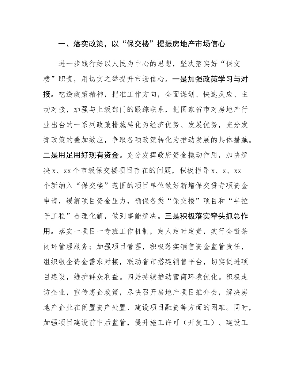 保交楼、保民生、保稳定发言材料各位领导:根据会议安排,现围绕“持续抓好保交楼、保民生、保稳定”工作汇报如下,不妥之处,敬请批评指正。近日,国务院总理李强主持召开国务院常务会议,听取了关于优化房地产政策、促进房地产市场平稳健康发展有关情况的汇报。住建部、金融监管总局联合建立了城市房地产融资协调机制,缓解房企融资压力。省市根据实际情况建立了房地产融资协调机制,来保障房地产行业健康发展。区委区政府高度重视我区房地产行业发展,专题调度了我区保交楼项目进展情况,在全区经济运行调度会上听取了关于房地产业、建筑业对全区经济发展影响的汇报,对房地产行业发展做了进一步要求和调度。按照省市区工作安排,城西区城乡建设局将紧紧锚定“走在前、作表率”目标要求,以此次党纪学习教育为契机,时刻增强机遇意识,密切关注政策动向,夯实资金基础,紧盯短板弱项,实施精准攻坚,实现城市有序建设,助推全区经济运行工作又快又好发展。一、落实政策,以“保交楼”提振房地产市场信心进一步践行好以人民为中心的思想,坚决落实好“保交楼”职责,用切实之举提升市场信心。一是加强政策学习与对接。吃透政策精神,把准工作方向,全面谋划、快速反应、主动对接,加强与上级部门的跟踪联系,把国家省市对房地产行业出台的一系列政策措施转化为经济优势、发展优势,充分发挥政策的叠加效应,争取各项政策转化为推动发展的具体措施。二是用足用好现有资金。充分发挥政府资金撬动作用,加快解决x、xx个市级保交楼项目存在的问题,积极指导x、x、xx个新纳入“保交楼”范围的项目单位做好新增保交贷专项资金申请,缓解项目资金压力,确保各类“保交楼”项目和“半拉子工程”合理化解,做到事能解决。三是积极落实牵头抓总作用。落实一项目一专班工作机制,定人定时定责,实行全链条闭环管理服务;加强项目管理,积极落实销售资金监管责任,组织银企资金需求对接,联动省市搭建销售平台,切实促进项目建设,维护群众利益。四是持续推动营商环境优化。积极走访企业,宣传惠企政策,尽快召开房地产项目推介会,解决房地产企业在闲置资产处置、建设项目融资等方面的困难。同时,加强项目建设前中后监管,提升施工许可(开复工)、建设工程消防验收审核效率,加强建筑工地日常巡查及安全生产管理工作,确保建筑领域安全发展。二、把握关键,以项目建设推动高质量发展认真做好项目调查研究,落实落细工作部署,持续拜会省市相关部门,继续争取项目政策及资金支持,加快项目落地实施。一是加快项目进程。协调好项目资金、土地、审批等要素保障,加快推进x排水管网错混接改造项目(一期)、2024年老旧小区改造等x个政府类投资的民生项目建设,尽早形成资金支出,预计全年争取专项资金x亿元,完成固投x亿元以上,为全区实现全年固定资产投资目标任务奠定坚实基础。目前,2024年老旧小区改造中,涉及中央资金的x个项目待资金下达后,第一时间发布施工招标公告,预计x月进场施工;涉及省级资金的x个项目中进入招标阶段x个,剩余x个项目已完成财政事前绩效,正在进行图纸论证及清单编制,预计x月进场施工。二是加强施工监管。以“有诉必应马上办”机制为抓手,以小切口微调研为契机,发挥“群众监理”作用,把问需于民、问计于民体现在施工现场;细化施工流程,倒排工期、挂图作战,杜绝“施工改造一封了之”的做法。强化一线检查,认真执行“周检查、旬协调、月督办”机制,统筹做好材料进场、交通组织等要素保障,积极化解群众各类诉求。三是深化发展空间。持续开展招商引资活动,通过优化方案布局、合理测算拆迁安置方案、多方位申请银行贷款、专项债券、城中村开发改造等政策支持与补贴,积极推动美丽乡村建设行动,做好x生态x小镇招商引资,推动尽快启动x沿线x、x片区城中村改造,重塑城市发展格局。三、攻坚克难,以遗留问题整改保障社会稳定积极探索化解的方法途径,多举措扎实开展化解工作,最大限度消除不和谐因素,努力实现西区平安和谐新局面。一是合理解决征拆信访问题。积极运用入户动员、法律诉讼、包联动员、联动执法等方式推动x项目问题x月底前完成化解,x剩余x户...