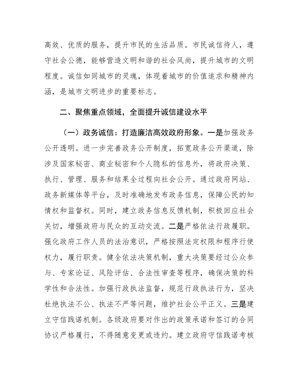 常务副市长在2025年全市诚信建设工作推进会上的讲话同志们:在这一季度关键的发展节点,我们齐聚于此召开诚信建设工作推进会,意义深远。诚信,是社会运转的基石,是城市发展的名片。近年来,我市在诚信建设方面已取得一定成果,但仍有提升空间。当下,我们需以更高的站位、更严的要求、更实的举措,推动诚信建设再上新台阶,为XX高质量发展注入强劲动力。下面,我谈几点意见。一、深化思想认识,把握诚信建设重要意义(一)诚信是社会和谐稳定的基石。从统计数据来看,一个诚信度高的社会,犯罪率明显更低,社会矛盾更容易化解。当人与人之间建立起诚信的纽带,社会交往成本就会降低,信任得以增强。在日常的社会生活中,无论是社区邻里关系,还是各类社会组织间的合作,诚信都发挥着至关重要的作用。居民间诚信相处,互帮互助,社区氛围就会更加和谐融洽;社会组织间诚信合作,能更好地整合资源,为社会提供更优质的公共服务。诚信就如同社会的润滑剂,减少摩擦,让社会这部大机器平稳运转。良好的社会诚信体系,能够增强民众对社会秩序的信心,提升安全感和归属感,为社会的和谐稳定提供坚实保障。(二)诚信是经济高质量发展的支撑。根据行业调研报告,在市场经济环境下,诚信经营的企业往往拥有更高的市场份额和更稳定的客户群体。企业诚信对待消费者,提供优质的产品和服务,就能赢得口碑,树立品牌形象,吸引更多的客户。在商业合作中,诚信也是建立长期合作关系的基础。企业之间信守合同,按时履约,才能降低交易风险,提高交易效率,促进产业链的协同发展。诚信还能助力企业获得更多的金融支持,金融机构更愿意为诚信企业提供贷款和融资服务,帮助企业扩大生产规模,创新发展。诚信能够优化营商环境,吸引更多的投资和人才,为经济高质量发展注入源源不断的活力。(三)诚信是城市文明进步的标志。一座诚信的城市,展现出的是良好的精神风貌和文明素养。在城市的发展进程中,诚信贯穿于城市管理、公共服务、市民行为等各个方面。政府部门诚信行政,能够提高行政效率,增强政府公信力,提升城市的治理水平。公共服务机构诚信服务,能为市民提供更便捷、高效、优质的服务,提升市民的生活品质。市民诚信待人,遵守社会公德,能够营造文明和谐的社会风尚,提升城市的文明程度。诚信如同城市的灵魂,体现着城市的价值追求和精神内涵,是城市文明进步的重要标志。二、聚焦重点领域,全面提升诚信建设水平(一)政务诚信:打造廉洁高效政府形象。一是加强政务公开透明。进一步完善政务公开制度,拓宽政务公开渠道,除涉及国家秘密、商业秘密和个人隐私的信息外,将政府决策、执行、管理、服务和结果全过程向社会公开。通过政府网站、政务新媒体等平台,及时准确地发布政务信息,保障公民的知情权和监督权。同时,建立政务信息反馈机制,积极回应社会关切,增强政府与民众的互动交流。二是严格依法行政履职。强化政府工作人员的法治意识,严格按照法定权限和程序行使权力,履行职责。健全依法决策机制,重大决策要经过公众参与、专家论证、风险评估、合法性审查等程序,确保决策的科学性和合法性。加强行政执法监督,规范行政执法行为,坚决杜绝执法不公、执法不严等问题,维护社会公平正义。三是建立守信践诺机制。各级政府要对作出的政策承诺和签订的合同协议严格履行,不得随意变更或违约。建立政府守信践诺考核评价机制,将守信践诺情况纳入政府绩效考核体系,对失信行为进行严肃问责。加强对政府债务、政府采购、招标投标等领域的信用管理,确保政府在经济活动中诚实守信,发挥示范引领作用。(二)商务诚信:营造公平有序营商环境。一是加强企业信用管理。引导企业建立健全内部信用管理制度,加强对客户信用的评估和管理,防范信用风险。鼓励企业开展诚信经营承诺活动,公开承诺遵守法律法规、诚信经营、保障消费者权益等内容,接受社会监督。建立企业信用档案,记录企业的信用信息,对守信企业给予激励,对失信企业进行惩戒。二是规范市场交易秩序。加强对市场交易行为的监管,严厉打击制假售假、商业欺诈、不正当竞争等违法行为,维护市场秩序。建立健全市场准入和退出机...