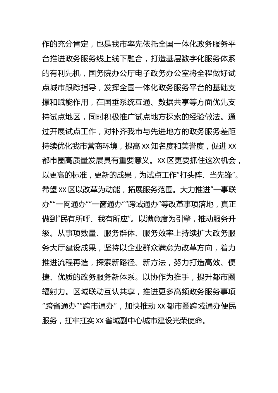 XX领导在政务服务技能竞赛决赛上的讲话各位同志:大家好!在组委会工作人员和选手们的共同努力下,XX区首届政务服务技能大赛圆满完成。看了今天的现场比赛,我认为这次比赛办得热烈、赛得激烈。在此,我代表XX市行政审批局,向这次竞赛的成功举办、向获奖的团队和个人表示热烈的祝贺!对所有选手、评委及全体工作人员表示衷心的感谢!XX区政务服务工作,向来是全市的一面旗帜。今天的这场决赛是政务服务风采的精彩展示,是“放管服”改革成果的精彩展示,是XX区集全区之力“高效办成一件事”的集中体现。今天站在这里的选手,是我们政务服务工作者的优秀代表他们让我们看到了“高质量、新形象,高效率、新体验”的政务服务XX特色。参赛选手迈出的每一小步,将带动全市政务服务工作前进一大步。希望大家以本次技能竞赛为契机在全市政务服务系统掀起一股“比学赶超”“追赶跨越”的浓厚风气,达到以赛促学,以学促行,以行促优的目的,在互学互鉴、奋勇争先中开创政务服务工作新局面。近日,XX市被确定为国家政务服务线上线下融合和向基层延伸试点城市,我市作为全国仅有的5个地级试点之一,肩负着先行先试的重任,这既是国务院办公厅对我市政务服务工作的充分肯定,也是我市率先依托全国一体化政务服务平台推进政务服务线上线下融合,打造基层数字化服务体系的有利先机,国务院办公厅电子政务办公室将全程做好试点城市跟踪指导,发挥全国一体化政务服务平台的基础支撑和赋能作用,在国垂系统互通、数据共享等方面优先支持试点地区,同时积极推广试点地方探索的经验做法。通过开展试点工作,对补齐我市与先进地方的政务服务差距持续优化我市营商环境,提高XX知名度和美誉度,促进XX都市圈高质量发展具有重要意义。XX区更要抓住这次机会,以更高的标准,更新的成果,为试点工作“打头阵、当先锋”。希望XX区以改革为动能,拓展服务范围。大力推进“一事联办”“一网通办”“一窗通办”“跨域通办”等改革事项落地,真正做到“民有所呼、我有所应”。以满意度为引擎,推动服务升级。从事项数量、服务群体、服务效率上持续扩大政务服务大厅建设成果,坚持以企业群众满意为改革方向,着力推进流程再造,探索新路径、新方法,努力打造高效、便捷、优质的政务服务新体系。以协作为推手,提升都市圈辐射力。区域联动互认共享,推进更多高频政务服务事项“跨省通办”“跨市通办”,加快推动XX都市圈跨域通办便民服务,扛牢扛实XX省域副中心城市建设光荣使命。