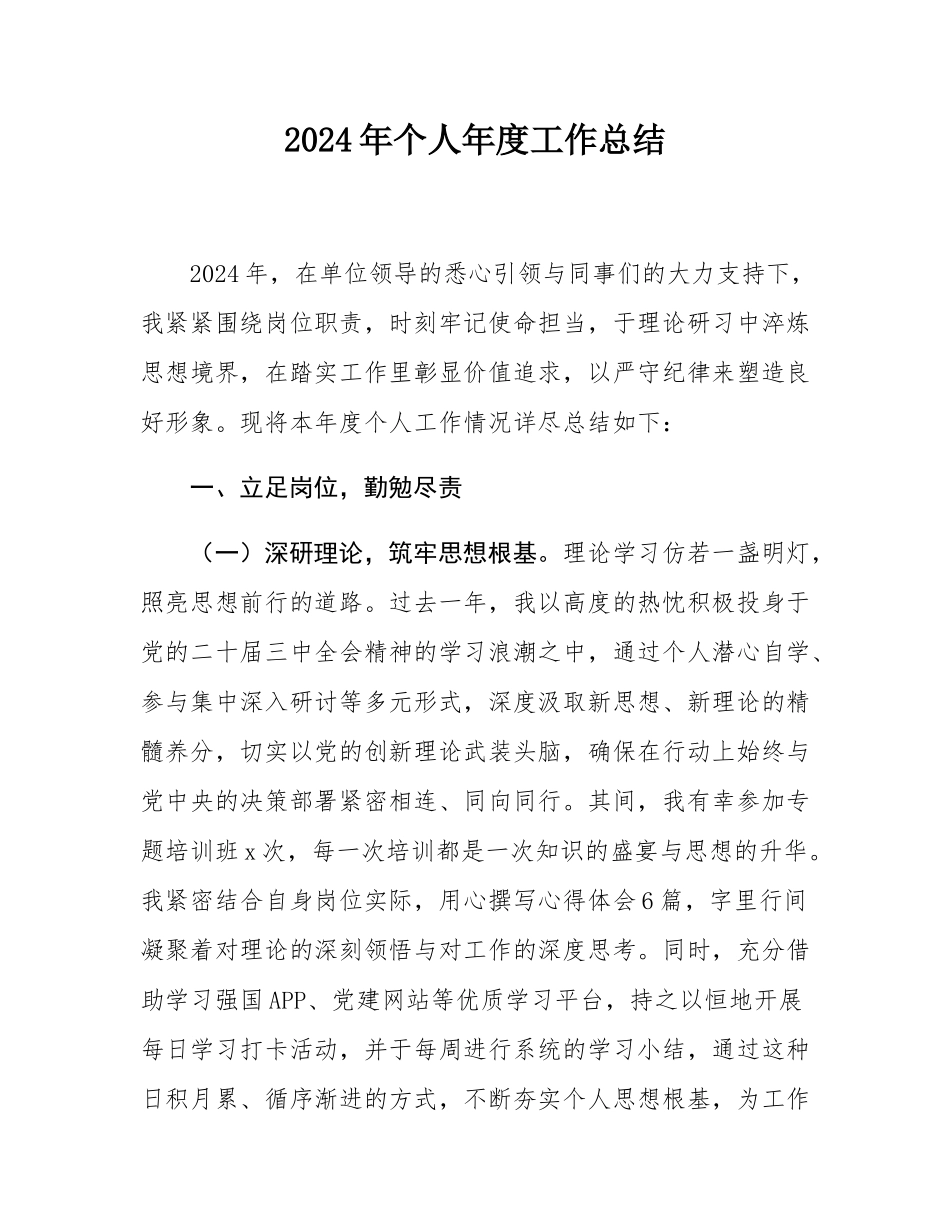 2024年个人年度工作总结2024年,在单位领导的悉心引领与同事们的大力支持下,我紧紧围绕岗位职责,时刻牢记使命担当,于理论研习中淬炼思想境界,在踏实工作里彰显价值追求,以严守纪律来塑造良好形象。现将本年度个人工作情况详尽总结如下:一、立足岗位,勤勉尽责(一)深研理论,筑牢思想根基。理论学习仿若一盏明灯,照亮思想前行的道路。过去一年,我以高度的热忱积极投身于党的二十届三中全会精神的学习浪潮之中,通过个人潜心自学、参与集中深入研讨等多元形式,深度汲取新思想、新理论的精髓养分,切实以党的创新理论武装头脑,确保在行动上始终与党中央的决策部署紧密相连、同向同行。其间,我有幸参加专题培训班x次,每一次培训都是一次知识的盛宴与思想的升华。我紧密结合自身岗位实际,用心撰写心得体会6篇,字里行间凝聚着对理论的深刻领悟与对工作的深度思考。同时,充分借助学习强国APP、党建网站等优质学习平台,持之以恒地开展每日学习打卡活动,并于每周进行系统的学习小结,通过这种日积月累、循序渐进的方式,不断夯实个人思想根基,为工作实践提供坚实的理论支撑。不仅如此,我更注重学以致用,积极将所学理论深度融入工作实践,精心撰写“学思践悟”理论文章3篇。其中,1篇凭借其独到的见解与严谨的论证,在行业系统中脱颖而出,荣获优质理论论文二等奖,这无疑是对我理论学习与实践应用相结合的有力肯定。(二)恪尽职守,尽显担当作为。一是重点项目攻坚,稳步推进。在重点实事工程项目的推进征程中,我肩负负责人的重任,秉持严谨细致、一丝不苟的工作态度。精心制定每日项目进展跟踪机制,如同为项目装上精准的导航仪,确保每一个环节、每一项任务都清晰明了、有条不紊。每周定期召开项目协调会,犹如一场场智慧的集结号,召集各方力量共同探讨项目进度,深入剖析问题根源,精准找出对策良方。全年累计协调解决问题6大类xx余个,每一个问题的攻克都是向项目成功竣工迈进的坚实一步,为项目如期高质量完成倾尽心力。为获取最为真实、详尽的一线情况,我不辞辛劳,深入点位调研走访xx余次,足迹遍布项目的每一个角落。组织召开各类座谈会xx场,广泛倾听各方声音,收集涉及组织管理、人员调配、资源整合等多方面的宝贵意见建议xxx条。随后,我迅速对这些繁杂的问题进行梳理归类,运用专业知识与实践经验,形成了极具针对性与可操作性的调研报告,为单位的科学决策提供了有力依据,赢得了单位领导的高度赞誉与充分肯定。二是服务质效提升,创新领航。身为窗口单位的一员,我始终将优化服务流程、提升服务质量视为工作的核心使命。在日常工作中,我善于思考、勇于创新,积极探索便民利民的新方式、新方法。大力推行一网通办服务模式,对原有繁琐的办事环节进行全面、细致的梳理与大刀阔斧的精简,成功缩减了办事环节,极大地减少了群众的等待时间,真正做到了让数据多跑路、群众少跑腿,便民为民举措赢得群众广泛好评与点赞。此外,我还在中心创新性地建立了问题限时办结机制,为每一个问题设定明确的解决时限,如同给服务工作装上了高效的加速器,做到问题及时清零,有效加强了过程监管。在这一机制的有力保障下,中心全年共受理各类事项xxxx件,按时办结率高达xx%,群众满意度更是攀升至xx%,中心的整体服务形象与公信力得到显著提升,在群众心中树立起了优质服务的崭新标杆。三是创新工作开展,成效斐然。我始终致力于将专业所学与工作实践紧密融合,通过创新工作方法与手段,为工作注入全新活力与强大动力。在项目建设领域,高度注重大数据技术的应用,精心细化工作台账,以精细化管理理念为引领,对项目推进过程中可能出现的阶段性重点难点和堵点问题进行精准研判,提前制定相应的对策预案,犹如为项目披上了坚固的防护铠甲。其中,某情况大数据模型凭借其卓越的实用性与创新性在单位内部得到全面推广应用,成为推动项目建设高效开展的得力助手。在为民办实事的道路上,始终心系群众,急群众之所急,想群众之所想。主动担当作为,积极协调各方资源,认真对接群众需求,全年共解决群众“急难愁盼”问题xxx个,用实际行动诠释了为民服务的初心与使命。凭借...
