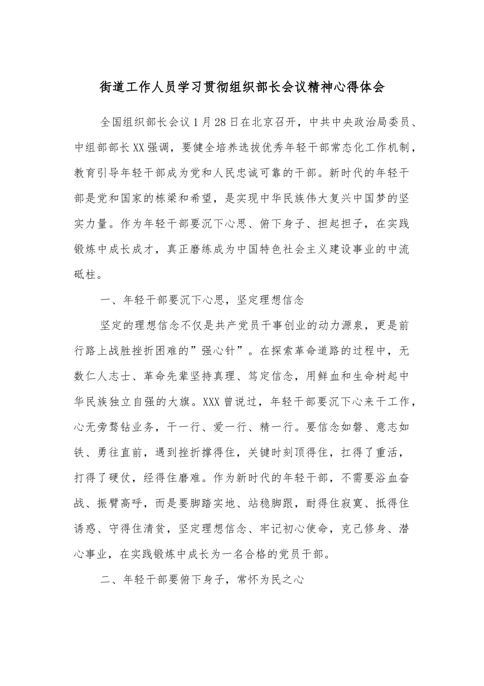 街道工作人员学习贯彻组织部长会议精神心得体会全国组织部长会议1月28日在北京召开,中共中央政治局委员、中组部部长XX强调,要健全培养选拔优秀年轻干部常态化工作机制,教育引导年轻干部成为党和人民忠诚可靠的干部。新时代的年轻干部是党和国家的栋梁和希望,是实现中华民族伟大复兴中国梦的坚实力量。作为年轻干部要沉下心思、俯下身子、担起担子,在实践锻炼中成长成才,真正磨练成为中国特色社会主义建设事业的中流砥柱。一、年轻干部要沉下心思,坚定理想信念坚定的理想信念不仅是共产党员干事创业的动力源泉,更是前行路上战胜挫折困难的”强心针”。在探索革命道路的过程中,无数仁人志士、革命先辈坚持真理、笃定信念,用鲜血和生命树起中华民族独立自强的大旗。XXX曾说过,年轻干部要沉下心来干工作,心无旁骛钻业务,干一行、爱一行、精一行。要信念如磐、意志如铁、勇往直前,遇到挫折撑得住,关键时刻顶得住,扛得了重活,打得了硬仗,经得住磨难。作为新时代的年轻干部,不需要浴血奋战、振臂高呼,而是要脚踏实地、站稳脚跟,耐得住寂寞、抵得住诱惑、守得住清贫,坚定理想信念、牢记初心使命,克己修身、潜心事业,在实践锻炼中成长为一名合格的党员干部。二、年轻干部要俯下身子,常怀为民之心“一切为了群众,一切依靠群众,从群众中来,到群众中去”,是我们党始终得到人民群众拥护和爱戴的重要法宝之一。战争时期,广大人民群众冒着枪林弹雨,忍受饥寒交迫之苦,为前线运送物资、转运伤员,做出了不可磨灭的贡献。新时期,中华民族迎来了从站起来、富起来到强起来的伟大飞跃,党和国家成为人民群众最强大的后盾。从构建惠及全民的医疗保障体系到将罕见病纳入国家医保报销范围,从部署”脱贫攻坚战”到实施”乡村振兴”战略,国家关照到每个群体、每个个人,将”取之于民、用之于民”理念转化为生动实践。年轻干部要牢记全心全意为人民服务宗旨,摆正位子、俯下身子,问需于民、问计于民、问政于民,把为人民群众干实事、干好事、干成事作为最大的政绩。三、年轻干部要担起担子,争做为民表率《尚书·夏书·五子之歌》中提到”民惟邦本,本固邦宁”,民本思想古而有之。十九大报告中指出:”坚持以人民为中心。人民是历史的创造者,是决定党和国家前途命运的根本力量。必须坚持人民主体地位,坚持立党为公、执政为民,践行全心全意为人民服务的根本宗旨,把党的群众路线贯彻到治国理政全部活动之中,把人民对美好生活的向往作为奋斗目标,依靠人民创造历史伟业。”一生奉献、扎根人民的”草鞋书记”周永开,燃烧自己、照亮梦想的”校长妈妈”张桂梅,立德树人、为国育才的”布衣院士”卢永根,以及无数坚守在基层岗位上,心系群众、默默付出的党员干部,他们把使命放在心中、把责任扛在肩上,努力践行为民服务的铮铮誓言。作为一名年轻的党员干部,要以”俯首甘为孺子牛”的心态,在面临攻坚克难、急难险重任务时,冲锋在前,将人民群众牢牢护在身后;在平凡岗位、点滴小事上,为民解忧,做一名有责任、有担当、有作为的好干部。