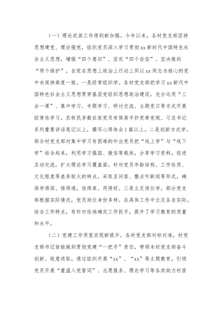 乡镇领导关于基层党组织建设工作的调研报告根据县、乡党委关于推进“xxx”教育活动工作的相关要求,作为乡党委xx书记,xx月xx日—xx月xx日,我先后深入到xx村、xx村等八个村居的党支部,对照“xx”的总要求,结合自身分管的基层党建工作,通过听取工作汇报、查阅党建资料、与村党员现场交流、征求意见建议等方式就基层党建相关工作开展调研。现将具体情况报告如下。一、基本情况及主要做法总体来讲,今年以来,我乡各村党支部以xx新时代中国特色社会主义思想为指导,在乡党委的带领下、驻村工作队的帮助下,第一书记的协调下,以党的政治建设为统领,通过“xx”、“xx”等主题教育,着力深化党员理论武装,着力推进村居党建工作与业务工作深度融合,着力夯实基层党建基础,着力正风肃纪,以高质量党建为村内各项事业发展提供了有力的政治保障。(一)理论武装工作得到新加强。今年以来,各村党支部坚持思想建党、理论强党,组织党员深入学习贯彻xx新时代中国特色社会主义思想,增强“四个意识”、坚定“四个自信”、坚决做到“两个维护”,自觉在思想上政治上行动上同以xx同志为核心的党中央保持高度一致。一是经常组织学。各村党支部把学习xx新代中国特色社会主义思想贯穿基层党组织思想政治建设,充分运用“三会一课”、集中学习、专题学习、研讨交流、主题党日等方式开展经常性学习。农牧民多数在家党员有简易手抄党章党规、习总书记系列重要讲话笔记以上,撰写心得体会1篇以上。二是创新方式学。部分村党支部对集中学习有困难的外出党员把“线上学”与“线下学”结合起来,利用学习强国、微信等载体,分享学习资料,促进互动交流,扩大理论学习覆盖面。针对党员年龄结构、工作性质、文化程度等差异较大的特点,采取互问答、整点听新闻等形式,确保学得深、悟得透,信得真、用得好。三是立足岗位学。部分党支部根据实际情况,党员岗位身份多样。在具体工作中立足各自实际,结合工作特点,有针对性地确定工作抓手,提升了学习教育的质量和水平。(二)党建工作质里实现新提升。各村党支部对标对准,村党支部书记皆能做到贯彻党建“一把手”责任,带领本村党支部奋斗创新、锐意进取,通过组织开展“xx”、“xx”等主题教育,引领党员开展“重温入党誓词”、志愿服务、理论学习等各类助力村居发展的有效教育活动,从工作实践中找到了抓好村党建工作的突破口和切入点,实现了党建工作与业务工作深度融合。(三)党组织建设呈现新活力。村党支部以基层党组织建设标准化工作为载体,强化政治功能,夯实党建基础,充分发挥基层党组织战斗堡垒作用和党员先锋模范作用。一是认真开展自查自纠。基层党组织坚持问题导向,通过召开民主生活会,重点对照基层党组织标准化工作要求和个人问题进行自查,对自查内容全部建立“问题清单”,逐一整改销号、争创达标,夯实了党建基础。二是严肃党内生活。严格落实“三会一课”、民主生活会制度,落实谈心谈话、民主评议党员、主题党日制度,认真开展批评和自我批评,严肃规范的党内生活逐步成为常态和习惯。(四)全面从严治党取得新成效。基层党组织以严明纪律规矩为抓手,在乡纪委和村监督委员会的助力下,及时为党员纠偏正向,把好的做法变成习惯,把好的习惯变成自然,最终达到了“俗成于下”的好效果。比如,严格落实有关规定,将整治邻里矛盾纳入村党支部建设重点内容,督促农牧民党员带头移风易俗、抵制不良风气。二、存在的主要问题及其原因在肯定成绩的同时,我在调研中也看到各村党支部一些存在的问题和不足。一是理论学习抓得还不够实,停留在读文件、翻书本、抄笔记的层面上,没有带着问题、联系实际深学细悟。有的村党支部书记说不上“入党誓词”“三会一课”等党的基本知识,有的党员答不全“四个意识”“四个自信”“四个全面”,理论武装上不去。二是基层党组织建设标准化水平还不够高,党建工作整体上历史欠账大,还处在赶工补课、整改推进阶段。个别村党建活动开展不严格,党建台账不齐全,“三会一课”记录不规范。三是党建工作责任制落实还不够到位,个别村党支部书记对谁来抓、抓什么、怎么抓,心中无数。个别党员在思想认识上...