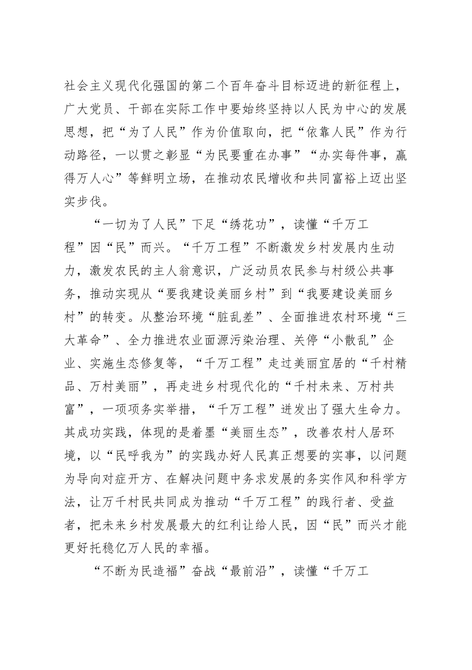 学习千万工程研讨发言稿“千万工程”是习近平同志在浙江工作时亲自谋划、亲自部署、亲自推动的重大决策,二十年来浙江锲而不舍、久久为功,探索出了一条从整治农村人居环境入手、进而全面推进乡村振兴、建设美丽中国的成功路径。当下,“千万工程”的内涵不断丰富、拓展,成为持续惠及浙江千百万农民的“德政工程”。“千万”也已不仅是一个具体数字度量,更一个象征经济、政治、文化、社会、生态文明的道道风景的符号,都蕴含在这“千万”的万千变化之中,展现出农业强、农村美、农民富的美好图景。“江山就是人民、人民就是江山,打江山、守江山,守的是人民的心。”广大党员干部要深入领会“千万工程”中的为民情怀,从中感悟“民”字真谛,在工作实践中与群众同心,和群众共进,以实际行动谱写不负使命、不负人民的时代华章。“紧紧植根人民”拧成“一股绳”,读懂“千万工程”为“民”而生。问题是时代的声音。“千万工程”是习近平同志在浙江工作期间充分尊重农民心声意愿、增进农民根本利益、促进农民全面发展,为浙江广大农民作出的一项民生实事、民心实事。习近平同志到浙江工作后不久,带头大兴调查研究之风,用118天时间,跑遍11个地市,25个县(市、区),一个村一个村地仔细考察。可见,“千万工程”之所以能够长久地推行下去,就是始终聚焦人民群众急难愁盼问题,把促进共同富裕作为为人民谋幸福的着力点。在向着全面建成社会主义现代化强国的第二个百年奋斗目标迈进的新征程上,广大党员、干部在实际工作中要始终坚持以人民为中心的发展思想,把“为了人民”作为价值取向,把“依靠人民”作为行动路径,一以贯之彰显“为民要重在办事”“办实每件事,赢得万人心”等鲜明立场,在推动农民增收和共同富裕上迈出坚实步伐。“一切为了人民”下足“绣花功”,读懂“千万工程”因“民”而兴。“千万工程”不断激发乡村发展内生动力,激发农民的主人翁意识,广泛动员农民参与村级公共事务,推动实现从“要我建设美丽乡村”到“我要建设美丽乡村”的转变。从整治环境“脏乱差”、全面推进农村环境“三大革命”、全力推进农业面源污染治理、关停“小散乱”企业、实施生态修复等,“千万工程”走过美丽宜居的“千村精品、万村美丽”,再走进乡村现代化的“千村未来、万村共富”,一项项务实举措,“千万工程”迸发出了强大生命力。其成功实践,体现的是着墨“美丽生态”,改善农村人居环境,以“民呼我为”的实践办好人民真正想要的实事,以问题为导向对症开方、在解决问题中务求发展的务实作风和科学方法,让万千村民共同成为推动“千万工程”的践行者、受益者,把未来乡村发展最大的红利让给人民,因“民”而兴才能更好托稳亿万人民的幸福。“不断为民造福”奋战“最前沿”,读懂“千万工程”与“民”共富。从美丽生态,到美丽经济,再到美丽生活,“三美融合”下的浙江乡村,各美其美、生机勃勃,给了乡村奔赴美好的信心。“千万工程”用实践证明广大党员干部只有做到心往一处想、劲往一处使,一任接一任地干,实现与“民”共富愿景,才能赓续二十年里“要我”变“我要”、“输血”变“造血”、“硬伤”变“优势”的美丽接力。20年间,浙江全省农村居民人均可支配收入由2003年5431元提高到2022年37565元,村级集体经济年经营性收入50万元以上的行政村占比达51.2%。广大党员干部要始终把人民对美好生活的向往作为工作的出发点和落脚点,久久为功、驰而不息,实心实意为民办事,同人民群众携手勾勒出“望得见山、看得见水、记得住乡愁”的“富村山居”轮廓,以积小胜为大胜的坚实步履,走好共同富裕的现代化道路,让更多关于未来乡村的想象走进现实、点亮世界。
