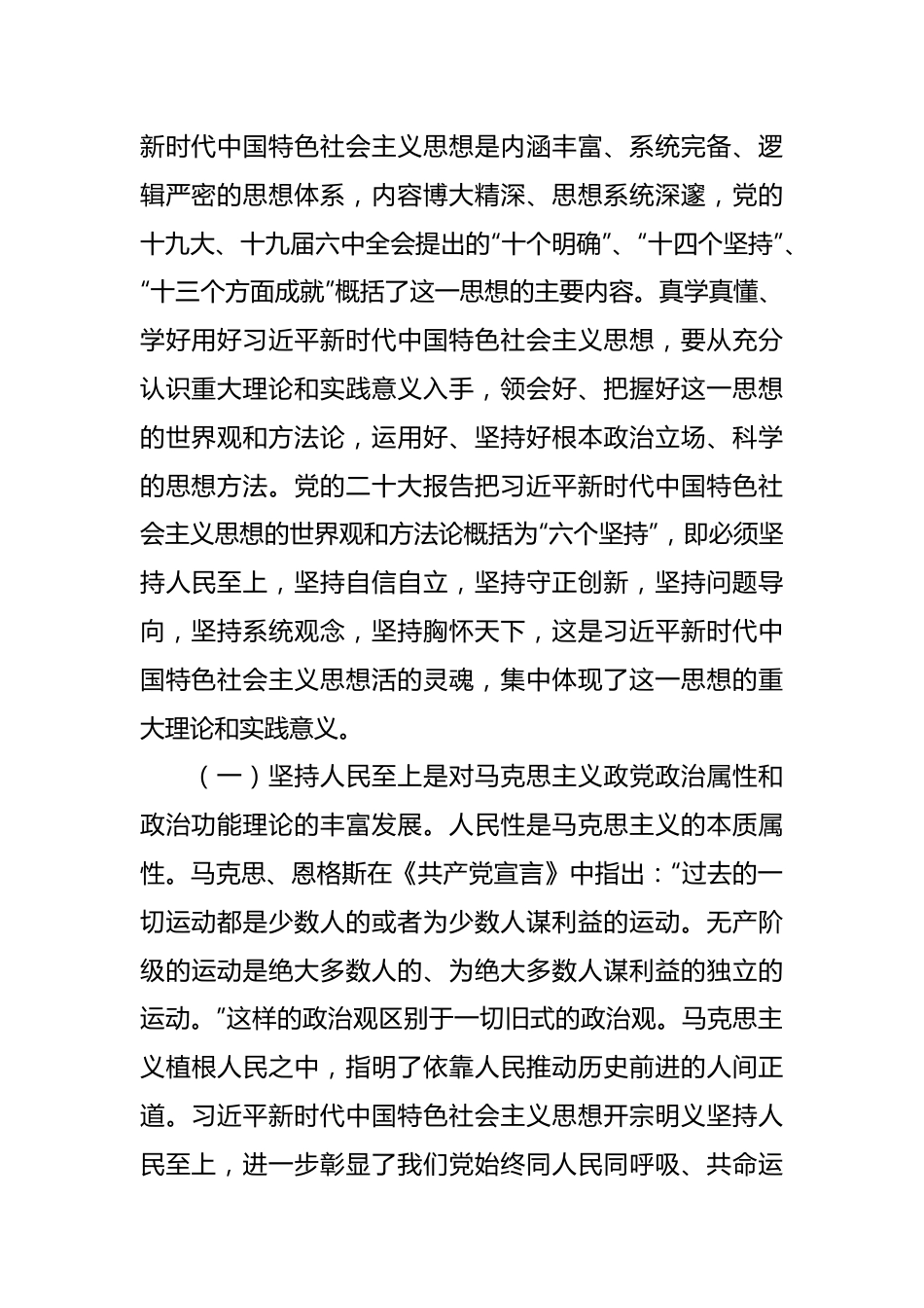 2023年主题教育干部读书班党课讲稿同志们:全厅学习贯彻习近平新时代中国特色社会主义思想主题教育读书班,今天正式开班。举办读书班,既是开展主题教育的重要抓手,也是深化理论学习的重要方法,目的是从领导干部做起,集中时间,集中精力,静下心来,通读、精读、研读原著原文原理,在深化、内化、转化上下功夫,切实做到内化于心、外化于形。这次读书班共分两期进行,这一期聚焦“学思想、强党性”,解决思想层面的问题;下一期聚焦“重实践、建新功”,解决实践层面的问题,在理论和实践的结合中,把习近平新时代中国特色社会主义思想学深悟透做实。下面,我结合自己的学习体会,与大家共同交流学习,也是一次专题党课和开班动员,共交流三个方面的问题。一、提高政治站位,充分认识习近平新时代中国特色社会主义思想的重大理论和实践意义开展主题教育,首要任务是用习近平新时代中国特色社会主义思想凝心铸魂,教育引导广大党员从思想上正本清源、固本培元,以理论上的清醒确保政治上的坚定。习近平新时代中国特色社会主义思想是内涵丰富、系统完备、逻辑严密的思想体系,内容博大精深、思想系统深邃,党的十九大、十九届六中全会提出的“十个明确”、“十四个坚持”、“十三个方面成就”概括了这一思想的主要内容。真学真懂、学好用好习近平新时代中国特色社会主义思想,要从充分认识重大理论和实践意义入手,领会好、把握好这一思想的世界观和方法论,运用好、坚持好根本政治立场、科学的思想方法。党的二十大报告把习近平新时代中国特色社会主义思想的世界观和方法论概括为“六个坚持”,即必须坚持人民至上,坚持自信自立,坚持守正创新,坚持问题导向,坚持系统观念,坚持胸怀天下,这是习近平新时代中国特色社会主义思想活的灵魂,集中体现了这一思想的重大理论和实践意义。(一)坚持人民至上是对马克思主义政党政治属性和政治功能理论的丰富发展。人民性是马克思主义的本质属性。马克思、恩格斯在《共产党宣言》中指出:“过去的一切运动都是少数人的或者为少数人谋利益的运动。无产阶级的运动是绝大多数人的、为绝大多数人谋利益的独立的运动。”这样的政治观区别于一切旧式的政治观。马克思主义植根人民之中,指明了依靠人民推动历史前进的人间正道。习近平新时代中国特色社会主义思想开宗明义坚持人民至上,进一步彰显了我们党始终同人民同呼吸、共命运心连心的赤子之心,对充分发挥亿万人民的创造伟力、形成同心共圆中国梦的强大合力具有重大而深远的意义。(二)坚持自信自立是对马克思主义理论自信精神的丰富发展。马克思在创立、发展、传播和实践真理的过程中展现出强烈的理论自信,坚信他毕生所从事事业的正义性、思想的科学性、目标的伟大性。习近平新时代中国特色社会主义思想有着自信自立的鲜明特质,彰显对马克思主义的坚定信仰、对中国特色社会主义的坚定信念,充满着豪迈的历史担当和创造精神。这种自信自立的鲜明特质,激励着广大党员干部群众斗志昂扬地为全面建设社会主义现代化国家、全面推进中华民族伟大复兴而团结奋斗。(三)坚持守正创新是对马克思主义认识论和唯物辩证法的丰富发展。守正与创新相辅相成,守正是创新的前提和基础,创新是守正的目的和路径,这深刻彰显了“变”与“不变”、继承与发展、原则性与灵活性的辩证统一。党的十八大以来,以习近平同志为核心的党中央在立场、方向、原则、道路等根本性问题上旗帜鲜明、毫不含糊,坚持马克思主义基本原理不动摇,坚持党的全面领导不动摇,坚持中国特色社会主义不动摇,确保了党不变质、不变色、不变味。同时,面对快速变化的世界和中国,我们党坚持解放思想,坚持立破并举,持续创“马克思主义中国化时代化”之新,创“新时代中国特色社会主义”之新,以原创性理论贡献标注了马克思主义发展的新高度,实现了马克思主义中国化时代化新的飞跃。(四)坚持问题导向是对马克思主义问题导向思维方法的丰富发展。马克思指出:“问题就是公开的、无畏的、左右一切个人的时代声音。问题就是时代的口号,是它表现自己精神状态的最实际的呼声。”马克思主义的一个鲜明特点是自始至终贯穿着强烈的问...