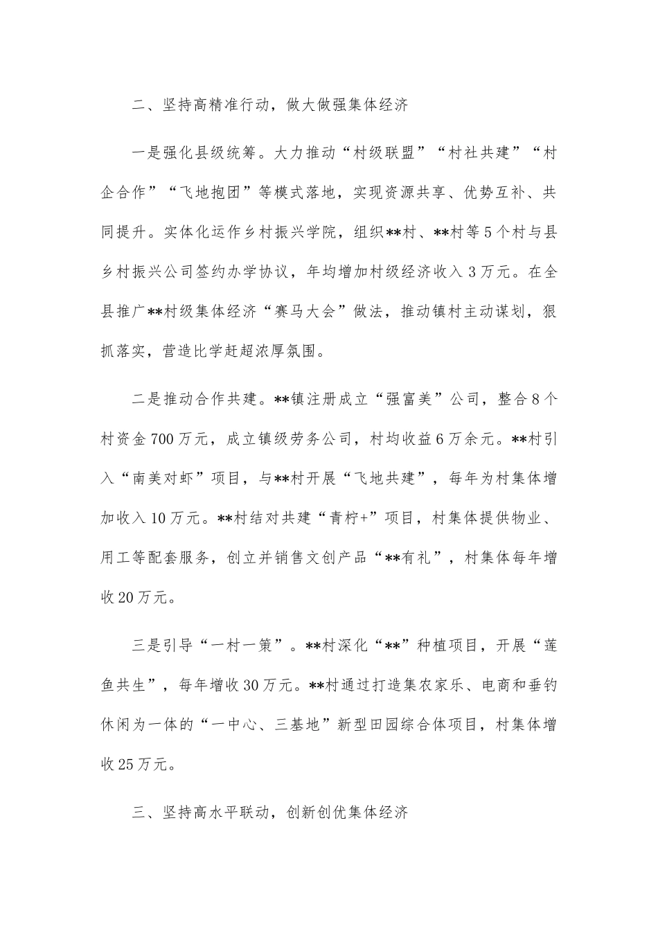 党建引领村级集体经济发展壮大经验材料党建引领村级集体经济发展壮大经验材料近年来,我县充分发挥党建引领作用,坚持问题导向,强化政策支持,结合县域实际,延伸拓展产业链条,激活各类发展要素,村级集体经济不断发展壮大。一、坚持高站位推动,抓深抓实集体经济一是拉高目标定位。将扶持壮大村级集体经济纳入全县乡村振兴三年攻坚行动“五百五千”工作计划,实行清单化推进、项目化攻坚,定期会商调度推进。制定《**县推进“全域强村”两年行动计划》,逐年逐项细化目标任务,力争到2023年底,实现50万元以上强村全覆盖。二是完善配套机制。出台村集体经济组织承接农村公共基础设施建设及管护公益性项目实施方案,拓宽村级增收渠道。完善村干部发展村级集体经济激励办法,将奖励资金纳入县财政预算,激励村干部主动干事创业。建立“清单推进、闭环管理”工作机制,将村级集体经济作为督查重要内容,每月实地调度,推动落地落实。三是找准发力方向。全域扩面党建引领信用村建设,开展信用村“三走进”行动,聚焦乡村产业发展发力,选派党建服务组、产业服务组、科技服务组、金融服务组,组建乡村产业发展服务团,建立“1+4+N”工作机制,推动人才、资金下沉产业发展一线。二、坚持高精准行动,做大做强集体经济一是强化县级统筹。大力推动“村级联盟”“村社共建”“村企合作”“飞地抱团”等模式落地,实现资源共享、优势互补、共同提升。实体化运作乡村振兴学院,组织**村、**村等5个村与县乡村振兴公司签约办学协议,年均增加村级经济收入3万元。在全县推广**村级集体经济“赛马大会”做法,推动镇村主动谋划,狠抓落实,营造比学赶超浓厚氛围。二是推动合作共建。**镇注册成立“强富美”公司,整合8个村资金700万元,成立镇级劳务公司,村均收益6万余元。**村引入“南美对虾”项目,与**村开展“飞地共建”,每年为村集体增加收入10万元。**村结对共建“青柠+”项目,村集体提供物业、用工等配套服务,创立并销售文创产品“**有礼”,村集体每年增收20万元。三是引导“一村一策”。**村深化“**”种植项目,开展“莲鱼共生”,每年增收30万元。**村通过打造集农家乐、电商和垂钓休闲为一体的“一中心、三基地”新型田园综合体项目,村集体增收25万元。三、坚持高水平联动,创新创优集体经济一是强化金融助力。建立“党建金融联盟”,推动“整镇授信、整村授信”,加大对新型农业经营主体、集体经济信用贷款支持力度。截至目前,累计授信新型经营主体740户、村级集体经济组织13个,授信20.9亿元,累计用信9.3亿元,为产业发展注入“金融活水”。二是强化人才支持。深入推进“头雁”工程,以村“两委”换届为契机,选好领头雁,吸收各类型致富带头人148名,优化班子结构,增强村级集体经济“造血功能”。选派20名乡村振兴第一书记、4个工作队驻村工作,带头领办发展项目。三是强化督导考核。落实县领导“包乡走村入户”、“1+3”包联等制度,定期开展帮扶指导,把发展壮大村级集体经济作为年度党建考核和综合考核的重要依据,并作为基层党建述职评议的重要内容,形成责任倒逼机制,推动工作有效落实。