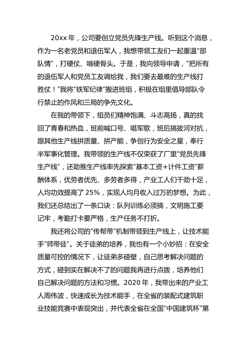 五一劳动节表彰大会劳动模范代表发言材料范文(1)大家好!我叫x,是x科创公司x厂的一名产业工人,今天作为劳模代表在大会上发言,代表的不仅是我个人,而是那些常年坚守在岗位上为企业发展和社会进步默默奉献的一线工作者,他们是奋斗者,他们才是真英雄。我曾是一名军人,退伍后先后当过电工、保洁员、房产中介,但因为自己的长处始终得不到发挥,感觉少了一点奔头。20xx年x月,我通过招聘进入x成为一名x厂的产业工人。经过严格的岗前培训,我开始生产线上的工作。进厂后的第一份工作是操作布料机,工厂给我安排一位“老师傅”手把手带,上班时间跟着师傅四处跑,下班时间到生产线去清理机器设备,了解设备操作技巧。公司还为我们开设了产业工人夜校,每周开展两次技能培训,生产线主管也不定期组织我们学习识图和实操,一周后,我便能上手操作,两周后已能独立作业,我的技术也在不断学习和实战中日渐娴熟。20xx年,公司要创立党员先锋生产线。听到这个消息,作为一名老党员和退伍军人,我想带领工友们一起重温“部队情”,打硬仗、啃硬骨头。于是,我向领导申请,“把所有的退伍军人和党员工友调给我,我们要去最难的生产线打胜仗!”我将“铁军纪律”搬进班组,积极在组里倡导部队令行禁止的作风和三局的争先文化。在我的带领下,组员们精神饱满、斗志高扬,真的找回了青春和热血,班前喊口号、唱军歌,班后搞拔河对抗,跟其他生产线拼质量、拼产能,争创行为安全之星,奉行半军事化管理。我带领的生产线不仅荣获了厂里“党员先锋生产线”,还助推生产线率先探索“基本工资+计件工资”薪酬体系,优劳者优先、多劳者多得,产业工人们干劲十足,人均功效提高了25%,实现人均月收入过万的梦想。为此,我们还总结出了一条口诀:队列训练必须搞,文明施工要记牢,考勤打卡要严格,生产任务不打折。我还将公司的“传帮带”机制带领到生产线上,让技术能手“师带徒”。关于徒弟的培养,我也有一个小妙招:在安全质量可控的情况下,让徒弟多碰壁,自己思考解决问题的方式,碰到实在解决不了的问题我再进行点拨,培养他们自己解决问题的方法和习惯。2020年,我带出来的产业工人周伟波,快速成长为技术能手,在全省的装配式建筑职业技能竞赛中表现突出,并代表全省在全国“中国建筑杯”第四届装配式建筑职业技能竞赛总决赛中斩获吊装灌浆团体一等奖和个人一等奖。这几年,我深深地感受到公司对我们产业工人的关爱和帮扶,不仅设立了“工友服务站”,确保工友享受“娘家人”的温暖,建立工友书屋、工友影院、工人书法活动室等文化生活场所,还组织我们产业工人参与各类文体兴趣活动小组,让我感受到大家庭般的温暖。热爱书法的我,牵头成立了书法兴趣小组,每周定期组织工友们在一起切磋交流。作为一名产业工人,我通过开启生产线上的“军旅生活”,实现了人生逆袭。我也希望以自身的经历,引导更多农民工朋友转型成为技术性产业工人,帮助农村贫困户走上致富路。为此,我积极参与公司在团风县的产业扶贫招聘工作,在团风县人民政府产业扶贫暨装配式建筑产业工人专场招聘会现场,向前来应聘的50几名人员分享自己的脱贫致富故事,和他们共圆幸福梦。2021年,为了激发新时代产业工人的强大力量,我光荣的加入到公司党史巡讲团中,为工厂退伍军人及入党积极分子讲授了精彩的党史教育课。工厂的广播站也是我们学党史的渠道,产业工人党员经常通过广播分享党史故事、学习心得、分享入党故事。我负责培养的一名入党积极分子,晚上在宿舍还会自己做党史学习笔记,看着他们成长,我感到无比的欣慰和快乐。以上,是我的一些点滴分享。很多时候,我觉得我做的相对于我得到的,还远远不够。作为一名共产党员、退伍军人、新时代的产业工人,党的宗旨不能忘、军人本色不能退、劳动精神不能丢。因为,有一种信仰——叫忠诚。战争年代,舍生忘死是忠诚;和平时期,坚守平凡亦忠诚。最后,我想以一首小诗结束这次发言:人贵有志德才高,万般辛苦不辞劳;江河溪流永常在,甘为大海做波涛。五一劳动节表彰大会劳动模范代表发言材料范文(2)我叫x,是x有色集团下属x研究所的一名科研工作者。今天能够站在这...