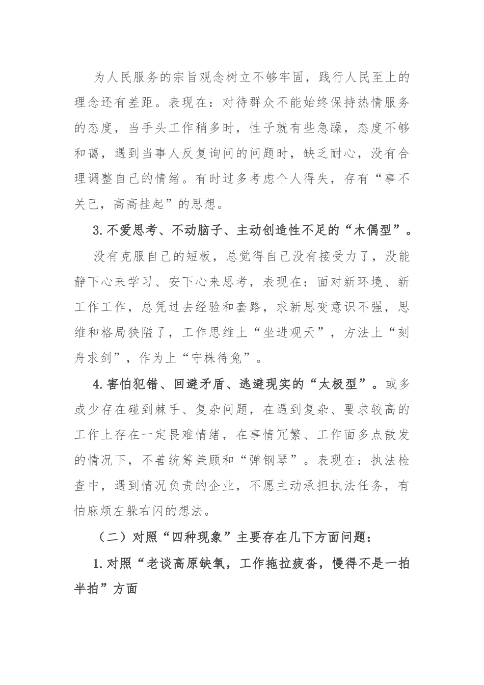 “想一想我是哪种类型干部”研讨发言材料根据在主题教育中开展“想一想我是哪种类型干部”思想大论相关要求,我认真领会思想大讨论的重要意义,我结合自己的思想和工作实际,对照新时代好干部标准和中央纪委国家监委公布的十种类型干部作风问题,对照“四种现象”,把自已摆进去、把职责摆进去、把工作摆进去深入思考、摆问题、找不足,并进行自我检视及原因剖析提出相应措施立行立改、坚决纠正,为推动自我革新、自我完善,更好的工作和服务作出个人努力和保证。现将情况汇报如下。一、对照干部作风"十型"问题、“四种现在”查找差距不足主要存在几下方面问题:(一)对照“十种类型”主要表现在以下几个方面:1.自我感觉良好、安于现状、小进即满的“佛系型”。在领导同事们的影响下,我耳濡目染,受教很多,在作风和业务上也得到了一些长进,也激发了我的工作热情和动力,但相比之下,我仍感到自己拼劲不足、斗志不勇,表现在:从事执法工作已经有大半年的时间,虽然对《安全生产法》进行了系统学习,但是对行业标准、行业领域重大隐患判断标准还不能够做到又专又精,存在用到哪学到哪,主观上有安于现状、缺乏进取的思想表现。2.不推不动、推推动动、甚至推而不动的“打盹型”。为人民服务的宗旨观念树立不够牢固,践行人民至上的理念还有差距。表现在:对待群众不能始终保持热情服务的态度,当手头工作稍多时,性子就有些急躁,态度不够和蔼,遇到当事人反复询问的问题时,缺乏耐心,没有合理调整自己的情绪。有时过多考虑个人得失,存有“事不关己,高高挂起”的思想。3.不爱思考、不动脑子、主动创造性不足的“木偶型”。没有克服自己的短板,总觉得自己没有接受力了,没能静下心来学习、安下心来思考,表现在:面对新环境、新工作工作,总凭过去经验和套路,求新思变意识不强,思维和格局狭隘了,工作思维上“坐进观天”,方法上“刻舟求剑”,作为上“守株待兔”。4.害怕犯错、回避矛盾、逃避现实的“太极型”。或多或少存在碰到棘手、复杂问题,在遇到复杂、要求较高的工作上存在一定畏难情绪,在事情冗繁、工作面多点散发的情况下,不善统筹兼顾和“弹钢琴”。表现在:执法检查中,遇到情况负责的企业,不愿主动承担执法任务,有怕麻烦左躲右闪的想法。(二)对照“四种现象”主要存在几下方面问题:1.对照“老谈高原缺氧,工作拖拉疲沓,慢得不是一拍半拍”方面;一是政治理论学习缺乏主动性,更缺乏深入思考,没有注重自身素养的提升,因学习而学习,应付了事。表现在:在完成每周安排的学习笔记时只是照抄照搬,没有自己的学习心得和对学习内容的理解,很多时候都是紧紧张张在提交时间前提交;二是在复杂、高要求、任务重的工作上,疲于把工作任务尽快完成,有时粗枝大叶质量一般忙于交差,在面对不是很紧急的工作时,总有等一等,不着急缓一缓的想法。2.“老谈环境艰苦,对工作不上心不上手,得过且过”方面;快干即办的工作观点树立不够强,总是觉得要以稳妥为主,转变工作作风带头作用发挥不充分。表现在:对待工作有时抱有应付了事的态度,没有做到脚踏实地,总想在工作中找到捷径,不要花费太多的精力就可以把事情做好。有时由于私心作怪,存在“多做多错,少做少错,不做不错”的态度,除了自己必须完成的以外,可以不做的就不做,有时因此产生工作效率低的问题。二、检视分析分析自身存在的以上问题,我认为既有主观原因,也有客观原因。但主要是主观原因。对学习的重要性认识不足对相关业务工作及工作标准要求不高。思想上自身要求不够严格。1.缺乏学习,自觉性不强。一是没有把学习放在首要位置。业余时间只凭个人兴趣和喜好,想学就随便翻翻书本,不想学就随意看看新闻、做做零散工作,除集中学习理论外,自己平时没有真正静下心来学习。二是学而不专。业务学习不深,专注力不够。2.自我要求不严,缺乏争先创优的精神。随着年龄的增长,工作中不知不觉滋生了安于现状、懒于奋斗的惰性心态,奋斗精神有所减弱,工作激情有所减退。缺乏“拼命三郎”的工作干劲,说到底是担当精神下滑的表现。3.为民服务的宗旨意识有所淡化。虽然也经常进企业,但解决问题...
