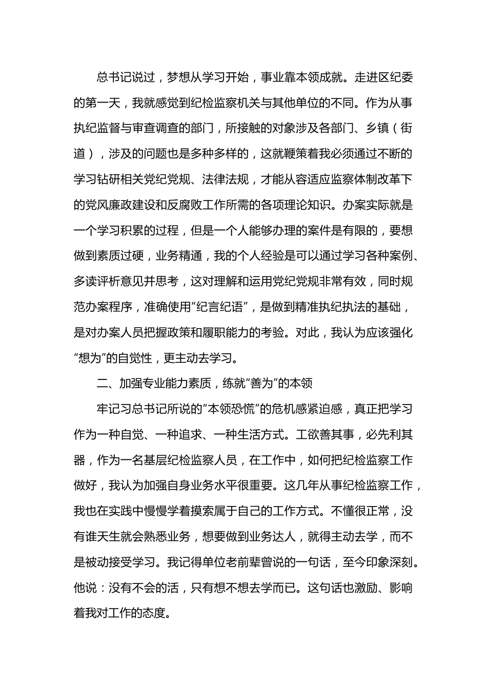 在“五四”青年节座谈会上的发言:以实干担当争做“四为”的纪检监察干部尊敬的各位领导、同志们按照组织安排,今天很荣幸能和大家分享下我的体会,今天我交流的题目是《以实干担当争做“四为”的纪检监察干部》。习近平总书记在2022年3月份的中央党校(国家行政学院)中青年干部培训班开班式上强调,青年干部必须筑牢理想信念根基,树立和践行正确政绩观,练就过硬本领,发扬担当和斗争精神,在新时代新征程上留下无悔的奋斗足迹。前几天,总书记在中国人民大学考察时再次提出殷切希望,希望广大青年用脚步丈量祖国大地,用眼睛发现中国精神,用内心感应时代脉搏,把对祖国血浓于水、与人民同呼吸共命运的情感贯穿学业全过程、融汇在事业追求中。深入学习总书记的讲话精神,我感悟颇深。作为一名有着10年党龄的青年纪检监察干部,我认为做好新时代青年干部,要以实干作担当,切实做到“四为”。一、加强学习助力梦想,增强“想为”的干事自觉性习近平总书记说过,梦想从学习开始,事业靠本领成就。走进区纪委的第一天,我就感觉到纪检监察机关与其他单位的不同。作为从事执纪监督与审查调查的部门,所接触的对象涉及各部门、乡镇(街道),涉及的问题也是多种多样的,这就鞭策着我必须通过不断的学习钻研相关党纪党规、法律法规,才能从容适应监察体制改革下的党风廉政建设和反腐败工作所需的各项理论知识。办案实际就是一个学习积累的过程,但是一个人能够办理的案件是有限的,要想做到素质过硬,业务精通,我的个人经验是可以通过学习各种案例、多读评析意见并思考,这对理解和运用党纪党规非常有效,同时规范办案程序,准确使用“纪言纪语”,是做到精准执纪执法的基础,是对办案人员把握政策和履职能力的考验。对此,我认为应该强化“想为”的自觉性,更主动去学习。二、加强专业能力素质,练就“善为”的本领牢记习总书记所说的“本领恐慌”的危机感紧迫感,真正把学习作为一种自觉、一种追求、一种生活方式。工欲善其事,必先利其器,作为一名基层纪检监察人员,在工作中,如何把纪检监察工作做好,我认为加强自身业务水平很重要。这几年从事纪检监察工作,我也在实践中慢慢学着摸索属于自己的工作方式。不懂很正常,没有谁天生就会熟悉业务,想要做到业务达人,就得主动去学,而不是被动接受学习。我记得单位老前辈曾说的一句话,至今印象深刻。他说:没有不会的活,只有想不想去学而已。这句话也激励、影响着我对工作的态度。三、强化实干担当,激发“敢为”的动力习总书记强调,“能否敢于负责、勇于担当,最能看出一个干部的党性和作风。”我们正处在大有可为的新时代,唯有牢记初心使命勇于担当作为、善于攻坚克难,才能抓住机遇。作为青年干部,只有实干,落实到具体工作中,通过善于区分清轻重缓急,做实做细每项领导交代的工作。以务实的工作作风,内生“敢为”的动力,唯有此,才能踏实。特别是在纪检监察工作,更要认识到敢抓敢管,敢于较真,在政治上讲忠诚,组织上讲服从,行动上讲纪律,始终把政治纪律摆在第一位,严格执纪问责制度,坚持党中央重大决策部署到哪里,监督检查就跟进到哪,紧紧围绕区委、区政府的决策部署。同时也结合党史学习教育和“再学习、再调研、再落实”活动积极学习“自强不息、求实创新、团结拼搏、奋力争先”的二次创业的***精神,持续加强作风建设,努力做到为***“十四五”规划落地生根提供纪律保障。四、强化自我修养,提升“乐为”的境界习近平总书记指出,年轻干部要提高政治能力。在干部干好工作所需的各种能力中,政治能力是第一位的。有了过硬的政治能力,才能做到同党中央保持高度一致,在任何时候任何情况下都能“不畏浮云遮望眼”。作为纪检监察部门,是整治群众身边腐败和不正作风的“把关口”,社会关注度高,是被围猎的重点对象,思想防线只要有放松,就容易摔跟头。对于个人来说,只有找准自己的定位方向,加强党性修养,把牢政治思想防线,管住行为,永葆清正廉洁的政治本色才能做好纪检监察工作。对此,要在本职岗位上有所为并乐为,珍惜在工作上的岗位,以乐为的心态学习,脚踏实地的办实事,我相信对于个人成长都...