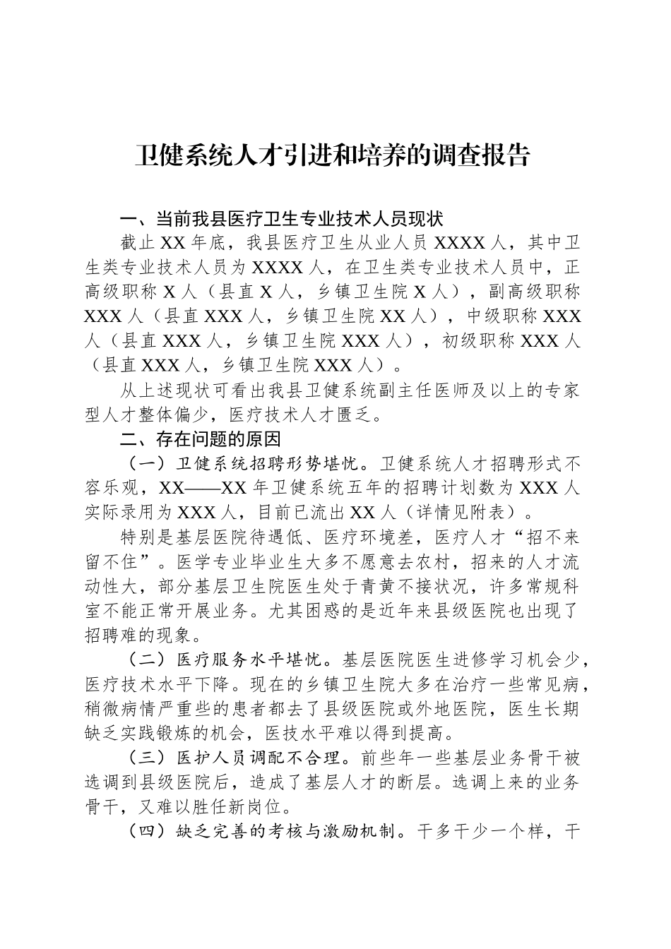 卫健系统人才引进和培养的调查报告一、当前我县医疗卫生专业技术人员现状截止XX年底,我县医疗卫生从业人员XXXX人,其中卫生类专业技术人员为XXXX人,在卫生类专业技术人员中,正高级职称X人(县直X人,乡镇卫生院X人),副高级职称XXX人(县直XXX人,乡镇卫生院XX人),中级职称XXX人(县直XXX人,乡镇卫生院XXX人),初级职称XXX人(县直XXX人,乡镇卫生院XXX人)。从上述现状可看出我县卫健系统副主任医师及以上的专家型人才整体偏少,医疗技术人才匮乏。二、存在问题的原因(一)卫健系统招聘形势堪忧。卫健系统人才招聘形式不容乐观,XX——XX年卫健系统五年的招聘计划数为XXX人实际录用为XXX人,目前已流出XX人(详情见附表)。特别是基层医院待遇低、医疗环境差,医疗人才“招不来留不住”。医学专业毕业生大多不愿意去农村,招来的人才流动性大,部分基层卫生院医生处于青黄不接状况,许多常规科室不能正常开展业务。尤其困惑的是近年来县级医院也出现了招聘难的现象。(二)医疗服务水平堪忧。基层医院医生进修学习机会少,医疗技术水平下降。现在的乡镇卫生院大多在治疗一些常见病,稍微病情严重些的患者都去了县级医院或外地医院,医生长期缺乏实践锻炼的机会,医技水平难以得到提高。(三)医护人员调配不合理。前些年一些基层业务骨干被选调到县级医院后,造成了基层人才的断层。选调上来的业务骨干,又难以胜任新岗位。(四)缺乏完善的考核与激励机制。干多干少一个样,干与不干一个样,乡镇卫生院没有完善的考核与激励机制,人才潜能难以得到有效挖掘。三、解决问题的措施(一)开展“县管乡用”和“乡聘村用”工作。首先,统一制定“县管乡用”和“乡聘村用”招聘计划。招聘工作由县级医院或县级卫健部门统一组织开展,县域医共体范围内乡镇卫生院“打捆组团”参加。由县级医院根据县域医共体范围内乡镇卫生院和村卫生室业务发展和实际需要提出用人计划,县级卫健部门核定县域医共体内乡镇卫生院的空余编制数,统一制定招聘方案。其次,灵活设置招聘条件。基层岗位招聘一般仅设置专业学历、年龄等方面基本条件。招聘初级专业技术人员,条件一般为具有医药卫生类大专以上学历或执业(助理)医师资格,年龄放宽至XX周岁;招聘中、高级专业技术人员,年龄可放宽至XX周岁。同等条件下,中心卫生院对具有执业助理医师以上资格、一般卫生院对具有乡村执业助理医师以上资格的乡村医生优先招聘。艰苦边远乡镇卫生院可以拿出不超过本县乡镇卫生院招聘计划的XX%,面向本县户籍人员招聘。对中心卫生院引进医药卫生类本科以上学历或执业医师资格、一般乡镇卫生院引进医药卫生类大专以上学历或执业助理医师资格人才的,以及急需紧缺人才和高层次人才可简化程序,采取校园招聘或直接考察方式招聘。再次,签订聘用合同。由县级医院根据基层医疗服务需求乡镇卫生院、村卫生室地域分布和拟聘人员综合素质等情况,确定分配去向。基层岗位拟聘人员分别纳入县级医院、乡镇卫生院统筹管理,与其建立人事关系,并与定岗的村卫生室、乡镇卫生院、县级医院签订聘用合同,按规定落实乡镇卫生院编制、岗位及工资待遇。基层岗位新招聘人员在乡镇卫生院或村卫生室在岗服务满X年后,根据县级医院和乡镇卫生院岗位需要,并结合本人意愿,经考核合格,分别按一定比例择优调回县级医院和乡镇卫生院工作。如未通过考核,则继续留在原单位,其人事编制关系转至镇卫生院(社区卫生服务中心),继续享受所在乡镇卫生院岗位编制人员待遇。(二)制定优惠政策引进和培育人才。县级医共体每年可拿出一定比例的编制招聘县外有意愿回来的XX籍或配偶为XX籍的医生,对于具有中级职称人员年龄可放宽到XX周岁,特需人才可放宽到XX周岁。其他职能部门对其配偶就业及子女就学给予支持。同时采取多种方式培育人才,通过“走出去”和“请进来”的形式,提高医护人员水平,探索设立“名医工作室”,县级相关职部门要出台指导意见,制定合理薪酬区间,并给予医院一定的自主权。(三)加大对基层技术扶持力度。加强县级医疗卫生人才对乡镇卫生院(社区卫生服务中心)技术扶持力度。严格落实原国家卫生计生委、中医药管理局...