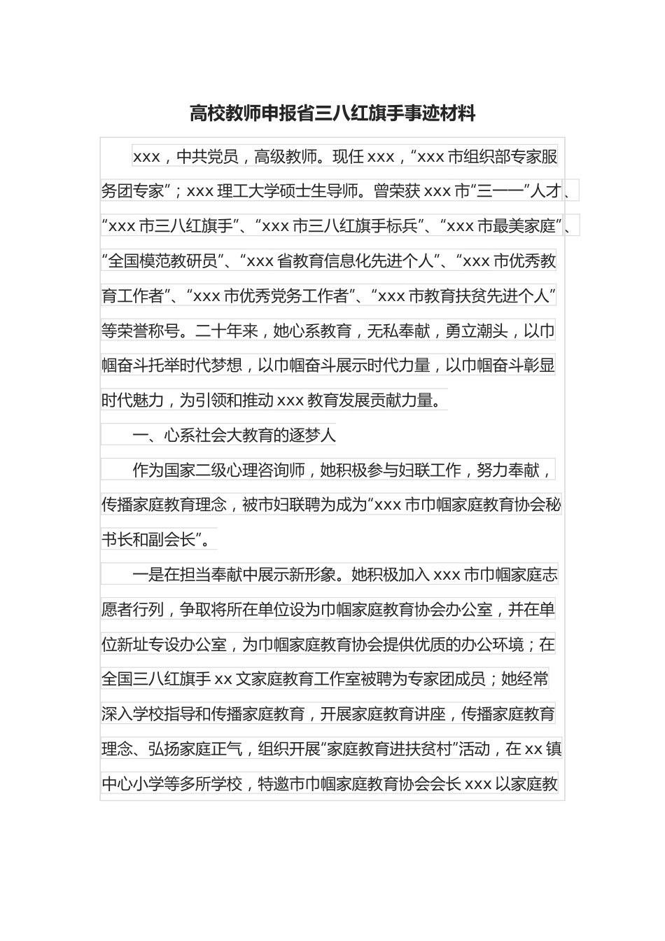 高校教师申报省三八红旗手事迹材料xxx,中共党员,高级教师。现任xxx,“xxx市组织部专家服务团专家”;xxx理工大学硕士生导师。曾荣获xxx市“三一一”人才、“xxx市三八红旗手”、“xxx市三八红旗手标兵”、“xxx市最美家庭”、“全国模范教研员”、“xxx省教育信息化先进个人”、“xxx市优秀教育工作者”、“xxx市优秀党务工作者”、“xxx市教育扶贫先进个人”等荣誉称号。二十年来,她心系教育,无私奉献,勇立潮头,以巾帼奋斗托举时代梦想,以巾帼奋斗展示时代力量,以巾帼奋斗彰显时代魅力,为引领和推动xxx教育发展贡献力量。一、心系社会大教育的逐梦人作为国家二级心理咨询师,她积极参与妇联工作,努力奉献,传播家庭教育理念,被市妇联聘为成为“xxx市巾帼家庭教育协会秘书长和副会长”。一是在担当奉献中展示新形象。她积极加入xxx市巾帼家庭志愿者行列,争取将所在单位设为巾帼家庭教育协会办公室,并在单位新址专设办公室,为巾帼家庭教育协会提供优质的办公环境;在全国三八红旗手xx文家庭教育工作室被聘为专家团成员;她经常深入学校指导和传播家庭教育,开展家庭教育讲座,传播家庭教育理念、弘扬家庭正气,组织开展“家庭教育进扶贫村”活动,在xx镇中心小学等多所学校,特邀市巾帼家庭教育协会会长xxx以家庭教育为主题开展讲座;积极协同对接中国管理科学研究院职业教育研究院,“百万家庭科学教养管理工程暨家庭教育管理师培训与就业工作”在xxx省xxx市正式启动和举行,上百名家庭教育骨干教职工参与此次培训,并考取证书。二是心系社会发挥新作用。她心系大教育,以家庭教育为抓手,不断为妇联工作提供智力支持,为巾帼风采添砖加瓦。撰写的新时代家长教育发展现状与问题实证研究——以xxx市为例,被核心刊物《中国教师》杂志刊登;2019年,被选为“xxx市最美家庭”称号;在xxx家妹子《家庭教育大家谈》栏目接受采访,赢得社会各界一致好评。在市妇联开展的“微悦听”活动中,她讲述的xx进行展播;在“最美家庭”网评中,她的家庭荣登榜首;作为优秀的女干部参加了市委组织部、市直机关工委、市妇联联合举办的“xxx市优秀女干部党性教育暨赣南新妇女运动培训班”,并将其培训期间所思所想详实的记录下来,在“xxx家妹子”公众号展播,供更多的女干部学习借鉴;被邀请至xxx家妹子“防控疫情·家庭教育系列”微课堂中,讲授“心理防疫”怎么做,为众多家庭提供切实的缓解指南;在xxx市巾帼家庭教育协会年度工作会上,被评为xxx家妹子”《微课堂》优秀网课以及报刊优秀课题获奖者。三是凝心聚力引领新风尚。作为xxx市教育局市直教育系统妇联副主席,她积极组织开展妇联活动。组织女教职工参加“xxx市庆三八健身舞大赛”,从节目编排到视频录制,整合优质资源,全程专业指导,最终以编排巧妙的《xx》健身舞喜夺大赛金奖;组织市教育局机关和局属教育单位妇女代表40余人,以红色诗歌朗诵为主题,共同庆祝“三八”妇女节活动;创新融合家庭教育与社区教育,在2021年全民终身学习活动周,开展家庭教育讲座、“xxx”等心理辅导教学活动,为巾帼内涵发展提供了高质量平台。二、深耕细作钻业务的弄潮儿带领xxx教育信息化工作全省领先,积极推动xxx教育的改革与发展,案例全国推广。一是多项成果荣获国省级奖项。主持国家级课题《xx》等多项成果荣获xxx省基础教育教学成果二等奖,被全国科技项目创新成果鉴定数据库收录;参与研究国家级课题《xxx》被评为全国优秀课题,被省科技厅鉴定为“xxx省科技成果”。二是教育信息化学术能力全国认可。被国家重点学术期刊《中小学信息技术教育》刊登杂志封面人物;应邀在教育部“第十五届中国教育信息化创新与发展论坛”、“全国信息化创新大赛”现场会、全国智慧课堂研讨会、全省教育信息化工作会等做专题报告,xxx经验推广;连续十余年被中央电教馆聘为“全国新媒体新技术创新课堂教学大赛评委”,被授予“全国模范教研员”称号(全国仅九名),在多次全国现场比赛中担任主持人和评委组组长,大会做课例点评发言。三是典型案例全国推广。疫情期间,指导“停课不停学活动”,xxx%中小学校、xxx万余名学生顺利开展网络教学;指导x...