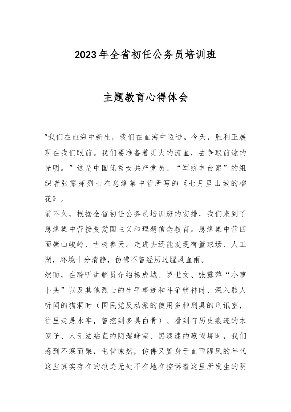 2023年全省初任公务员培训班主题教育心得体会“我们在血海中新生,我们在血海中迈进。今天,胜利正展现在我们眼前。我们要准备着更大的流血,去争取前途的光明。”这是中国优秀女共产党员、“军统电台案”的组织者张露萍烈士在息烽集中营所写的《七月里山城的榴花》。前不久,根据全省初任公务员培训班的安排,我们来到了息烽集中营接受爱国主义和理想信念教育。息烽集中营四面崇山峻岭、古树参天。走进去还能发现有篮球场、人工湖,环境十分清静,仿佛不曾经历过腥风血雨。然而,在聆听讲解员介绍杨虎城、罗世文、张露萍“小萝卜头”以及其他烈士的生平事迹和斗争精神时、深入骇人听闻的猫洞时(国民党反动派的使用多种刑具的刑讯室,往里走是水牢,曾挖到多具白骨)、看到有历史痕迹的木笼子、人无法站直的阴湿暗室、黑漆漆的瞭望塔时,我们感到不寒而栗,毛骨悚然,仿佛又置身于血雨腥风的年代这些真实存在的痕迹无处不在地在控诉着这里所发生的阴森、残暴、恐怖。这不是度假山庄,这是一个,无数革命先烈英勇斗争和流血牺牲的地方。革命先烈为了民族解放事业献出宝贵生命,他们在经受着敌人们的严刑逼供时没有妥协半点,各种刑具只是让他们的党性散发出坚强、璀璨的光芒,并点燃了革命的火种,抓住了民族的希望,将鲜血洒在黑恶势力面前。重温昨天,我们才能更清楚地知道应该如何对待今天和明天。尽管战火年代已隔我们很远,但唯有继承老一辈革命先烈的精神和钢铁般的意志,才是对那些逝去生命的最好回应。如何更好地继承老一辈革命先烈的精神和钢铁般的意志呢?我想,在学习贯彻习近平新时代中国特色社会主义思想主题教育的主题活动中,我找到了答案。在这个充满希望与挑战的新时代,伟大事业不可能一蹴而就,需要长期奋斗不懈奋斗,需要一代代共产党人善作善成、久久为功,不断在新征程上再建新功。深入开展学习贯彻习近平新时代中国特色社会主义思想主题教育,为我们指明了新时代的根本方向,也为我们解决实际问题提供了有力武器,更为我们继承老一辈革命先烈的精神和意志提供了根本遵循。理论学习不仅需要我们做到心中有数,还要做到融会贯通贯穿于实际生活的始终。我们要在学习中不断深化对理论的理解,同时借助实践的力量,将理论真谛贯彻到生活的方方面面。这样,才能在实践中更好地把握规律,更有效地解决问题。在庆祝中国共产主义青年团成立100周年大会上,习近平总书记指出“新时代的中国青年,生逢其时、重任在肩,施展才干的舞台无比广阔,实现梦想的前景无比光明”,强调“党和国家的希望寄托在青年身上!”我们作为新时代的青年力量,在新征程中,不能只享受着先辈们的硕果,和平年代仍然要有以身许党许国,担当我所担当的心态,接续传承革命先烈的精神和意志,勇于担当,敢于作为,以爱岗敬业、忘我奉献的工作热忱下足“绣花功夫”,绵绵用力绣出“山河锦绣”。在焕发作为勇于担当、锐意斗争中下功夫,始终保持“敢为人先”的拼搏意志、树牢“舍我其谁”的勇毅情怀、激发“朝夕必争”的进取状态,切实推进主题教育和中心工作融合推进取得实效,在这片广袤的天地之间,书写出属于我们的辉煌篇章。
