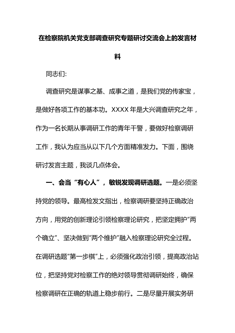 在检察院机关党支部调查研究专题研讨交流会上的发言材料同志们:调查研究是谋事之基、成事之道,是我们党的传家宝,是做好各项工作的基本功。XXXX年是大兴调查研究之年,作为一名长期从事调研工作的青年干警,要做好检察调研工作,我认为应当从以下几个方面精准发力。下面,围绕研讨发言主题,我谈几点体会。一、会当“有心人”,敏锐发现调研选题。一是必须坚持党的领导。最高检发文指出,检察调研要坚持正确政治方向,用党的创新理论引领检察理论研究,把坚定拥护“两个确立”、坚决做到“两个维护”融入检察理论研究全过程。在调研选题“第一步棋”上,必须强化政治引领,提高政治站位,把坚持党对检察工作的绝对领导贯彻调研始终,确保检察调研在正确的轨道上稳步前行。二是尽量开展实务研究。作为基层检察机关,应当从检察实务方面着手,开展司法实务研究。围绕县委和上级检察机关中心工作、推进检察工作现代化、司法体制改革以及司法办案等,紧密结合工作实际,开展调查研究工作。XX是沿江农业大县,境内又有XX河、X河、X湖等重要河湖资源,我们可以充分发挥检察职能作用,聚焦水安全、水环境、生态安全等方面开展实地调研,形成高质量调研报告供县委决策,从而推动XX流域综合治理扎实有效开展。三是务必做到“以小见大”。开展调查研究,是一项综合性、系统性工作,而且检察工作涵盖各个方面,不能不分重点、“眉毛胡子一把抓”。要坚持从“小口径”切入,在某一个方面进行深入思考,进一步“花心思”“做文章”,从而确保调研选题“小而实”,避免“大而空”。二、善当“参谋长”,科学谋划调研思路。调研选题确定后,就要开始谋划开展调查研究一系列工作,把“如何做”落到实处。一是加强组织领导。针对选定的重大调研课题,要坚持院党组总揽全局、相关部门牵头负责的原则,抽调相关业务办案部门和法律政策研究部门的精干力量,成立调研工作专班。针对一般课题,制定专门文件,量化调研任务,在定人、定题定量、定时等方面跟踪督办,促使调研课题尽快落实,理论文章尽快“出炉”,以便成功转化。二是写好调研方案。按照当前调研工作任务要求,结合基层检察工作实际情况,制定实际可行、操作性强的专题调研方案。方案包括熟悉调研背景、明确调研目的、细化调研内容、量化调研任务、强化责任落实、丰富调研方式、加强跟进督办、扩大调研成果等各方面。三是统筹各方力量。一方面,青年干警是基层院调研战的“主力军”,要充分发挥青年干警在调查研究、文章写作等方面的优势,教育引导他们扎实做好方案草拟、走访调查、提纲写作、论文撰写、成果转化等相关工作。另一方面,要借助高校、科研院所的人才、资源、智力等优势,深入开展“检校合作”。四是做好综合保障。检察调研是一项强度高、难度大、耗时长、见效慢的系统工程。基层院要在人员、经费、物资等方面,为调研专班,特别是从事调研工作的青年干警提供必要的后勤保障,让他们沉下身心,扎实开展调研工作。三、勇当“执行者”,深入开展调查研究。调研方案制定后,就应当按照方案要求,稳步实施相关调研工作。在实施阶段可以采取多种方式开展调查研究。一是“沉下来”了解情况。紧紧围绕选定的调研课题,结合平时司法办案,采取翻阅历史文献、询问办案人员、查看台账资料、登录网站查询、搜集相关资料等多种方式,开展调查研究,掌握一手资料。二是“请进来”征求意见。针对选题涉及的问题,可以结合司法办案公开听证、“检察开放日”等活动,邀请人大代表、政协委员、人民监督员以及相关行政执法机关工作人员,集中召开座谈会。通过座谈深入交流,征求与会人员的意见建议。会后将意见建议进行收集、归纳、汇总、分析,为下一步撰写调研报告奠定基础。三是“走出去”拓宽视野。一方面,在调研方案指导下,通过咨询相关部门、实地调查走访等方式,对选定的调研课题进行深入调查研究。期间,可以采用随机走访、电话询问等多种方式和途径,全面了解情况。另一方面,可以组织调研专班人员,到调研工作开展得好的单位、部门“求取真经”,学习借鉴他们的先进经验和做法,取长补短,为我所用。四、甘当“苦行僧”,认真写好调研...
