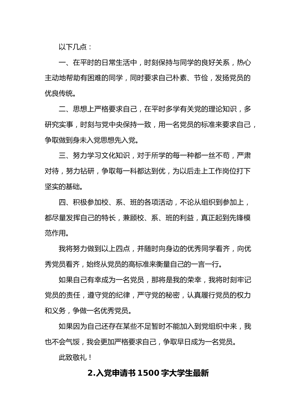 入党申请书1500字大学生最新(10篇)1.入党申请书1500字大学生最新敬爱的党组织:您好!我是在校大学生,我自愿加入中国共产党,中国共产党是中国工人阶级的先锋队,是中国各族人民利益的忠实代表,是中国社会主义事业的领导核心。中国共产党的最终目标是实现共产主义的社会制度。在经过了十几年的艰苦学习后,我如愿的考上了大学。不过我并没有丝毫的放松,我知道在大学里有更多的事情要我来做。我也知道在大学里除了要学习外,不断的提高自己的思想素质和申请入党是很重要的事情。我在上大学之前就通过亲戚和朋友知道了在大学最要做的事情,我知道了在大学要做什么,我知道了入党的重要性!作为一名团员,一名党的先锋队的一员,我一直严格要求自己,用实际行动来证明团员的价值,团员的先锋作用,随着年龄与文化知识的增长,我对党的认识也越来越深,加入到党组织中来的愿望也越来越强烈。所以在平时我不断加强自身修养,经常学习党的理论认识,用党性来武装自己的头脑,在实际行动上,积极与党中央保持一致,积极参加团的各项活动,时刻争做一名优秀团员。升入大学以来,从学习环境、文化程度上都进入了我人生的一个新起点,从思想上我对自己也有了更进一步的要求,即争取早日加入到党组织中来。为了规范自己的行为,指正思想的航向,我争取做到以下几点:一、在平时的日常生活中,时刻保持与同学的良好关系,热心主动地帮助有困难的同学,同时要求自己朴素、节俭,发扬党员的优良传统。二、思想上严格要求自己,在平时多学有关党的理论知识,多研究实事,时刻与党中央保持一致,用一名党员的标准来要求自己,争取做到身未入党思想先入党。三、努力学习文化知识,对于所学的每一种都一丝不苟,严肃对待,努力钻研,争取每一科都达到优,为以后走上工作岗位打下坚实的基础。四、积极参加校、系、班的各项活动,不论从组织到参加上,都尽量发挥自己的特长,兼顾校、系、班的利益,真正起到先锋模范作用。我将努力做到以上四点,并随时向身边的优秀同学看齐,向优秀党员看齐,始终从党员的高标准来衡量自己的一言一行。如果自己有幸成为一名党员,那将是我的荣幸,我将时刻牢记党员的责任,遵守党的纪律,严守党的秘密,认真履行党员的权力和义务,争做一名优秀党员。如果因为自己还存在某些不足暂时不能加入到党组织中来,我也不会气馁,我会更加严格要求自己,争取早日成为一名党员。此致敬礼!2.入党申请书1500字大学生最新敬爱的党组织:我志愿加入中国共产党,愿意为共产主义事业奋斗终身。我衷心地热爱党,她是中国工人阶级的先锋队,是中国各族人民利益的忠实代表,是中国社会主义事业的领导核心。作为一名中国人,作为一个渴望上进,渴望为国家的发展作出贡献的一名大学生,在此诚恳地哀求党组织能够批准我的入党请求,让我成为一名中国共产党员,让我能有机会在中国共产党的领导下,为社会、为国家、为人民作贡献。并且,从今天开始,便会在工作、学习及生活中用中国共产党的言行来严格要求自己。假使我能够被批准入党,那么我在以后的生活中肯定会对自己的要求更加严格,在学习上更加努力,使自己成为一名真正的、名副其实的共产党员,并在以后的工作中尽职尽责,以国家、人民利益为重,为社会主义事业的发展作贡献。倘若党组织以为我还有不足之处,还不能成为一名合格的共产党员,我也不会因此而灰心丧气,我会诚恳地接受党组织的建议反思自己的不足,并在以后的生活中不断地改进,努力完善自我,使自己能够具备成为中国共产党的条件,而在来年再请求。从小时候起,中国共产党就如一颗明星照亮了我的世界,因为我美好的童年生活来源于中国共产党领导下的和谐社会。高中时,学校也曾不止一次的对我们进行党的有关教育,可毕竟有限,每个人都处于懵懵懂懂的状态,只有极少数极为优秀的同学通过了党的考验,成为预备党员。虽然我没有这个机会在少年时期加入伟大的党,不过我自小就是在一个热爱党的环境中长大,因为我的父亲、外公、外婆、爷爷等人都是党员,并且我的表姐也于去年光荣的成为了一名预备党员。现在,我已成为xx大学的一名学生,入校以后,我接触到了许多优秀的...