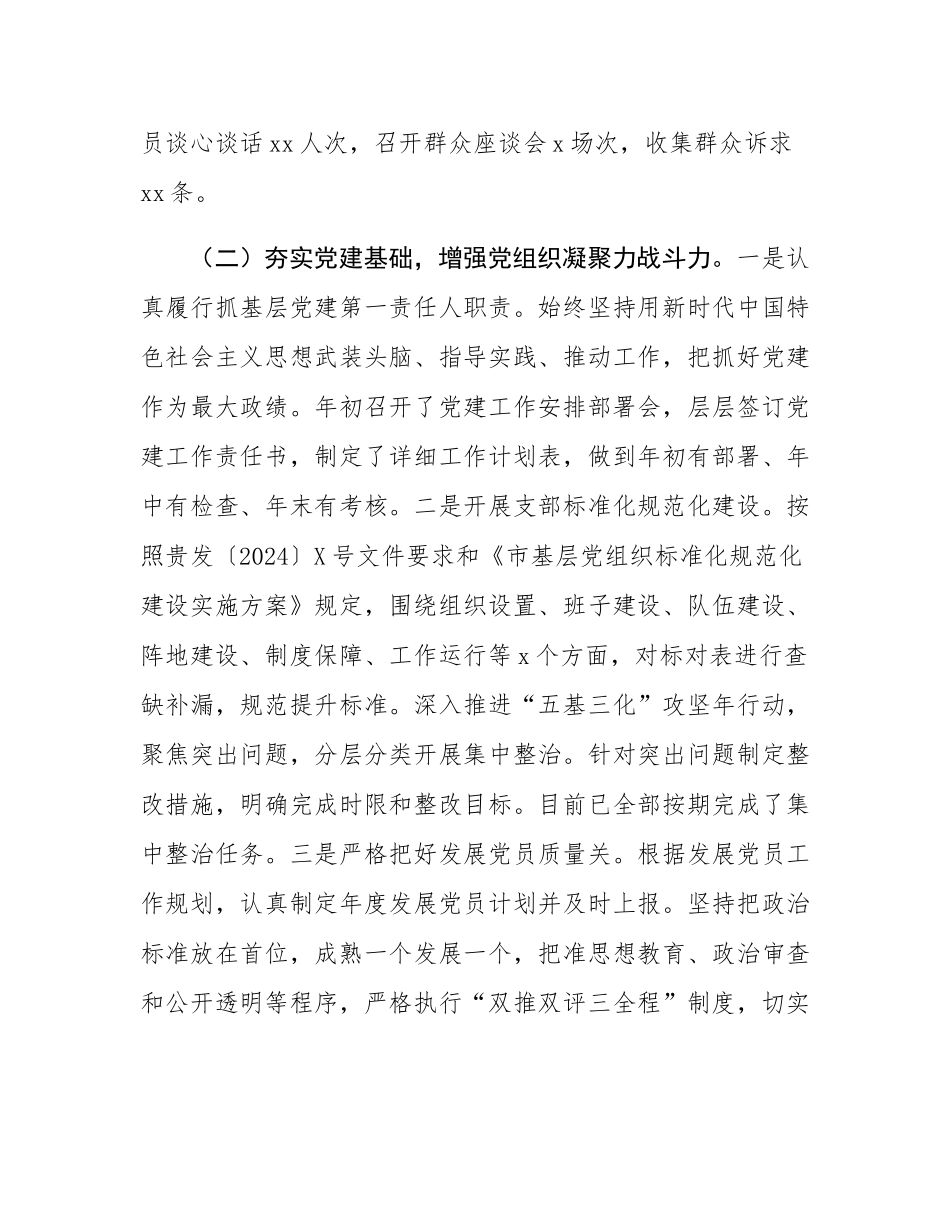 2024年党组书记抓基层党建工作述职报告一、党建工作开展情况(一)强化政治建设,筑牢“两个维护”根本政治任务。一是全面贯彻党的二十届三中全会精神。把学习宣传贯彻党的二十届三中全会精神作为首要政治任务,在全面学习、全面把握、全面落实上下功夫求实效,通过集体研讨、专题党课、现场教学、理论测试等方式,开展集中宣讲活动xx次。深入开展“大学习、大讨论、大宣传、大实践”活动,把学习成果转化为纵深推进全面从严治党的自觉行动,转化为推进改革发展稳定各项工作的实际行动。二是严守政治纪律和政治规矩。坚决抓好中央巡视反馈意见整改落实,根据市委巡察整改专项督查组工作要求,组织召开了落实中央巡视反馈意见整改动员部署会,制定了整改方案和问题清单,建立了整改台账,细化了xx项具体措施,明确了牵头领导、责任部门和完成时限,目前已完成整改xx项。三是严肃党内政治生活。严格执行新形势下党内政治生活的若干准则,坚持和完善民主生活会、组织生活会、谈心谈话、民主评议党员等制度。截至11月底,开展领导班子民主生活会x次,党支部组织生活会x次,班子成员谈心谈话xx人次,召开群众座谈会x场次,收集群众诉求xx条。(二)夯实党建基础,增强党组织凝聚力战斗力。一是认真履行抓基层党建第一责任人职责。始终坚持用新时代中国特色社会主义思想武装头脑、指导实践、推动工作,把抓好党建作为最大政绩。年初召开了党建工作安排部署会,层层签订党建工作责任书,制定了详细工作计划表,做到年初有部署、年中有检查、年末有考核。二是开展支部标准化规范化建设。按照贵发〔2024〕X号文件要求和《市基层党组织标准化规范化建设实施方案》规定,围绕组织设置、班子建设、队伍建设、阵地建设、制度保障、工作运行等x个方面,对标对表进行查缺补漏,规范提升标准。深入推进“五基三化”攻坚年行动,聚焦突出问题,分层分类开展集中整治。针对突出问题制定整改措施,明确完成时限和整改目标。目前已全部按期完成了集中整治任务。三是严格把好发展党员质量关。根据发展党员工作规划,认真制定年度发展党员计划并及时上报。坚持把政治标准放在首位,成熟一个发展一个,把准思想教育、政治审查和公开透明等程序,严格执行“双推双评三全程”制度,切实做到程序严格、环节完备、纪律严明。截至目前共培养入党积极分子X名,发展预备党员X名,转正党员X名。(三)狠抓作风建设,营造干事创业浓厚氛围。一是坚持以上率下。带头遵守党的各项规章制度和廉洁从政有关规定,自觉接受组织监督和群众监督。坚持到所在支部和分管领域讲党课X次,到社区调研X次解决问题X个。督促各班子成员履行“一岗双责”,建立常态化谈心谈话机制X余次,及时了解掌握干部的思想动态。严格落实中央八项规定及其实施细则精神和省、市各项规定要求,从严管理干部队伍,持续改进作风。今年以来主持召开局党组会议X次,专题研究党风廉政建设工作X次,听取班子成员落实“一岗双责”情况汇报X次。二是加强廉政教育。充分利用集体学习、个人自学、专题研讨等形式学习《中国共产党纪律处分条例》《中国共产党廉洁自律准则》等党纪法规,引导广大党员干部增强廉洁自律意识,打牢反腐倡廉的思想基础;组织观看警示教育片XX部,参观反腐倡廉警示教育基地XX次,不断强化干部职工的廉洁从政意识和自觉抵制腐败行为的能力。三是聚焦民生保障。始终把为民办实事作为重要的政治任务来抓,积极解决群众关心的难点热点问题。在全市首创将社区干部工资与居民满意度挂钩机制,创新实施“红黑榜”晾晒制度;投入近X万元升级改造X个老旧小区;投入X余万元为X户困难老人改造居住环境;投入近X万元增加停车位近X个;组织开展各类惠民利民活动X场次,累计志愿服务时长约X小时。二、工作中存在问题及原因分析(一)存在的问题。一是理论学习不够深入。虽然能定期参与局党组理论中心组学习和支部集中学习,但由于日常工作事务繁重,自主学习时间较少,对党的新理论、新政策、新战略在学用转化上还不够深入细致。二是创新意识不强。习惯于用老思路来思考问题、推动工作,在破解制约公交事业发展的难点问题上办法不多、创新不足。三...