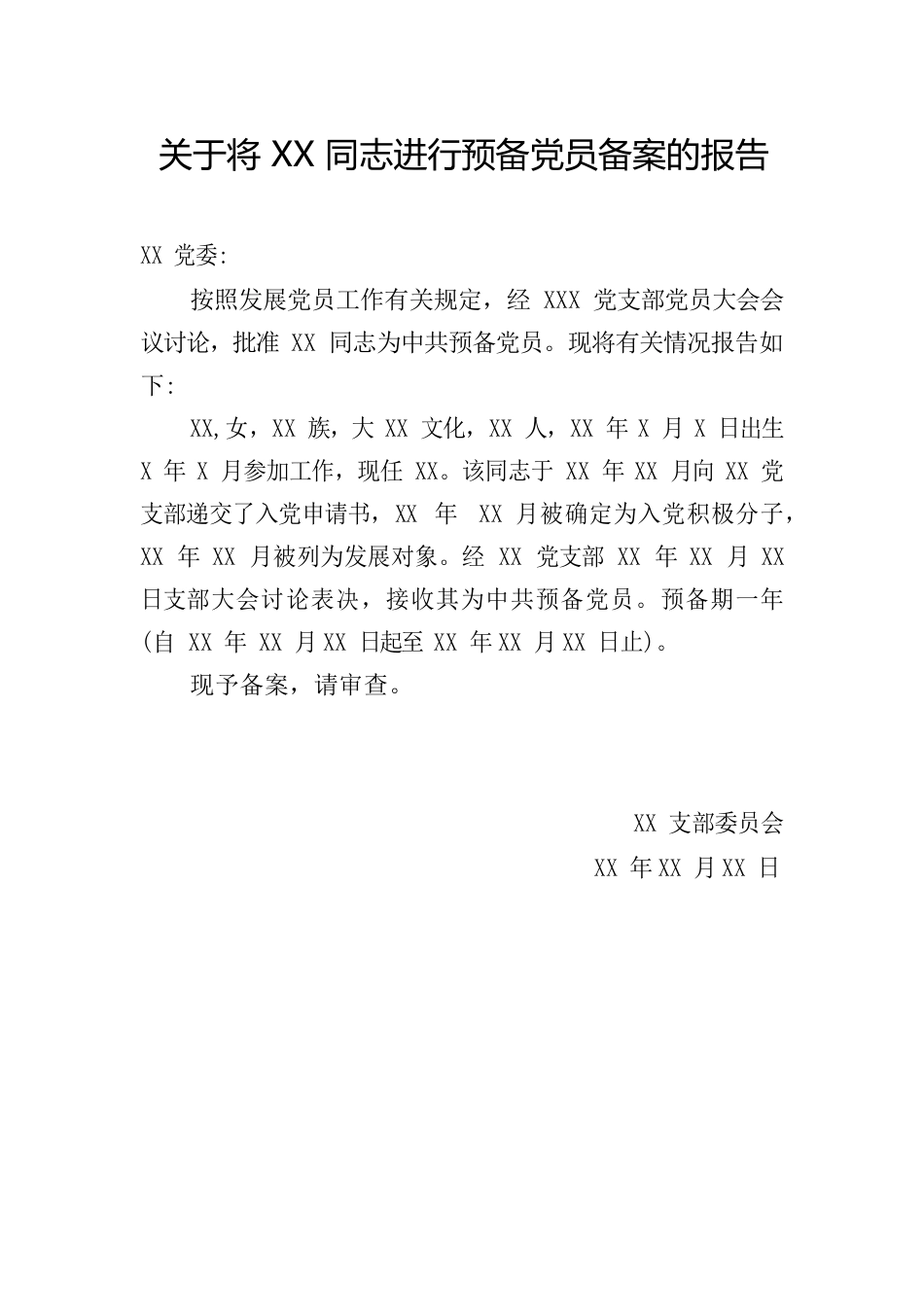 关于将XX同志进行预备党员备案的报告XX党委:按照发展党员工作有关规定,经XXX党支部党员大会会议讨论,批准XX同志为中共预备党员。现将有关情况报告如下:XX,女,XX族,大XX文化,XX人,XX年X月X日出生X年X月参加工作,现任XX。该同志于XX年XX月向XX党支部递交了入党申请书,XX年XX月被确定为入党积极分子,XX年XX月被列为发展对象。经XX党支部XX年XX月XX日支部大会讨论表决,接收其为中共预备党员。预备期一年(自XX年XX月XX日起至XX年XX月XX日止)。现予备案,请审查。XX支部委员会XX年XX月XX日