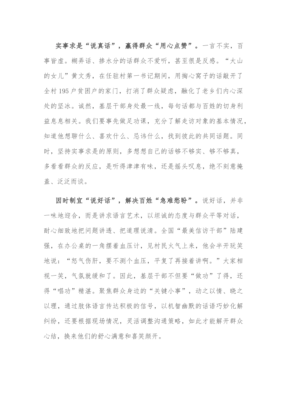 学习贯彻省部级专题研讨班心得体会:厚植为民情怀,践行为民宗旨在省部级主要领导干部“学习习近平总书记重要讲话精神,迎接党的二十大”专题研讨班上,习近平总书记科学深刻阐释中国式现代化一系列重大理论和实践问题,为奋力谱写全面建设社会主义现代化国家崭新篇章、实现第二个百年奋斗目标注入强大思想和行动力量。在研讨班上,习近平总书记指出,要坚持全心全意为人民服务的根本宗旨,树牢群众观点,贯彻群众路线。在实践中,和群众说上话、说真话、说好话,体现的是对群众“时时放不下”的责任感。若是摆上架子、做起哑巴,就会割裂干群间的血肉联系,让相亲相爱的“双向奔赴”变成渐行渐远的“背道而驰”。入乡随俗“说上话”,拉近干群“心理距离”。“这里我很熟悉,当年下乡就骑自行车来”“鞋子合不合脚,自己穿了才知道”,像这样的大白话在习近平总书记的讲话中随处可见。没有高高在上,没有官话套话,有的只是通俗的语言和“唠家常”式的交流。然而,和群众聊天并不是件容易的事,非下苦功夫不可。如果不会讲方言土语,不仅影响正常的沟通交流,也会让服务质量大打折扣。基层干部既要把身子“沉下去”,到田间地头、车间工厂、街头巷尾走一走、看一看,主动融入当地语言系统,少一些文绉绉的普通话,多一些原汁原味的乡里话,也要不断提升“翻译”政策的能力,把书面术语、专业名词解释清楚,让老百姓听得懂、听得明,达到入脑入心的效果。实事求是“说真话”,赢得群众“用心点赞”。一言不实,百事皆虚。糊弄话、掺水分的话群众不爱听,甚至很是反感。“大山的女儿”黄文秀,在任驻村第一书记期间,用掏心窝子的话敲开了全村195户贫困户的家门,打消了群众疑虑,融化了老乡们内心深处的坚冰。诚然,基层干部身处最一线,每句话都与百姓的切身利益息息相关。我们要事先做足功课,充分了解走访对象的基本情况,知道他想聊什么、喜欢什么、忌讳什么,找到彼此的共同话题。同时,坚持实事求是的原则,多想想自己的话够不够实、够不够真,多看看群众的反应,是听得津津有味,还是摇头叹息,绝不刻意掩盖、泛泛而谈。因时制宜“说好话”,解决百姓“急难愁盼”。说好话,并非一味地迎合,而是讲求语言艺术,以坦诚的态度与群众平等对话,耐心细致地把问题讲透、把道理说清。全国“最美信访干部”陆建强,在办公桌的一角摆着血压计,见村民火气上来,他会半开玩笑地说:“怒气伤肝,要不测个血压,平复了再接着讲啊。”大家相视一笑,气氛就缓和了。因此,基层干部不但要“做功”了得,还得“唱功”精湛。聚焦群众身边的“关键小事”,动之以情、晓之以理,通过肢体语言传达积极的信号,以机智幽默的话语巧妙化解纠纷,还要根据现场情况,灵活调整沟通策略,如此才能解开群众心结,换来他们的舒心满意和喜笑颜开。群众之事无小事,一枝一叶总关情。我们每一名党员干部都要传承和弘扬为民情怀。我们党植根于人民,来源于人民。作为党员干部,更是要在担当有为中厚植党的执政根基,切实关心人民百姓的身心利益以及民生问题,厚植为民情怀。