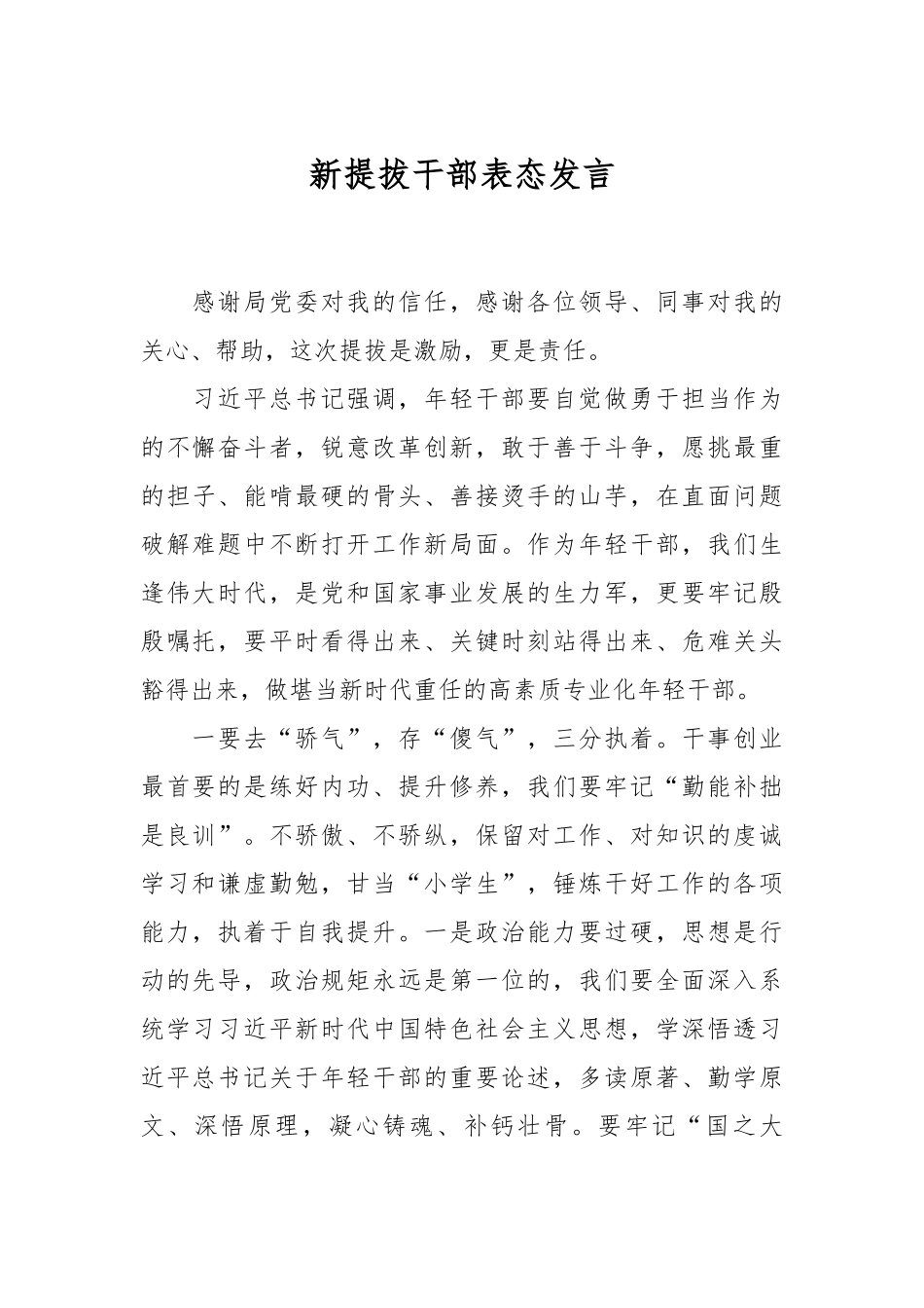 新提拔干部表态发言感谢局党委对我的信任,感谢各位领导、同事对我的关心、帮助,这次提拔是激励,更是责任。习近平总书记强调,年轻干部要自觉做勇于担当作为的不懈奋斗者,锐意改革创新,敢于善于斗争,愿挑最重的担子、能啃最硬的骨头、善接烫手的山芋,在直面问题破解难题中不断打开工作新局面。作为年轻干部,我们生逢伟大时代,是党和国家事业发展的生力军,更要牢记殷殷嘱托,要平时看得出来、关键时刻站得出来、危难关头豁得出来,做堪当新时代重任的高素质专业化年轻干部。一要去“骄气”,存“傻气”,三分执着。干事创业最首要的是练好内功、提升修养,我们要牢记“勤能补拙是良训”。不骄傲、不骄纵,保留对工作、对知识的虔诚学习和谦虚勤勉,甘当“小学生”,锤炼干好工作的各项能力,执着于自我提升。一是政治能力要过硬,思想是行动的先导,政治规矩永远是第一位的,我们要全面深入系统学习习近平新时代中国特色社会主义思想,学深悟透习近平总书记关于年轻干部的重要论述,多读原著、勤学原文、深悟原理,凝心铸魂、补钙壮骨。要牢记“国之大者”,不断提高政治判断力、政治领悟力、政治执行力,增强政治敏锐性和政治鉴别力,在大是大非、重大原则问题上时刻保持高度的政治警惕。二是专业知识要精通,人社是民生保障部门,一头连着经济一头连着民生,在不断涌现的新情况新问题中,我们要积极参加各类培训,努力成为专业化、全能化的“学者型”“专家型”“实干型”人社干部。注重党的创新理论和人社领域的政策,尤其是就业创业、社会保险、人事管理等新政策新论断,在实操中掌握最新方式方法,不断加深政策理解、革新服务理念三是综合素质要优秀,作为年轻干部,我们要始终保持“本领恐慌”的危机感,立足大局、聚焦中心、把握重点善于向经验、向他人学习,着力提高推动高质量发展本领服务群众本领、防范化解风险本领,自觉更新思想观念、补齐素质短板、提升能力弱项,确保问题解决的有效性和工作完成的高效性。二要去“莽气”,存“灵气”,五分智慧。我们常说年轻干部要有“四干”精神,即“踏实肯干、埋头苦干、科学巧干、真抓实干”,肯干、苦干、实干归根结底在于执着、勤奋,而巧干则决定了工作效率与质量。作为年轻干部,一方面,我们要明白工作不能一味蛮干、盲干,要忌浮躁、忌轻视,仔细对待每一项工作任务,敢于在工作中适时而变,创新工作方法和手段,力求发挥最好效果。在新形势的推动和新方法的实践下,善于用时代的眼光和发展的观点分析、思考问题,用改革发展的精神和科学的态度研究解决问题;要理清工作思路,分清轻重缓急,明确重点难点,确定突破口,切忌因循守旧,用惯性思维、老套路解决新问题新情况。另一方面,我们要明白工作原则性与灵活性的统一,人社工作千头万绪、繁琐复杂,政策的适用对象、范围千变万化,我们要维护政策的刚性与实施的柔性,充分领会文件内涵、任务重点,在抓住主要矛盾和矛盾的主要方面,有的放矢,善于领会工作的根本目的和深刻意图,不草率、不敷衍,深入践行宗旨意识,将工作真正干到群众点上、做到群众心里,确保能享受、应享受政策的群众都能满意,实现各项决策的初衷。三要去“小气”,存“霸气”,七分担当。无论是关键时刻站得出来,还是危难关头豁得出来,都要求我们有决策处事的大气和攻坚克难的魄力,做到“能文能武”,“文”要能静下来研究重大问题,“武”要能走出去协调工作推动工作。一方面,单位培养一个成熟干部需要大量精力与时间,我们更要珍惜工作中单位给我们搭的台子、架的梯子、压的担子,多参加基层实践锻炼,多经风雨、见世面、长才干,锻炼独立解决问题的能力,争取早日独当一面,尤其是在大事、急事、难事面前,多讲“我行、我上”,展现年轻干部令人信赖、可以依靠的风貌,挺身而出、战在一线,成为单位乃至区域建设发展的中流砥柱另一方面,我们要牢记团队意识,作为年轻干部,要主动承担起团队的“突击手”“先锋”“排头兵”等角色,在工作过程中敢于攻坚克难,不能畏首畏尾、推诿塞责,将年轻干部精力充沛、思维创新的良好优势充分发挥,多沟通、多交流,凝聚团队合力,按照时序...