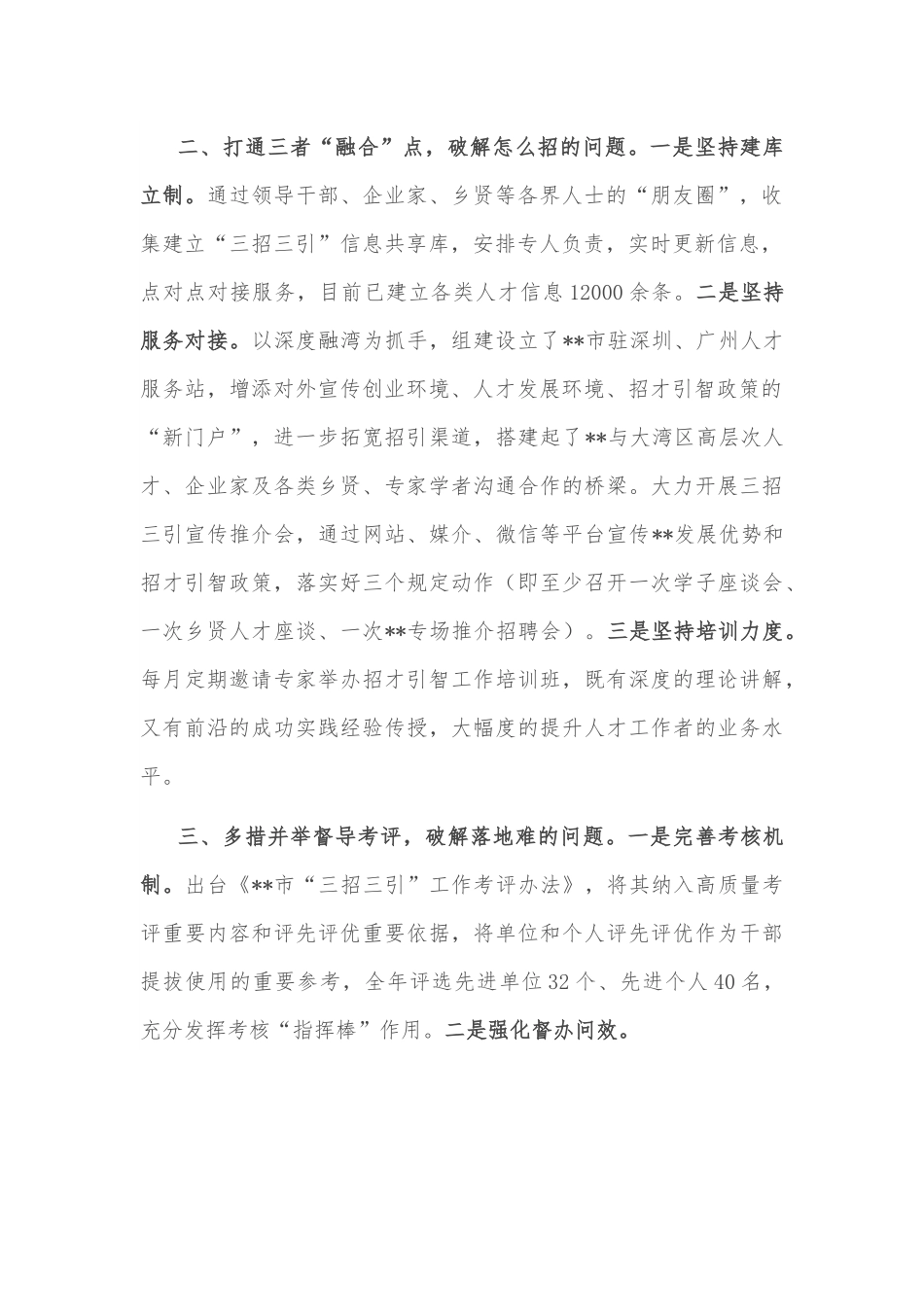 人才引进工作情况汇报今年以来,我市以深化人才发展体制机制改革为主线,围绕破解县级城市一直以来面临的人才引进难问题,创新思路,大力推动招商引资、招工引匠与招才引智深度融合,探索实施“三招融合”引才新模式,将招商、招工与招才同谋划、同部署、同调度、同考核,推动形成了领导带头、单位乡镇全员参与的招才全覆盖体系,为高质量发展提供智力支撑。一、合并重组三支队伍,破解谁来干的问题。一是打造科学组团。出台《**2022年招商引资暨招才引智工作实施方案》、《**市2022年招工招才工作实施方案》,量化招才选才任务,将任务分解到所有领导、单位乡镇,并组建成立20个专业招商招才团、4个专业招工招才团,推动形成领导带头、单位乡镇全员参与的招才任务全覆盖体系。二是打造领航驱动。市委主要领导担任“三招三引”工作领导小组组长,建立“每月一通报、每月一调度”工作推进机制,亲自调度亲自部署,大力推动招商引资、招工引匠与招才引智深度融合。三是打造头雁经济。每个领导、每个团和单位外出招商、招工的同时必须融合开展招才活动,围绕电子信息、新材料双首位产业,瞄准高新技术企业和科研院所,积极对接和引进高层次人才,做到“四个带出去、两个带回来”科学引才,即带着人才政策、岗位需求、目标人才信息、乡贤人才信息出去,带着人才和人才项目回来)。二、打通三者“融合”点,破解怎么招的问题。一是坚持建库立制。通过领导干部、企业家、乡贤等各界人士的“朋友圈”,收集建立“三招三引”信息共享库,安排专人负责,实时更新信息,点对点对接服务,目前已建立各类人才信息12000余条。二是坚持服务对接。以深度融湾为抓手,组建设立了**市驻深圳、广州人才服务站,增添对外宣传创业环境、人才发展环境、招才引智政策的“新门户”,进一步拓宽招引渠道,搭建起了**与大湾区高层次人才、企业家及各类乡贤、专家学者沟通合作的桥梁。大力开展三招三引宣传推介会,通过网站、媒介、微信等平台宣传**发展优势和招才引智政策,落实好三个规定动作(即至少召开一次学子座谈会、一次乡贤人才座谈、一次**专场推介招聘会)。三是坚持培训力度。每月定期邀请专家举办招才引智工作培训班,既有深度的理论讲解,又有前沿的成功实践经验传授,大幅度的提升人才工作者的业务水平。三、多措并举督导考评,破解落地难的问题。一是完善考核机制。出台《**市“三招三引”工作考评办法》,将其纳入高质量考评重要内容和评先评优重要依据,将单位和个人评先评优作为干部提拔使用的重要参考,全年评选先进单位32个、先进个人40名,充分发挥考核“指挥棒”作用。二是强化督办问效。加大督导考评力度,制定《三招三引工作督办问效制度》,建立工作督办、任务跟踪问效、每月动态通报制度,由市委督查室、市政府督查室纳入市级重点工作进行督办问效,每月通报一次进展落实情况,提升“三招三引”工作落实成效。截止目前,**市通过“三招三引”引才模式共引进国家级高层次人才18名,省级高层次人才36名,市级高层次人才78名。
