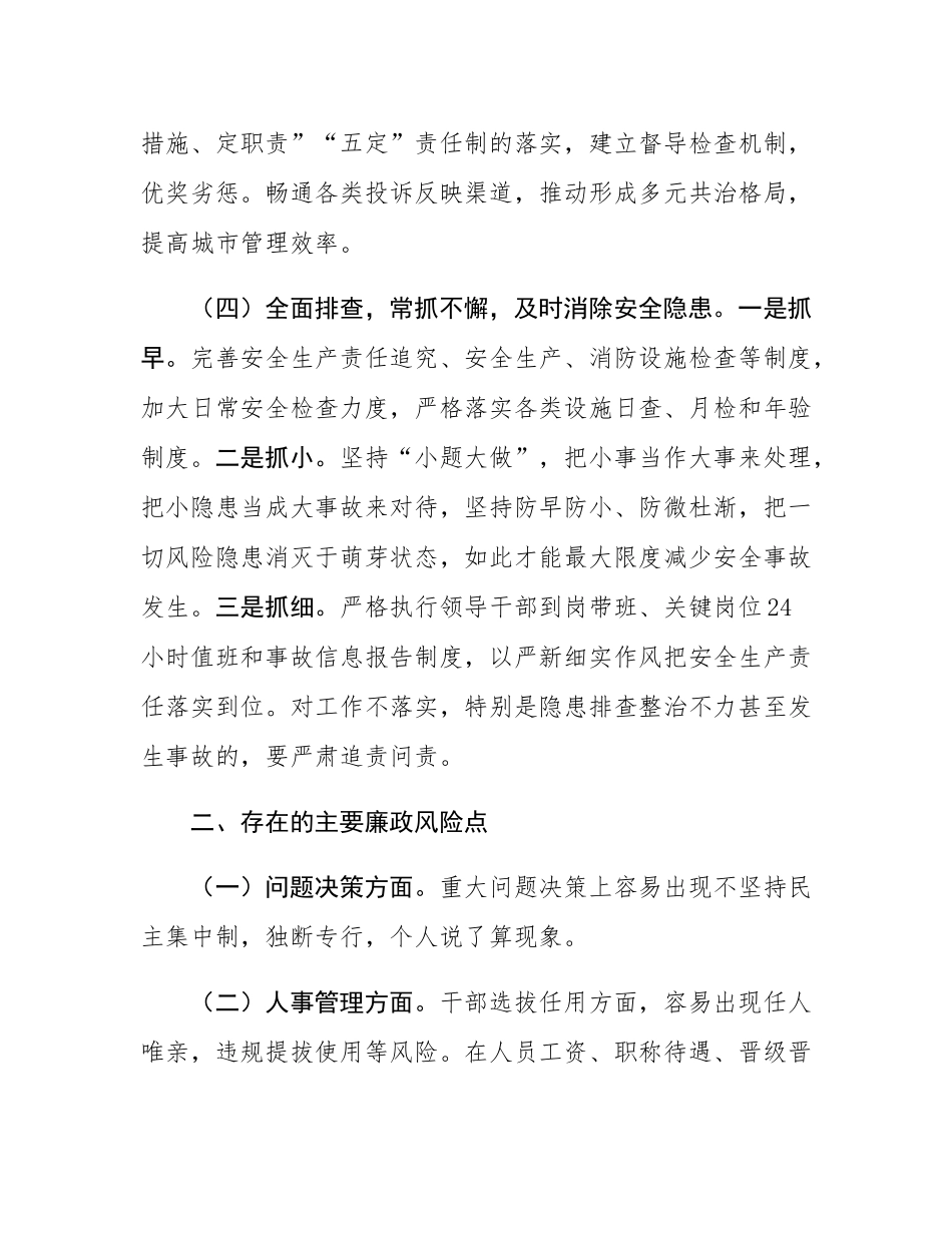 在全市以案促改警示教育大会上的表态发言各位领导、各位同事:对于市**局存在的组织弱化、制度缺失、惯性思维等问题,我们将以此为尺、以此为戒、深刻反思、查漏补缺,坚决杜绝类似错误再次发生。按照会议安排,我就贯彻落实本次会议精神,抓好“以案促改”工作作如下表态发言,不妥之处,敬请批评指正。一、今后一段时期落实“一岗双责”的具体措施(一)提高站位,主动作为,保持单位安定团结局面。一是澄清底子,化解历史遗留问题。通过核实人事、财务手续,利用准确数据支撑,耐心细致做好沟通解释,化解非访、越级上访等问题。二是正视问题,解决职工合理诉求。对职工工资不透明、人事手续办理不及时等问题进行系统核查,及时为职工办理晋级晋档、退休和技术岗位聘用手续,解决历史遗留问题。(二)建章立制,树立正气,营造干事创业良好氛围。一是健全制度,完善权力运行制约机制。全面排查和完善各项规章制度,制定出台《财务报销及资金支付管理办法》《物资采购管理办法》等制度,对重大决策、工程建设、物资采购、资金使用等方面进行规范,堵塞权力运行漏洞,扎紧制度笼子。二是强化教育,筑牢拒腐防变思想防线。利用周例会、集体学习、以案促改、主题党日、专题教育培训等多种途径,全方位、深层次的教育引导干部职工,正树思想认识,筑牢思想防线。三是监督提醒,抓实党风廉政建设主体责任。坚持教育为先、预防为主原则,通过日常提醒、定期督导、半年述职、廉政约谈等方式,对发现的倾向性、苗头性问题,及时进行提醒约谈,抓细抓常抓长,让红脸咬耳扯袖成为常态。四是健全组织,建强基层支部战斗堡垒。强化支部组织建设,配齐配强组织力量,夯实基层党组织建设基础,增强党支部的组织力、战斗力和凝聚力。(三)强化管理,转变作风,提升市容环境秩序。一是精细管理。按照“有目标、有责任、有标准、有考核”的“四有”要求,细化、量化城市管理工作,强力推进精细化管理。二是严格管理。大力开展城市管理“七进”活动,出重拳开展整治,彻底解决影响城市形象的顽疾。三是长效管理。坚持“提前半小时工作法”,推行“定片区、定人员、定时间、定措施、定职责”“五定”责任制的落实,建立督导检查机制,优奖劣惩。畅通各类投诉反映渠道,推动形成多元共治格局,提高城市管理效率。(四)全面排查,常抓不懈,及时消除安全隐患。一是抓早。完善安全生产责任追究、安全生产、消防设施检查等制度,加大日常安全检查力度,严格落实各类设施日查、月检和年验制度。二是抓小。坚持“小题大做”,把小事当作大事来处理,把小隐患当成大事故来对待,坚持防早防小、防微杜渐,把一切风险隐患消灭于萌芽状态,如此才能最大限度减少安全事故发生。三是抓细。严格执行领导干部到岗带班、关键岗位24小时值班和事故信息报告制度,以严新细实作风把安全生产责任落实到位。对工作不落实,特别是隐患排查整治不力甚至发生事故的,要严肃追责问责。二、存在的主要廉政风险点(一)问题决策方面。重大问题决策上容易出现不坚持民主集中制,独断专行,个人说了算现象。(二)人事管理方面。干部选拔任用方面,容易出现任人唯亲,违规提拔使用等风险。在人员工资、职称待遇、晋级晋档上,可能出现利用职权“吃拿卡要”、设置障碍,延长办理时间,谋求私利等风险。(三)财务管理方面。财务报销管理上可能存在虚报多报、票据凭证不规范等风险。在资金、资产的管理使用上,可能出现管理不严、经费超支、资产流失等情况。(四)工程建设方面。可能存在不按规范程序实施,暗箱操作,多计多算、少计卡要,借机谋利等风险。(五)物资采购方面。可能存在提前泄露采购信息,私自操作,高价低质,获取回扣等风险。三、拟采取的主要防控措施(一)健全制度,强化事前防范。严格落实民主集中制和“三重一大”议事制度,民主决策、科学决策。修订完善财务管理、物资采购、工程建设、人事管理等涉及人财物事项的制度,规范权力运行,扎紧制度笼子。建立健全事前防范机制,实行物资采购事前审批制度,明确任务、严格标准、夯实责任,坚持用制度约束人、管理财、推动事。(二)规范程序,强化事中监管。对...