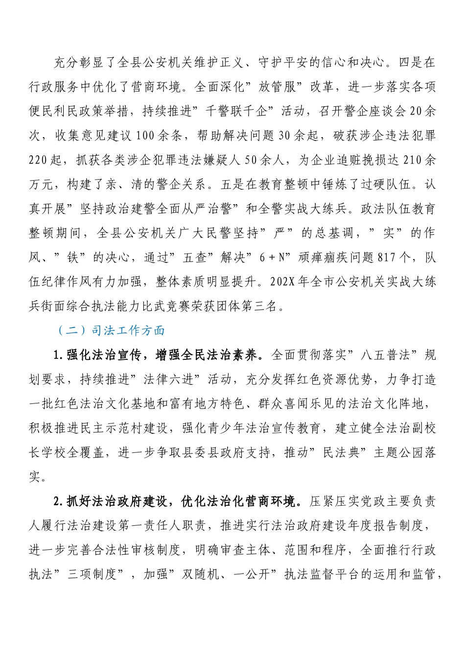 公安局局长在“今年工作怎么看、明年工作怎么干”大会上的发言提纲根据会议安排,下面我就202X年分管工作情况作个汇报。一、202X年工作情况(一)公安工作方面今年以来,全县公安机关在县委、县政府和市公安局的正确领导下,围绕中心、服务大局,勇于担当、锐意进取,圆满完成了一项项急难险重的任务。一是在连轴安保中维护了政治稳定。强化情报信息搜集和各类重点人管控,上报各类情报信息1207条,圆满完成建党一百周年、党的十九届X中X会、省十五次党代会等系列重大活动安保维稳工作,人力情报员建设被省厅采用,工作模式将在全省情报系统推广,圆满实现了”五个严防、三个确保”的工作目标。我局建党100周年安保维稳工作荣立全省公安机关集体二等功。二是在整体防控中确保了社会安定。科学有序推动”雪亮工程”二期1562个点位和28个智慧安防小区建设,启用警务工作站,高标准推动环昌检测站建设,进一步织密了社会治安防控体系。全县刑事发案、治安案件和影响民生的多发性侵财案件基本实现发案下降、破案上升,侵财案件破现案率达60.8%,命案零发生,202X年全县公安机关满意度大幅度上升,位列全市第3位,平安的建设质量更高、成色更足。三是在打击犯罪中彰显了公平正义。持续保持对各项违法犯罪的高压态势,深入开展六大重点行业领域整治,严厉打击群众反映强烈的”盗抢骗”、”黄赌毒”、”食药环”等各类违法犯罪活动。202X年全县处理有效警情18002起,破获刑事案件397起,查处行政案件20xx起,刑事拘留321人,治安拘留537人,追逃193人,取保候审293人,逮捕181人,移送起诉478人,成功抓获潜逃19年命案逃犯1名,连续13年命案全部侦破,充分彰显了全县公安机关维护正义、守护平安的信心和决心。四是在行政服务中优化了营商环境。全面深化”放管服”改革,进一步落实各项便民利民政策举措,持续推进”千警联千企”活动,召开警企座谈会20余次,收集意见建议100余条,帮助解决问题30余起,破获涉企违法犯罪220起,抓获各类涉企犯罪违法嫌疑人50余人,为企业追赃挽损达210余万元,构建了亲、清的警企关系。五是在教育整顿中锤炼了过硬队伍。认真开展”坚持政治建警全面从严治警”和全警实战大练兵。政法队伍教育整顿期间,全县公安机关广大民警坚持”严”的总基调,”实”的作风、”铁”的决心,通过”五查”解决”6+N”顽瘅痼疾问题817个,队伍纪律作风有力加强,整体素质明显提升。202X年全市公安机关实战大练兵街面综合执法能力比武竞赛荣获团体第三名。(二)司法工作方面1.强化法治宣传,增强全民法治素养。全面贯彻落实”八五普法”规划要求,持续推进”法律六进”活动,充分发挥红色资源优势,力争打造一批红色法治文化基地和富有地方特色、群众喜闻乐见的法治文化阵地,积极推进民主示范村建设,强化青少年法治宣传教育,建立健全法治副校长学校全覆盖,进一步争取县委县政府支持,推动”民法典”主题公园落实。2.抓好法治政府建设,优化法治化营商环境。压紧压实党政主要负责人履行法治建设第一责任人职责,推进实行法治政府建设年度报告制度,进一步完善合法性审核制度,明确审查主体、范围和程序,全面推行行政执法”三项制度”,加强”双随机、一公开”执法监督平台的运用和监管,深入推进综合行政执法体制改革和乡镇综合行政执法改革,完善规范行政复议制度,积极发挥行政复议监督作用和化解政企争议作用,及时发现和纠正行政违法行为,确保行政机关负责人出庭应诉率达到100%。3.夯实基层基础,维护社会和谐稳定。深化司法所规范化队伍、业务、基层设施等建设及教育培训工作,进一步加强职调解员队伍建设,不断提升业务素质,筑牢维护基层稳定的第一道防线,继续加强社区矫正工作日常管理,不断完善社区矫正中心建设,探索”互联网+法治服务”,引导法律顾问通过村(社区)微信群、村(社区)广播站等形式为村民提供法治宣传服务,确保二十大时期不出现任何问题。4.提供精准法律服务,提升群众法治获得感。加大法律人才引进力度,积极引进外地律师到奉新执业,全方位对企业开展法治体检,重点在企业用工、经济合同等方面把好法律关,提供”法律良方”,化解企...